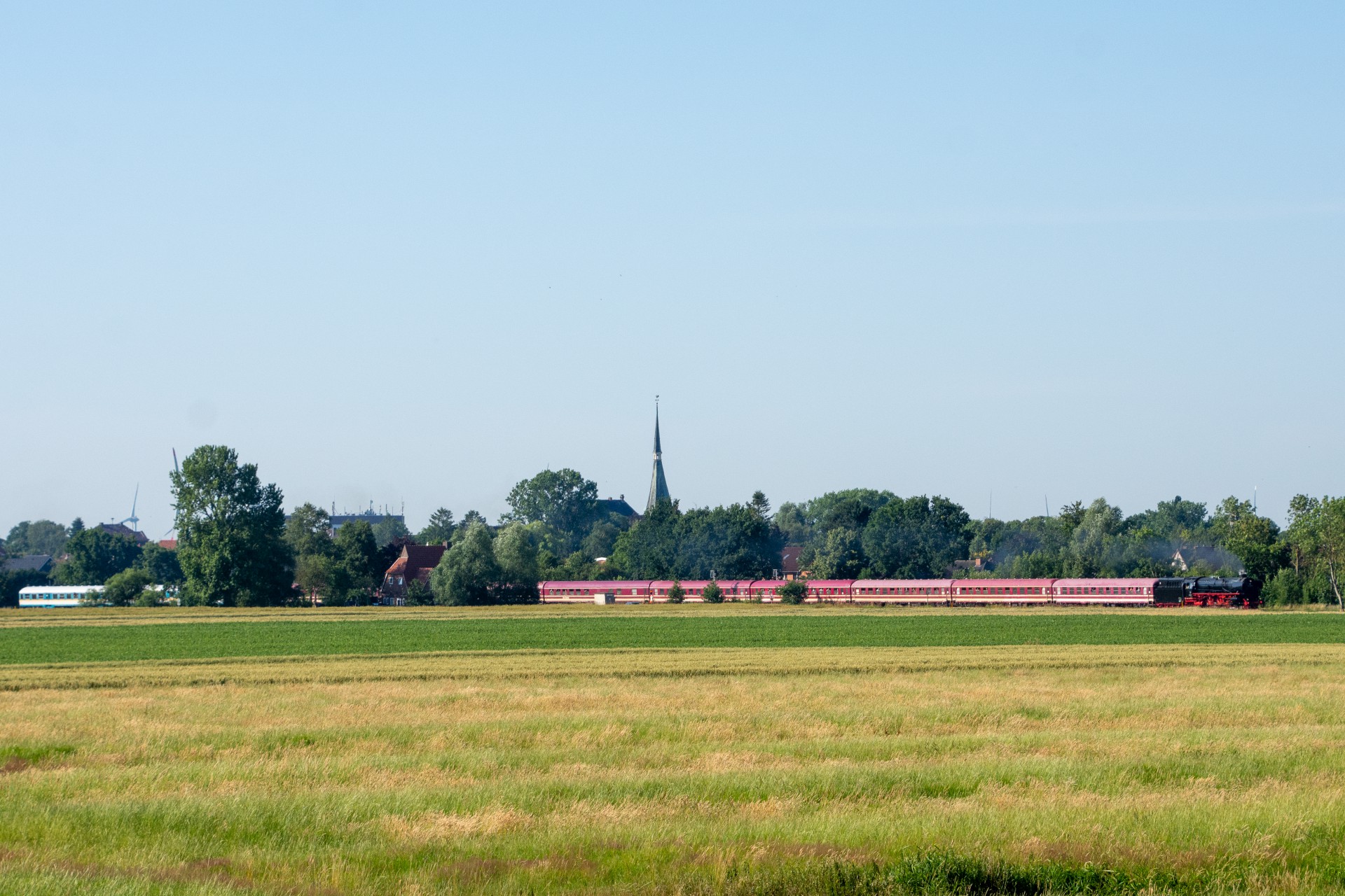 Næste planlagte sted var lidt nord for “Lunden” og med en fin kirke i baggrunden. Desværre havde jeg lidt problemer med fokus på kameraet her, så billederne kunne have været bedre. Turen gik så hurtigt videre til Hattstedt som ligger lige nord for Husum. I Husum var der et fotostop, så det gav lige nok tid til at kunne frem her til. Efter have ventet her i få minutter, passerede toget i hastig fart, og jeg kørte derfor også videre mod Niebüll/Klanxbüll.
