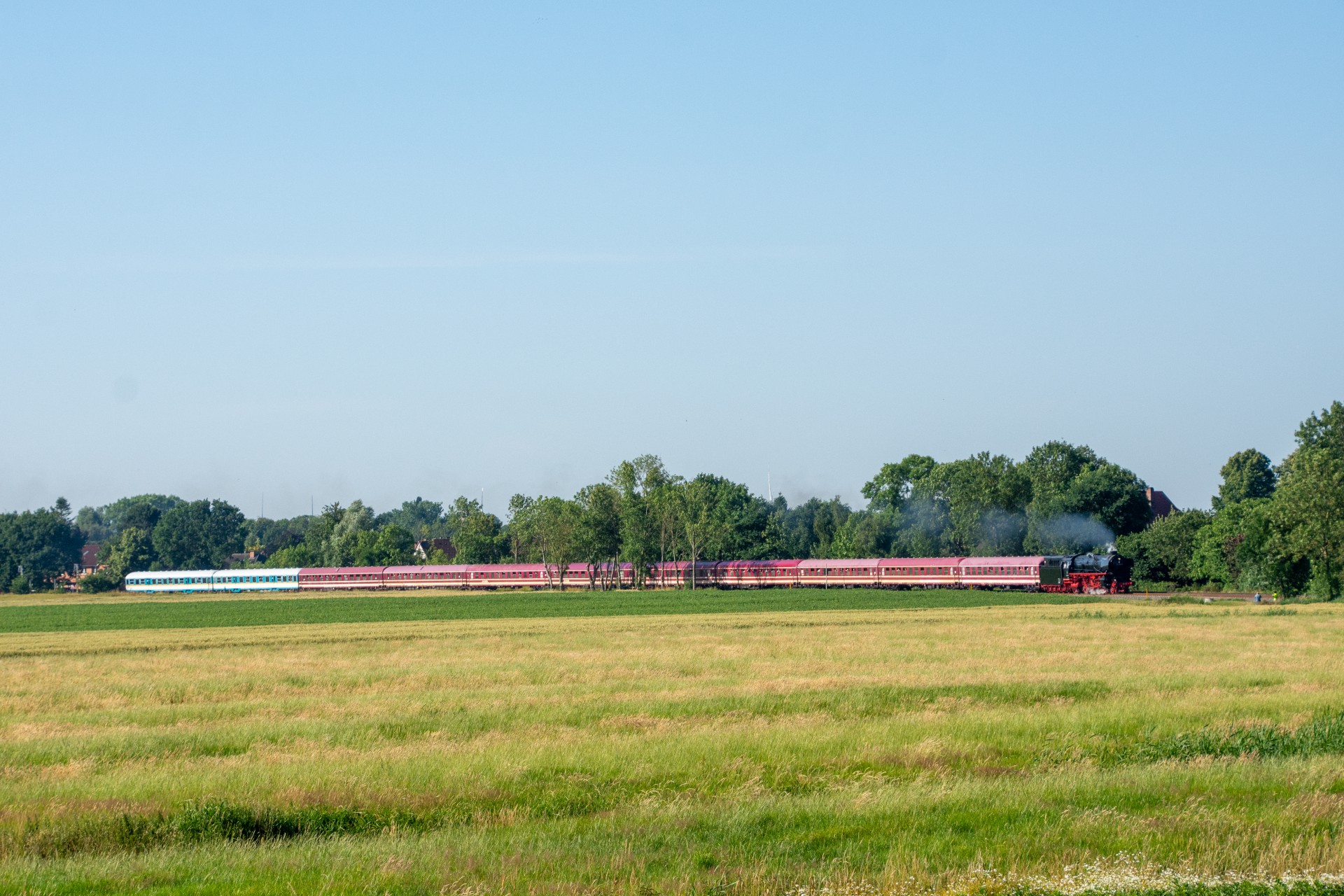 Som sagt var jeg taget meget tidlig afsted, og første sted jeg havde planlagt at se toget, var lige nord for Wilster, som ligger lidt efter Itzehoe. Jeg var fremme i god tid, og da jeg ankom var der allerede en 2-3 andre tyskere. En venlig tysker foreslog at jeg kunne stå på taget af hans autocamper, og det syntes jeg da var en god plan, så takkede ja til dette. Efter ens times vente tid, hvor der imens var kommet en hel del flere folk til, kom 01 1104 så endelig forbi med de 11 vogne på krogen. Det blev til et par fine billeder af toget i den flotte morgen sol.