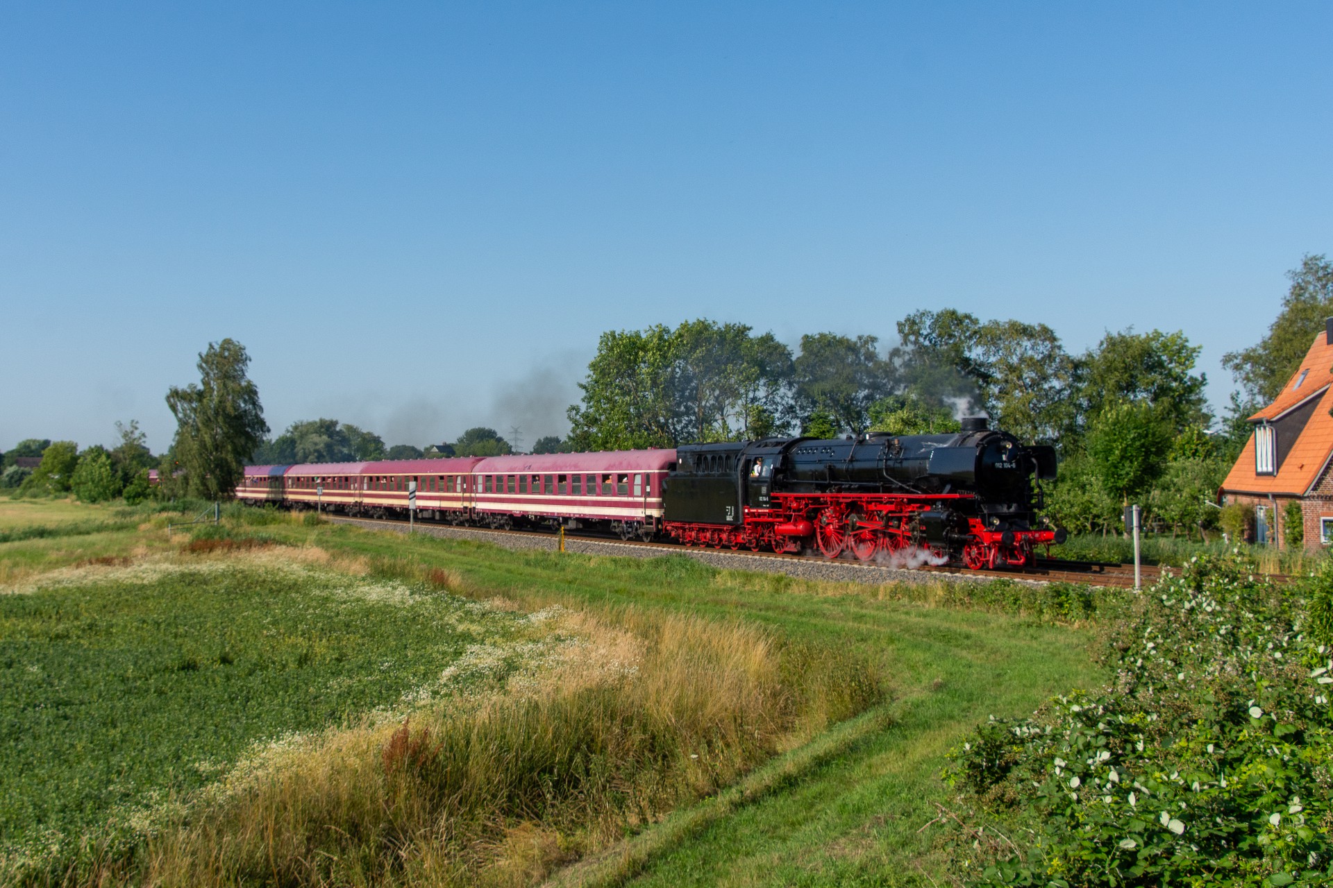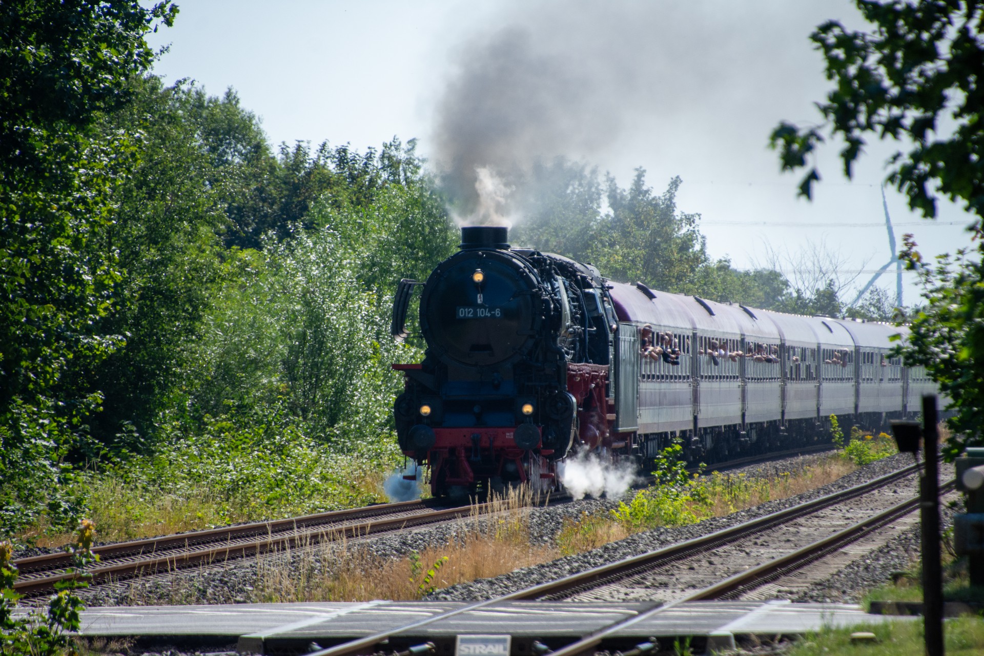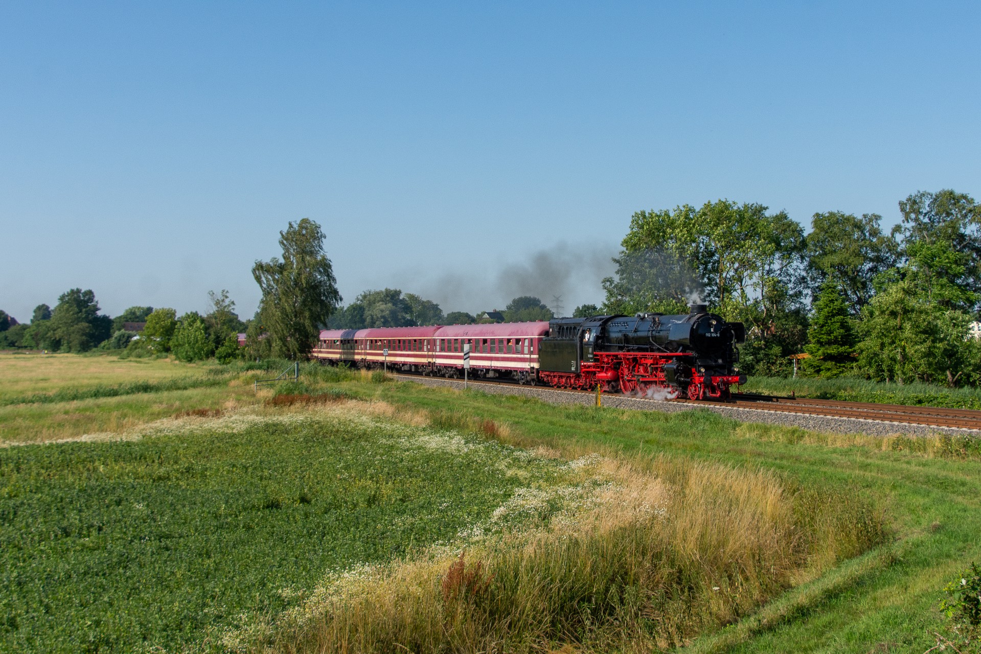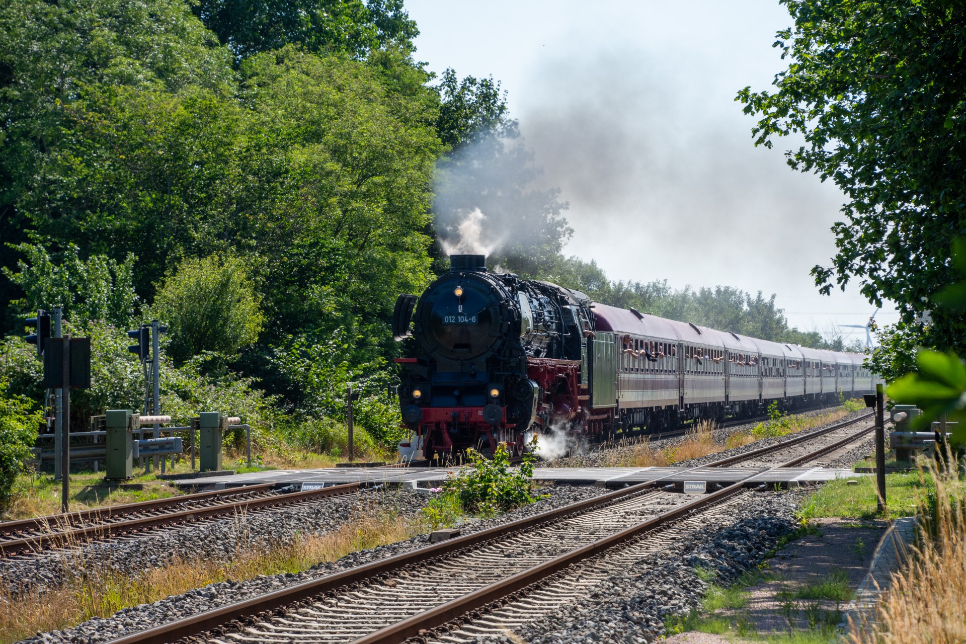 Lørdag den 8. juli var jeg igen stået tidligt op, og havde sat kursen mod Tyskland. Her skulle der nemlig i dag køres fra Hamborg-Altona til Westerland på Sylt med damplokomotivet 012 104-5 (01 1104). Den er den sidste af DB´s ekspress damplokomotiver i 01.10 serien. Lokomotivet er bygget tilbage i 1940, og efter 34 års drift blev det så taget ud af driften i 1975 og stod ved Rheine depotet i Emsland. Kort tid efter blev det købt af en engelsk jernbane interesseret doktor, og det blev flyttet til det nordlige England ved “Steamtown Carnforth” jernbanemuseet. Her stod det så i over 20 år. I 1996 blev lokomotivet så transporteret tilbage til det sydlige Tyskland, først til Bayerisches Eisenbahnmuseum, hvor den var i 5 år, og derefter til Süddeutsches Eisenbahnmuseum Heilbronn. I 2009 begyndte gruppen “Fascination Steam” at arbejdet på projektet med at sætte lokomotivet tilbage i drift. I Juni 2023 nåede gruppen så i mål med arbejdet, og kunne om aften den 8. juni køre de første få meter, derefter en test kørsel den 9. juni, og så den første offentlig særkørsel 10. juni.