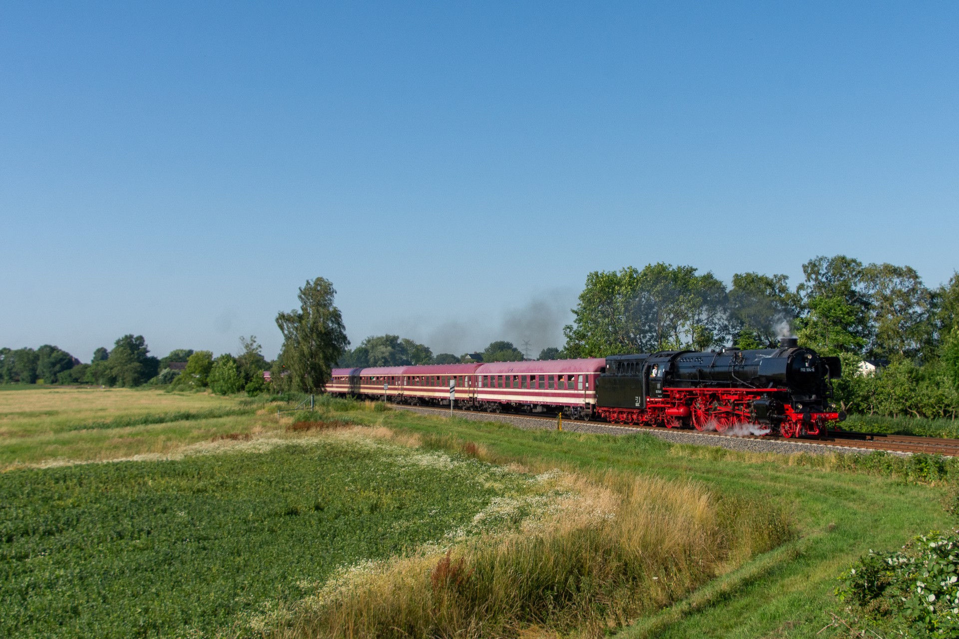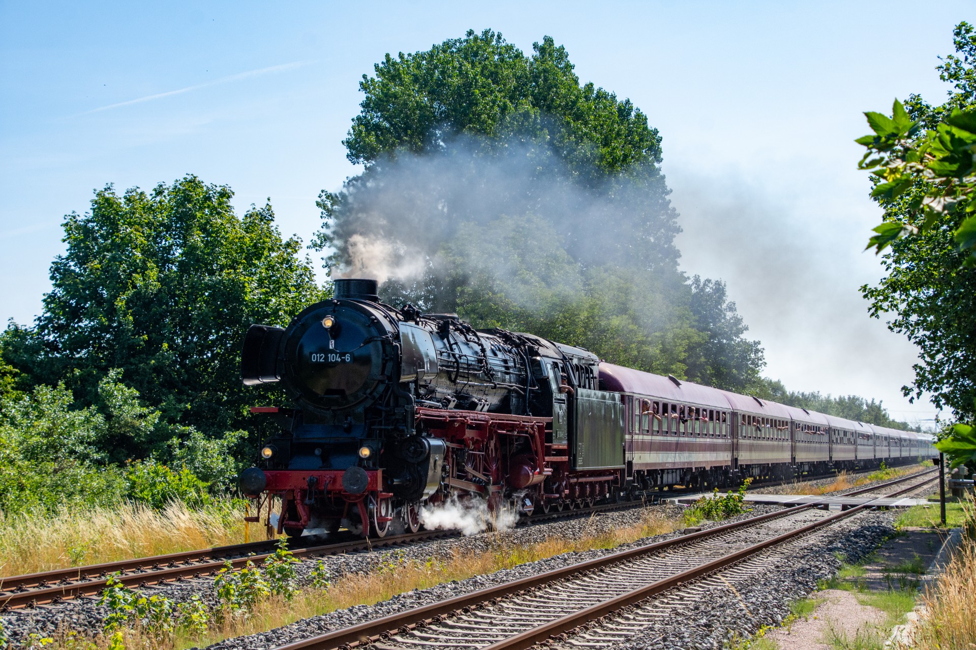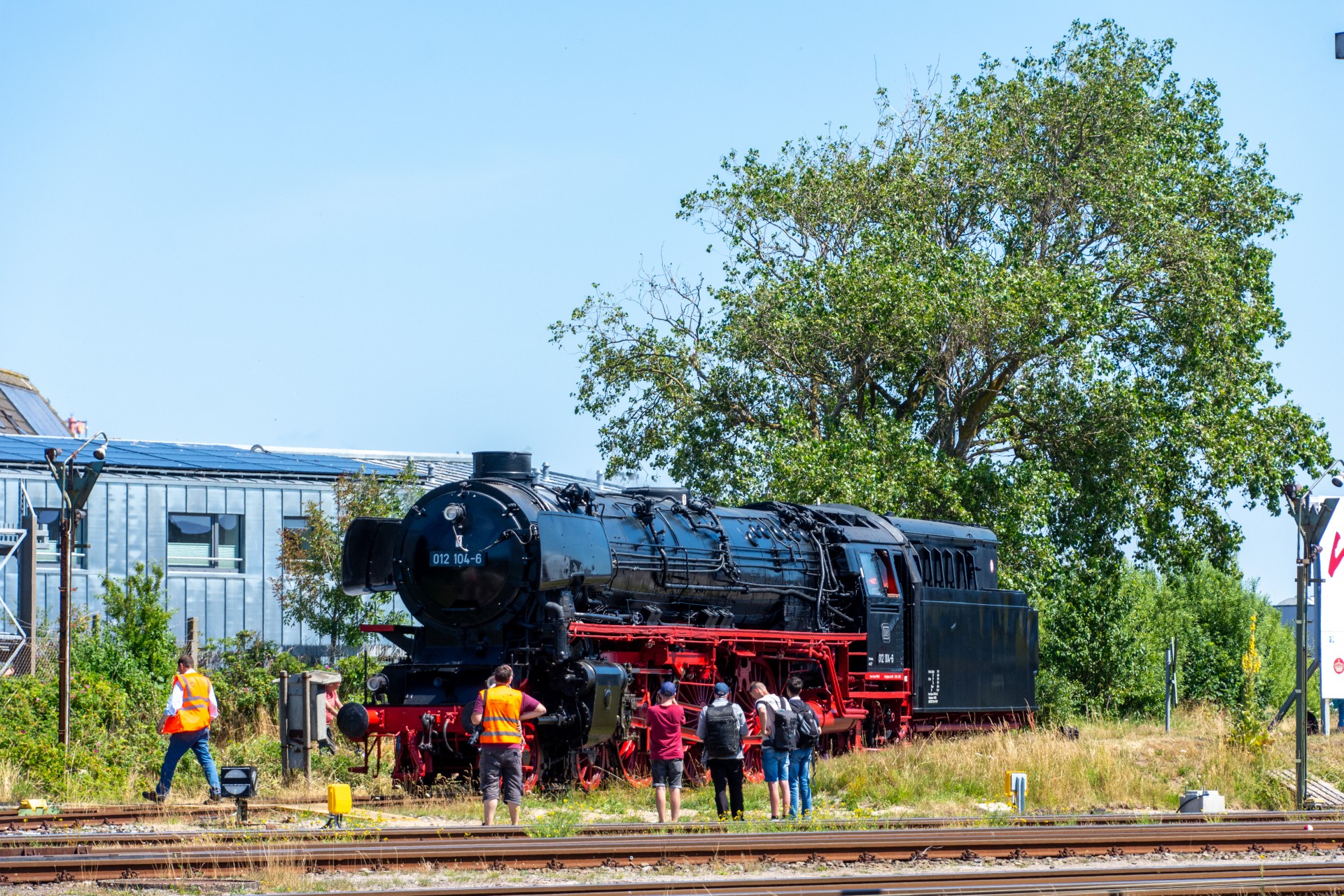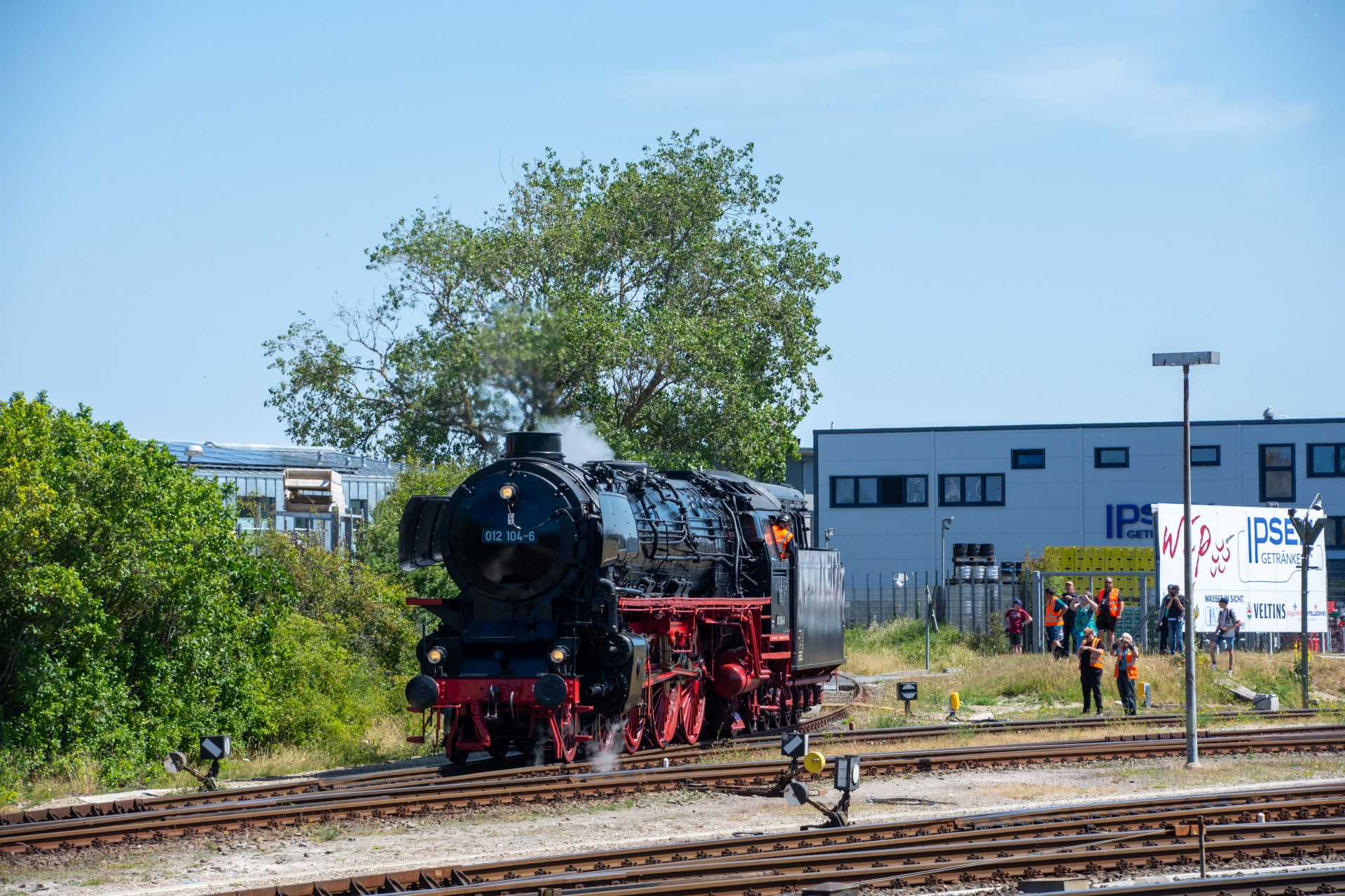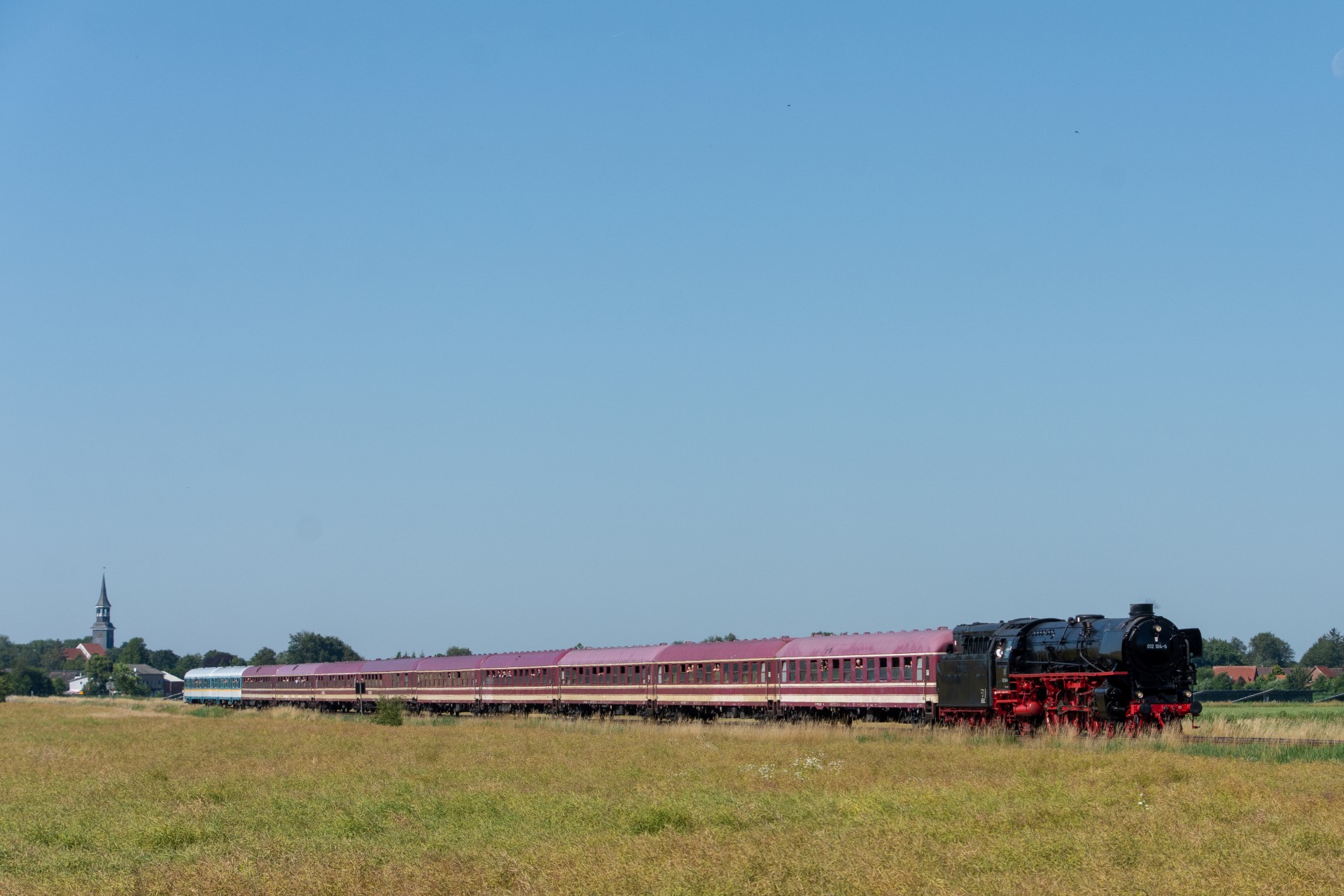 Lørdag den 8. juli var jeg igen stået tidligt op, og havde sat kursen mod Tyskland. Her skulle der nemlig i dag køres fra Hamborg-Altona til Westerland på Sylt med damplokomotivet 012 104-5 (01 1104). Den er den sidste af DB´s ekspress damplokomotiver i 01.10 serien. Lokomotivet er bygget tilbage i 1940, og efter 34 års drift blev det så taget ud af driften i 1975 og stod ved Rheine depotet i Emsland. Kort tid efter blev det købt af en engelsk jernbane interesseret doktor, og det blev flyttet til det nordlige England ved “Steamtown Carnforth” jernbanemuseet. Her stod det så i over 20 år. I 1996 blev lokomotivet så transporteret tilbage til det sydlige Tyskland, først til Bayerisches Eisenbahnmuseum, hvor den var i 5 år, og derefter til Süddeutsches Eisenbahnmuseum Heilbronn. I 2009 begyndte gruppen “Fascination Steam” at arbejdet på projektet med at sætte lokomotivet tilbage i drift. I Juni 2023 nåede gruppen så i mål med arbejdet, og kunne om aften den 8. juni køre de første få meter, derefter en test kørsel den 9. juni, og så den første offentlig særkørsel 10. juni.