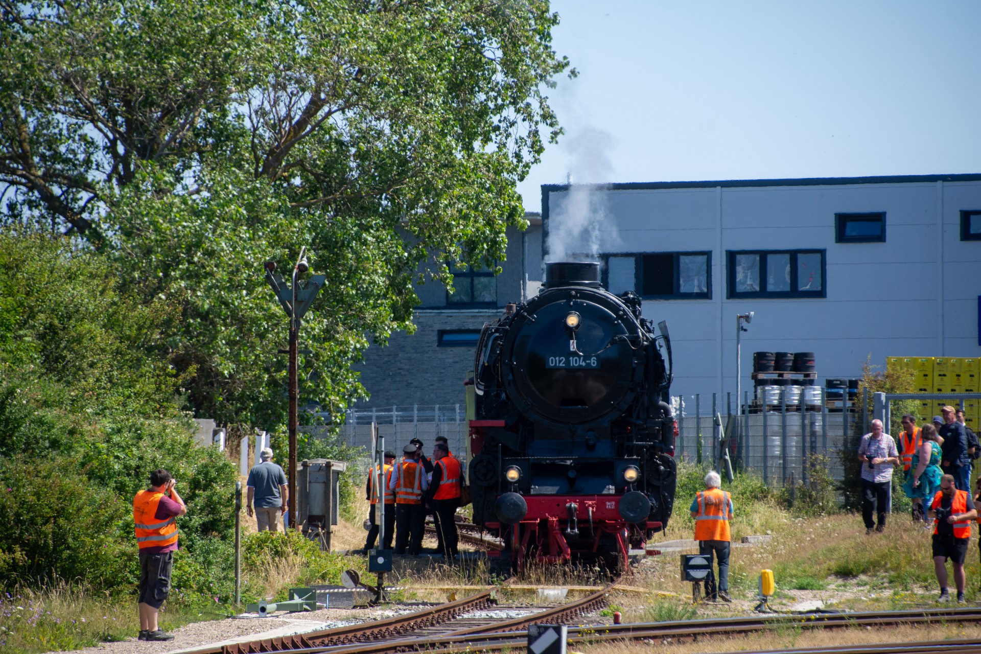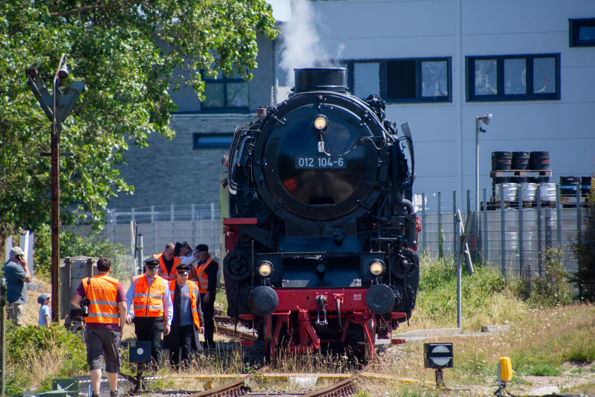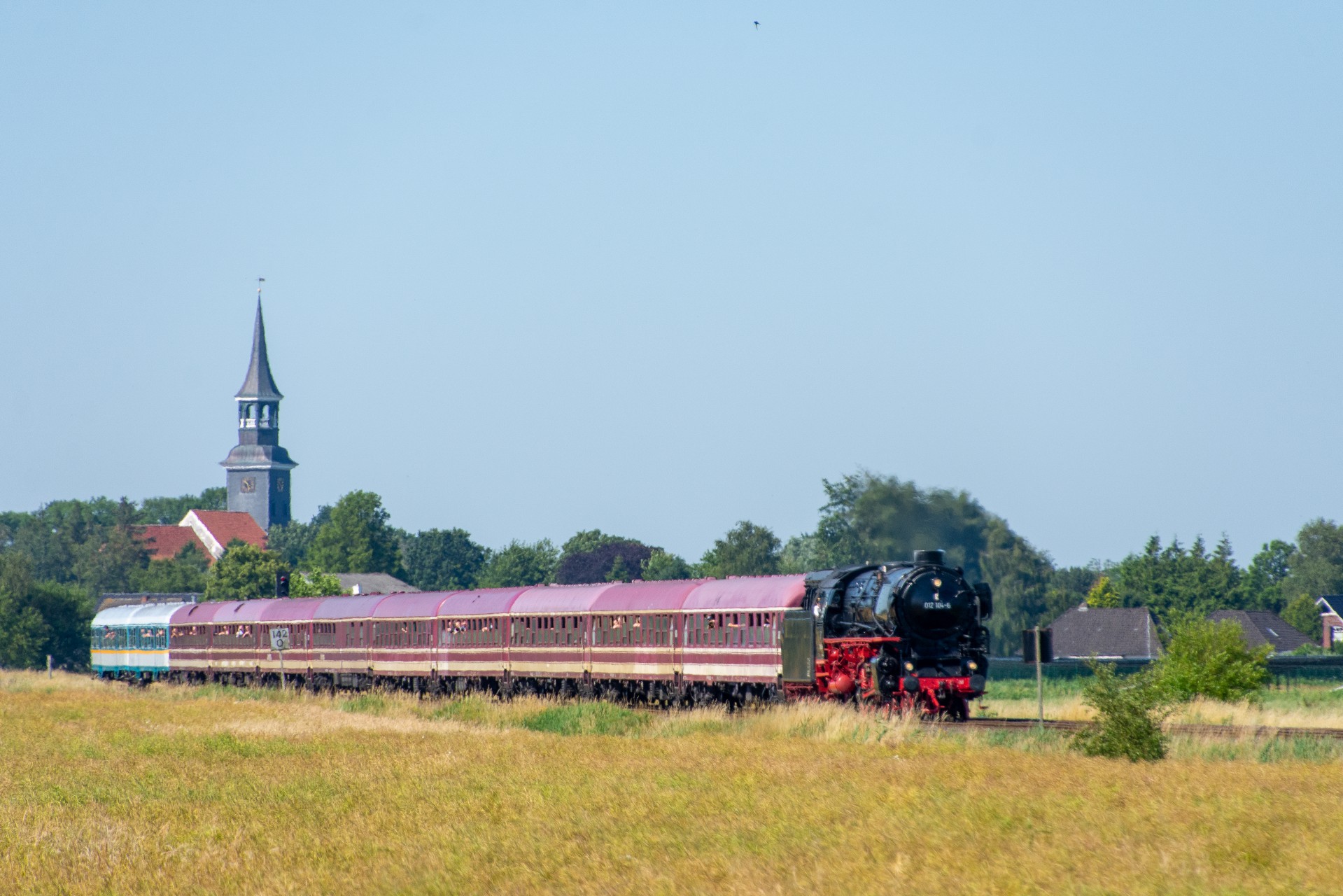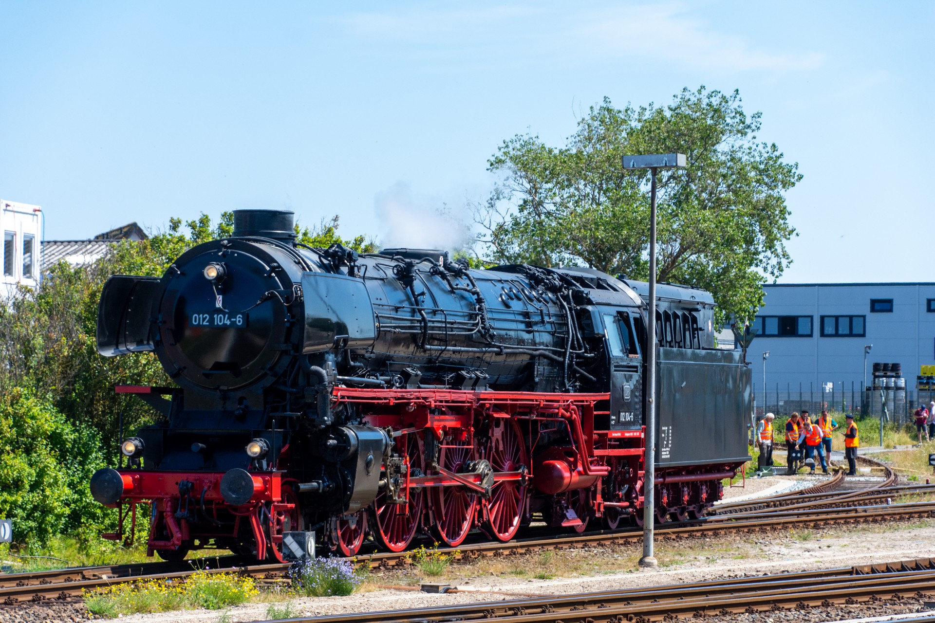Lørdag den 8. juli var jeg igen stået tidligt op, og havde sat kursen mod Tyskland. Her skulle der nemlig i dag køres fra Hamborg-Altona til Westerland på Sylt med damplokomotivet 012 104-5 (01 1104). Den er den sidste af DB´s ekspress damplokomotiver i 01.10 serien. Lokomotivet er bygget tilbage i 1940, og efter 34 års drift blev det så taget ud af driften i 1975 og stod ved Rheine depotet i Emsland. Kort tid efter blev det købt af en engelsk jernbane interesseret doktor, og det blev flyttet til det nordlige England ved “Steamtown Carnforth” jernbanemuseet. Her stod det så i over 20 år. I 1996 blev lokomotivet så transporteret tilbage til det sydlige Tyskland, først til Bayerisches Eisenbahnmuseum, hvor den var i 5 år, og derefter til Süddeutsches Eisenbahnmuseum Heilbronn. I 2009 begyndte gruppen “Fascination Steam” at arbejdet på projektet med at sætte lokomotivet tilbage i drift. I Juni 2023 nåede gruppen så i mål med arbejdet, og kunne om aften den 8. juni køre de første få meter, derefter en test kørsel den 9. juni, og så den første offentlig særkørsel 10. juni.