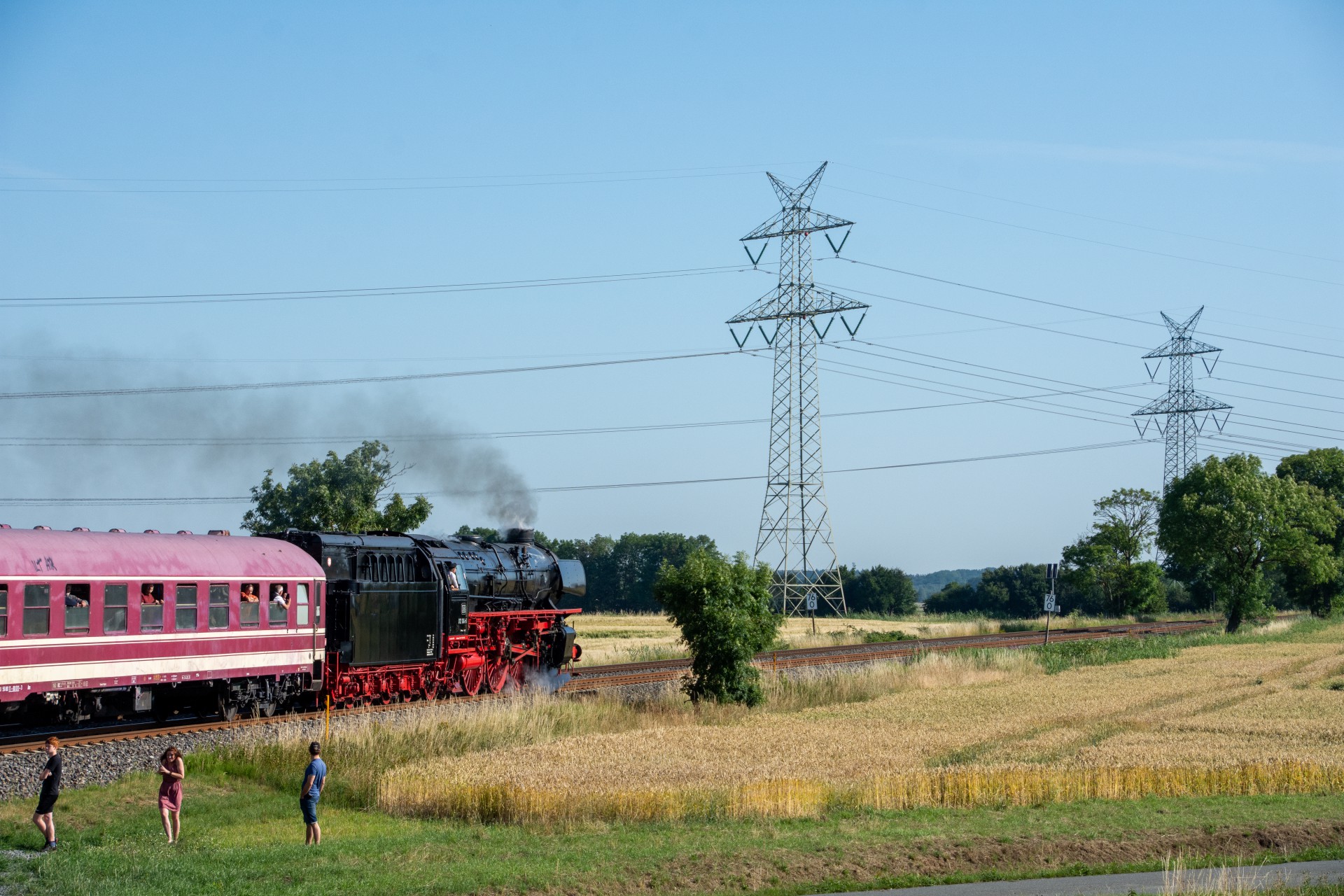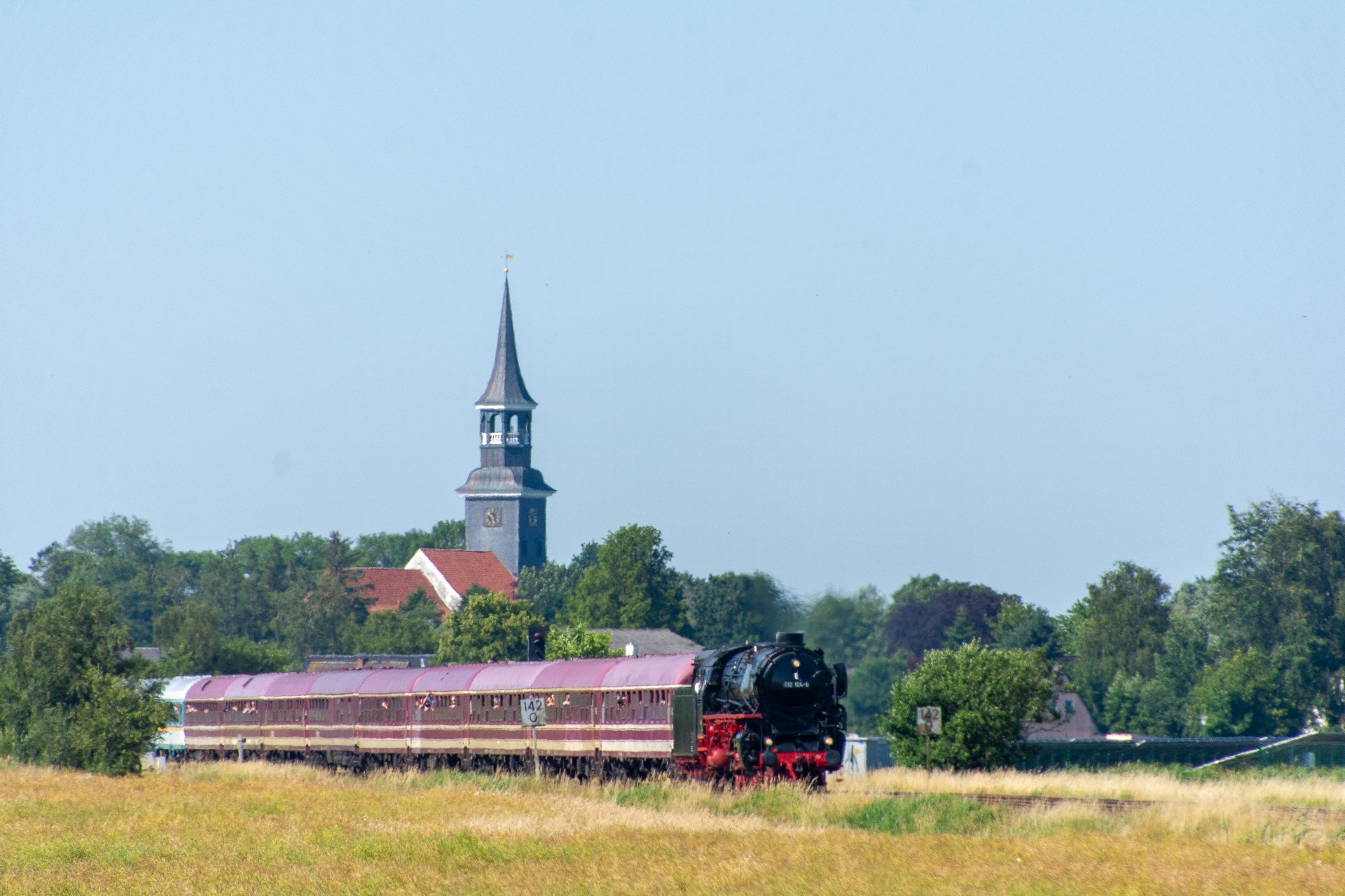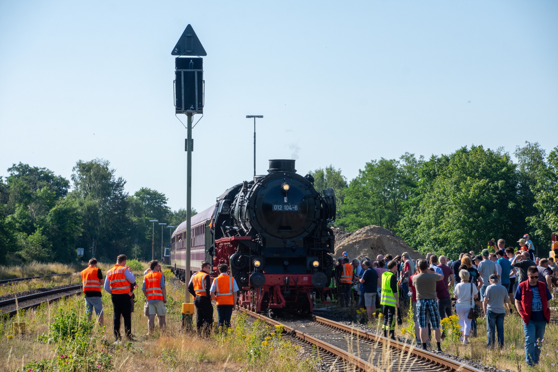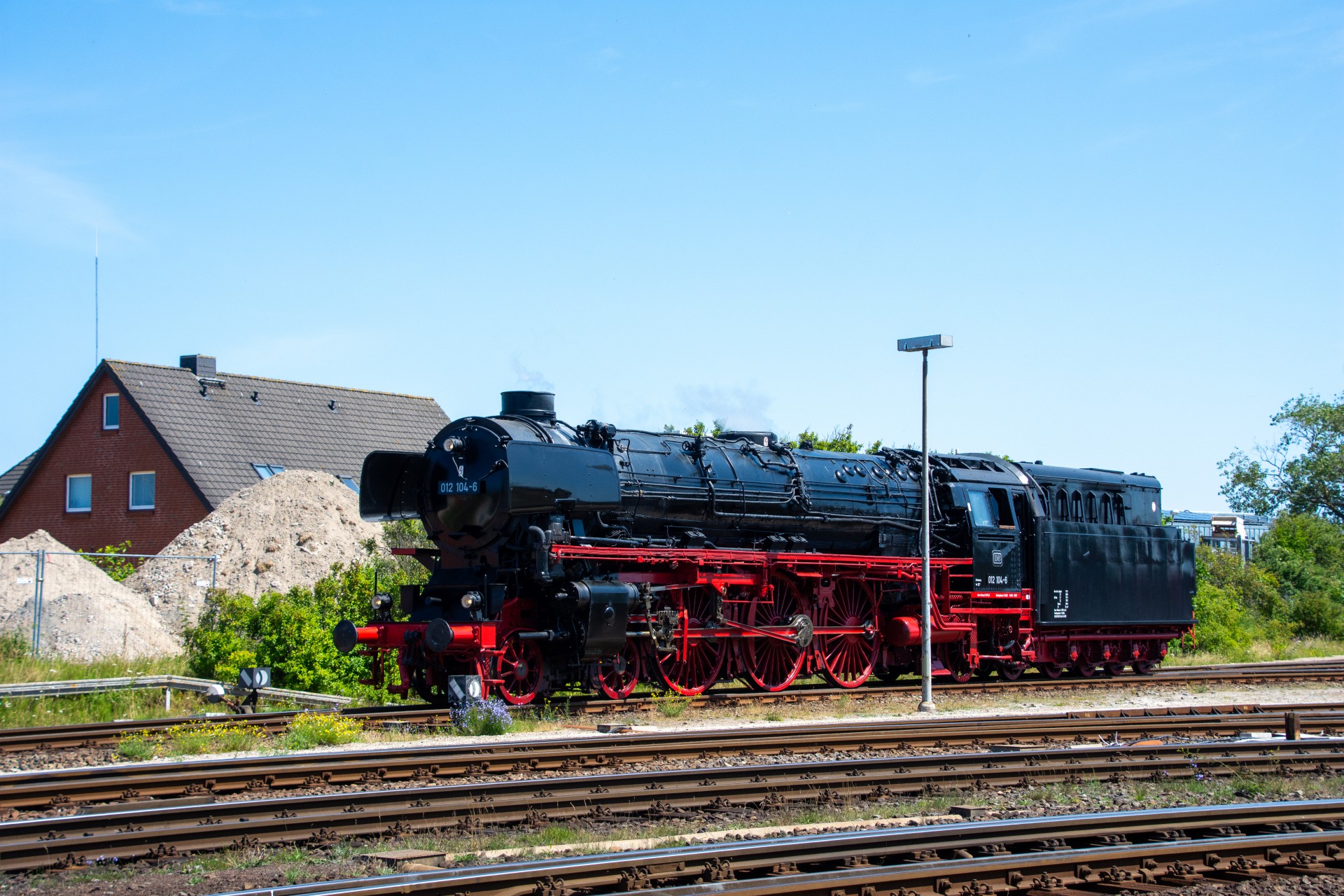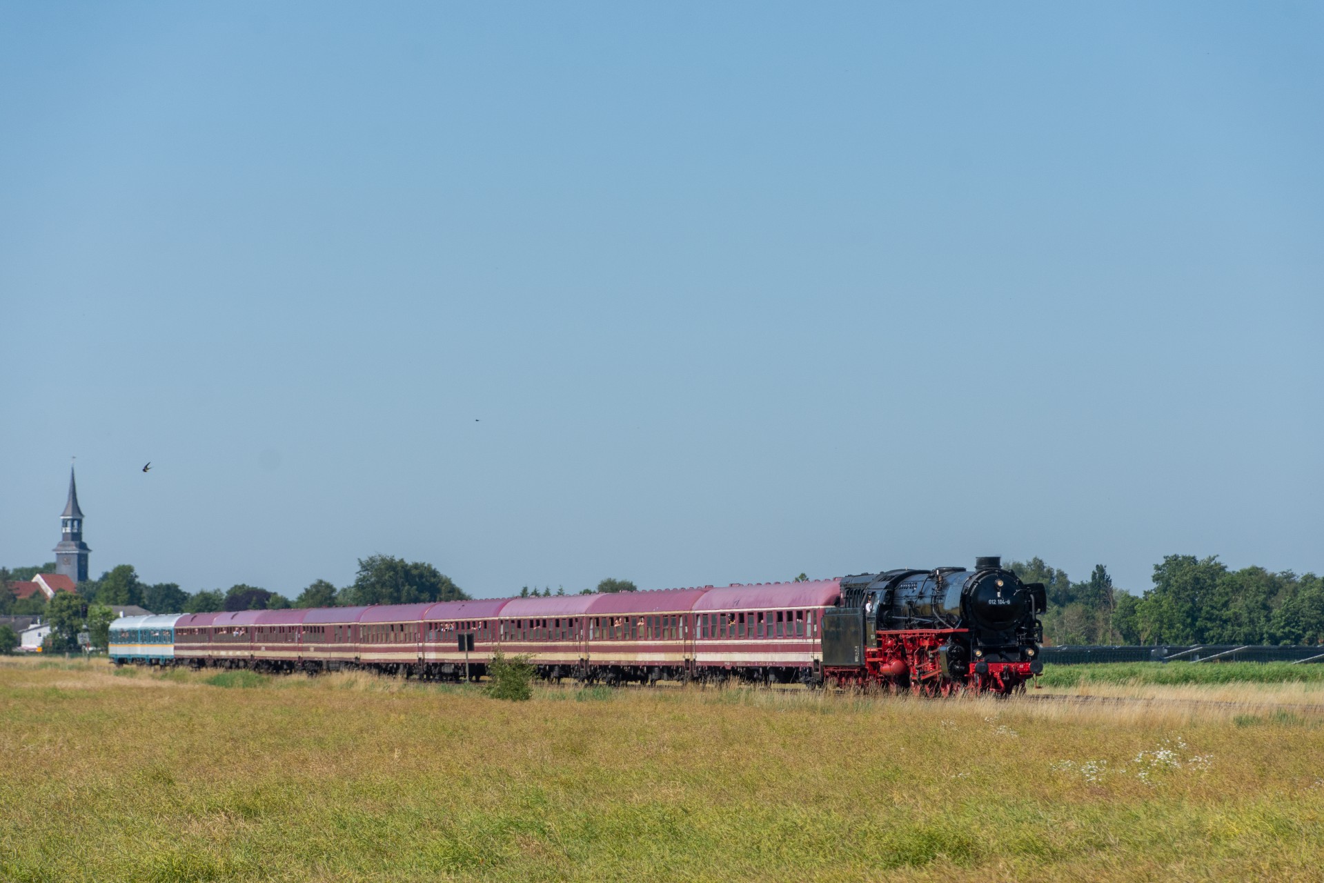 Lørdag den 8. juli var jeg igen stået tidligt op, og havde sat kursen mod Tyskland. Her skulle der nemlig i dag køres fra Hamborg-Altona til Westerland på Sylt med damplokomotivet 012 104-5 (01 1104). Den er den sidste af DB´s ekspress damplokomotiver i 01.10 serien. Lokomotivet er bygget tilbage i 1940, og efter 34 års drift blev det så taget ud af driften i 1975 og stod ved Rheine depotet i Emsland. Kort tid efter blev det købt af en engelsk jernbane interesseret doktor, og det blev flyttet til det nordlige England ved “Steamtown Carnforth” jernbanemuseet. Her stod det så i over 20 år. I 1996 blev lokomotivet så transporteret tilbage til det sydlige Tyskland, først til Bayerisches Eisenbahnmuseum, hvor den var i 5 år, og derefter til Süddeutsches Eisenbahnmuseum Heilbronn. I 2009 begyndte gruppen “Fascination Steam” at arbejdet på projektet med at sætte lokomotivet tilbage i drift. I Juni 2023 nåede gruppen så i mål med arbejdet, og kunne om aften den 8. juni køre de første få meter, derefter en test kørsel den 9. juni, og så den første offentlig særkørsel 10. juni.