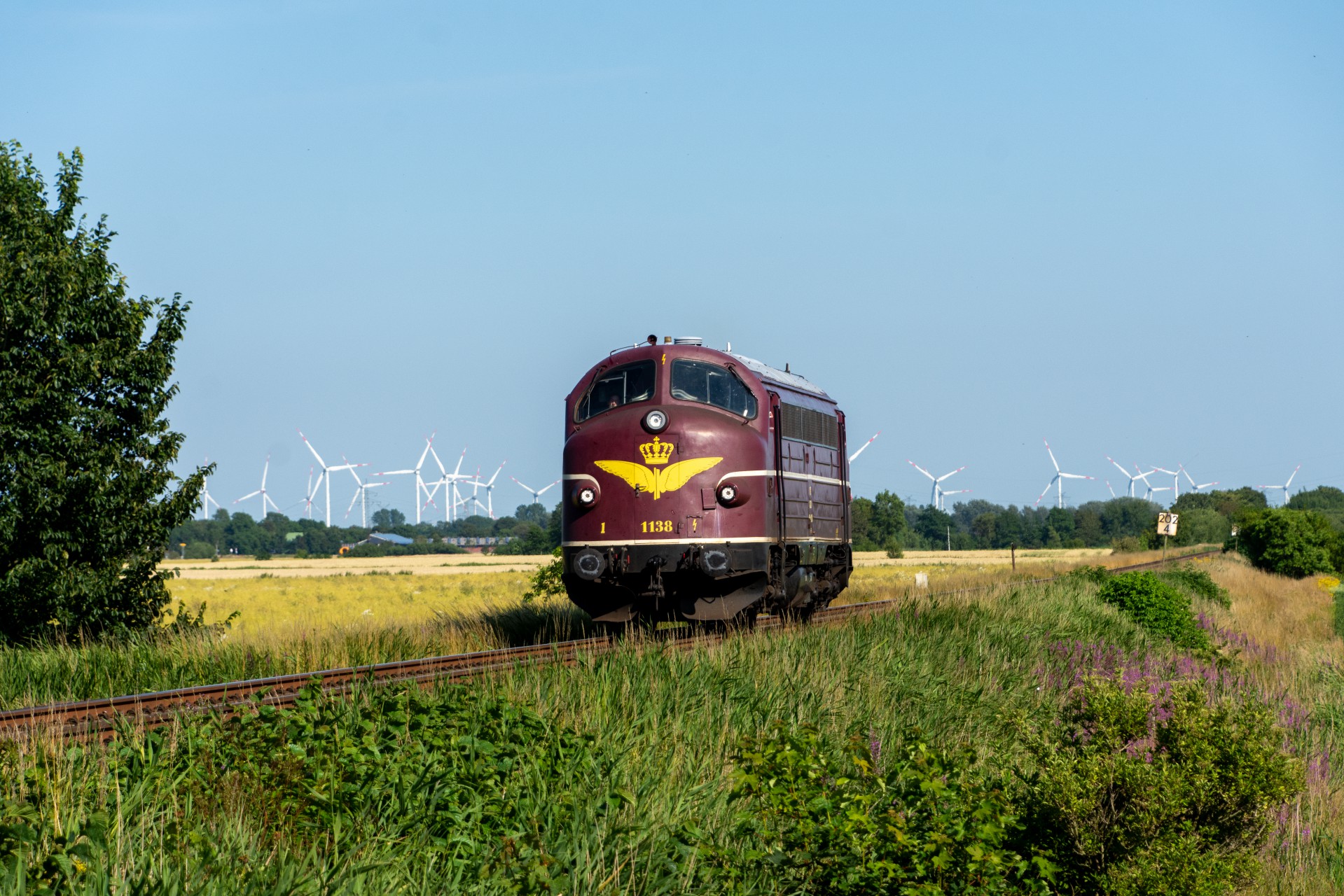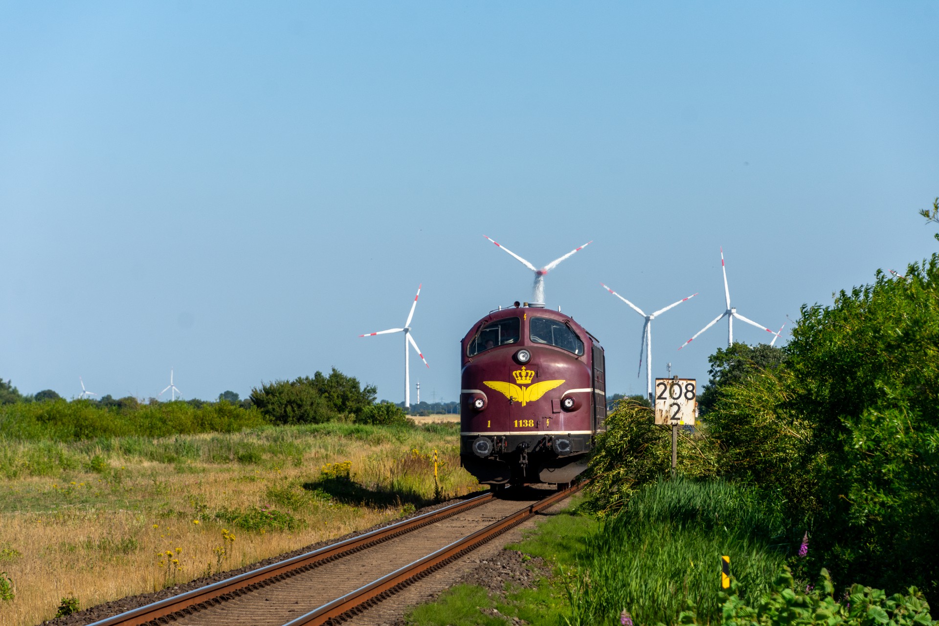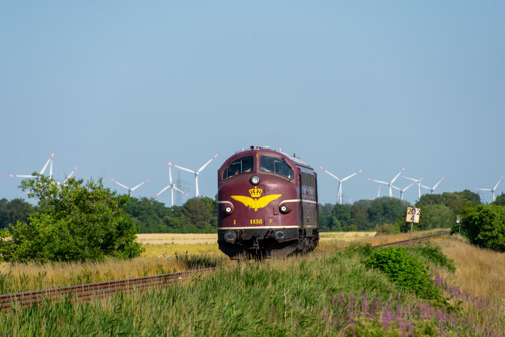 Efter et par timer på Sylt, tog jeg regionaltoget retur mod fastlandet, og kørte ud på strækningen mellem Niebüll og Klanxbüll. Her afventede jeg så at MY 1138 skulle komme forbi mod Westerland. Da der ikke længere er en funktionsdygtig drejeskive på Westerland, kan 01 1104 derfor ikke vendes, og må kun køre 50 km/t på grund af det begrænset udsyn, når lokomotivet ikke er retvendt. Derfor var det planlagt at MY 1138 skulle køre kørslen retur fra Westerland til Hamborg-Altona. MY 1138 høre til tyske firma CLR Cargo Logistik Rail-Service, og køre forskellige gods/sporombygnings tog.