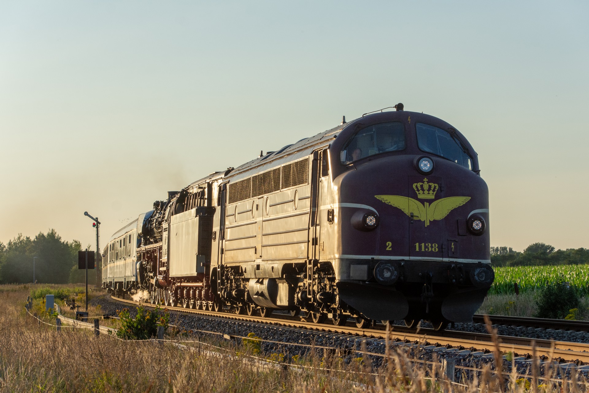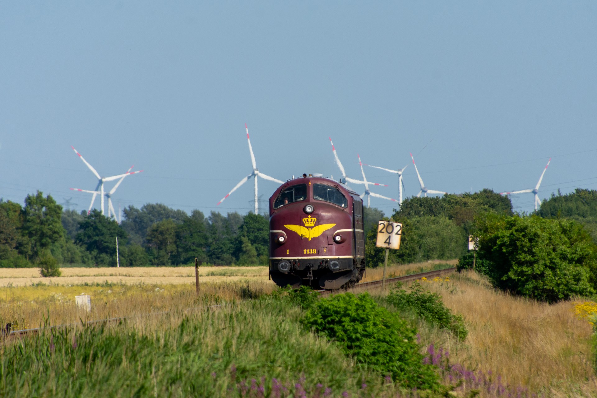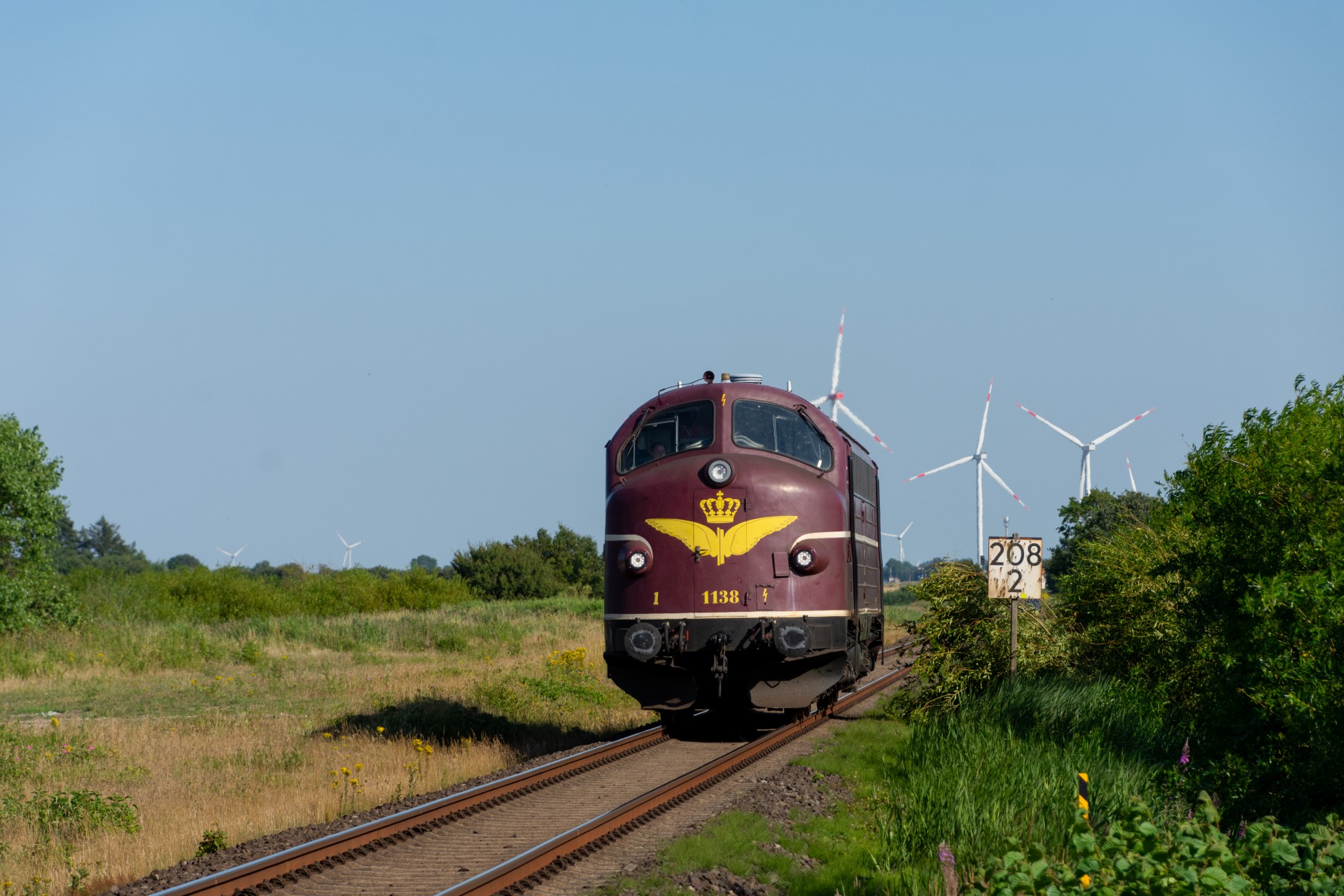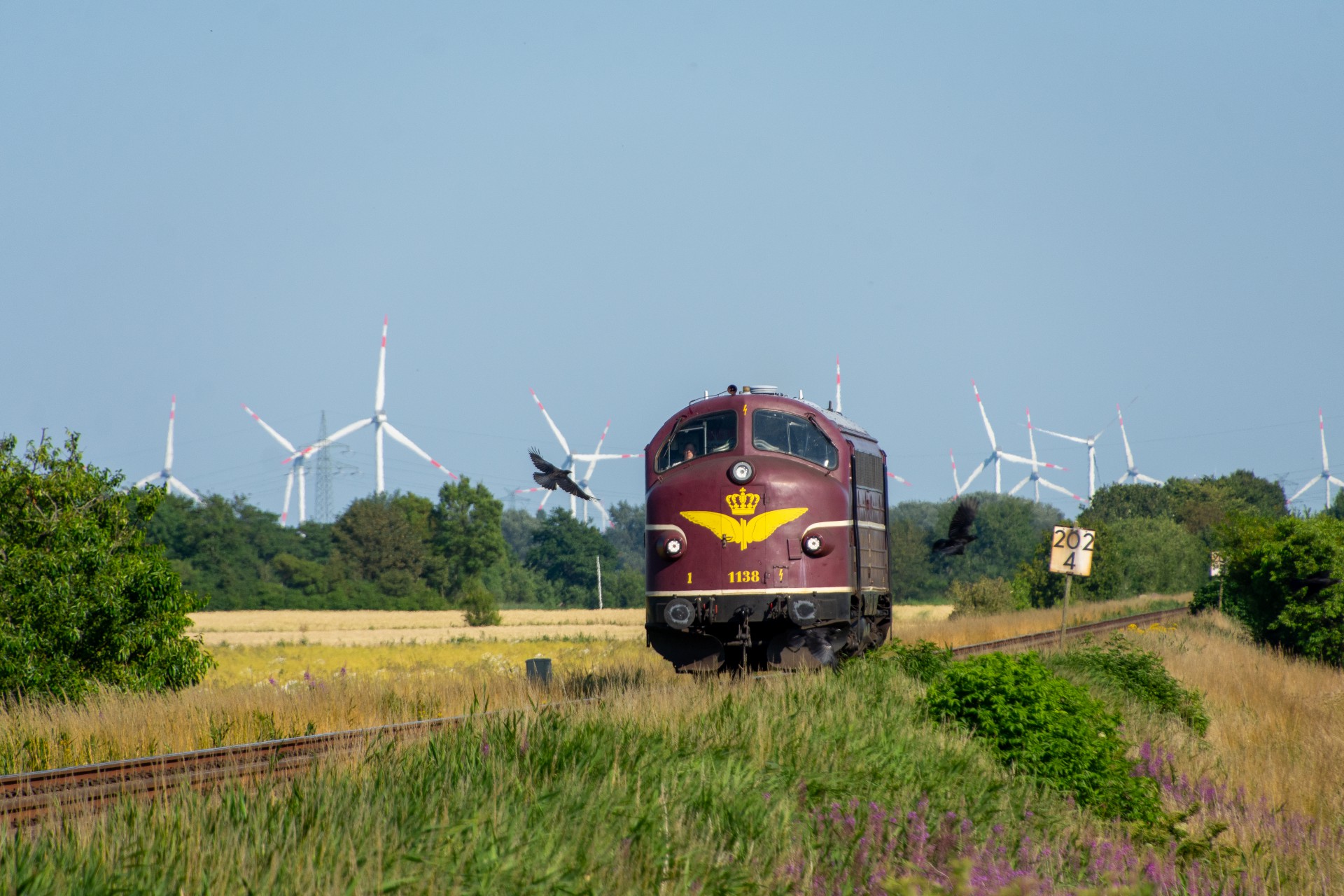 Efter et par timer på Sylt, tog jeg regionaltoget retur mod fastlandet, og kørte ud på strækningen mellem Niebüll og Klanxbüll. Her afventede jeg så at MY 1138 skulle komme forbi mod Westerland. Da der ikke længere er en funktionsdygtig drejeskive på Westerland, kan 01 1104 derfor ikke vendes, og må kun køre 50 km/t på grund af det begrænset udsyn, når lokomotivet ikke er retvendt. Derfor var det planlagt at MY 1138 skulle køre kørslen retur fra Westerland til Hamborg-Altona. MY 1138 høre til tyske firma CLR Cargo Logistik Rail-Service, og køre forskellige gods/sporombygnings tog.