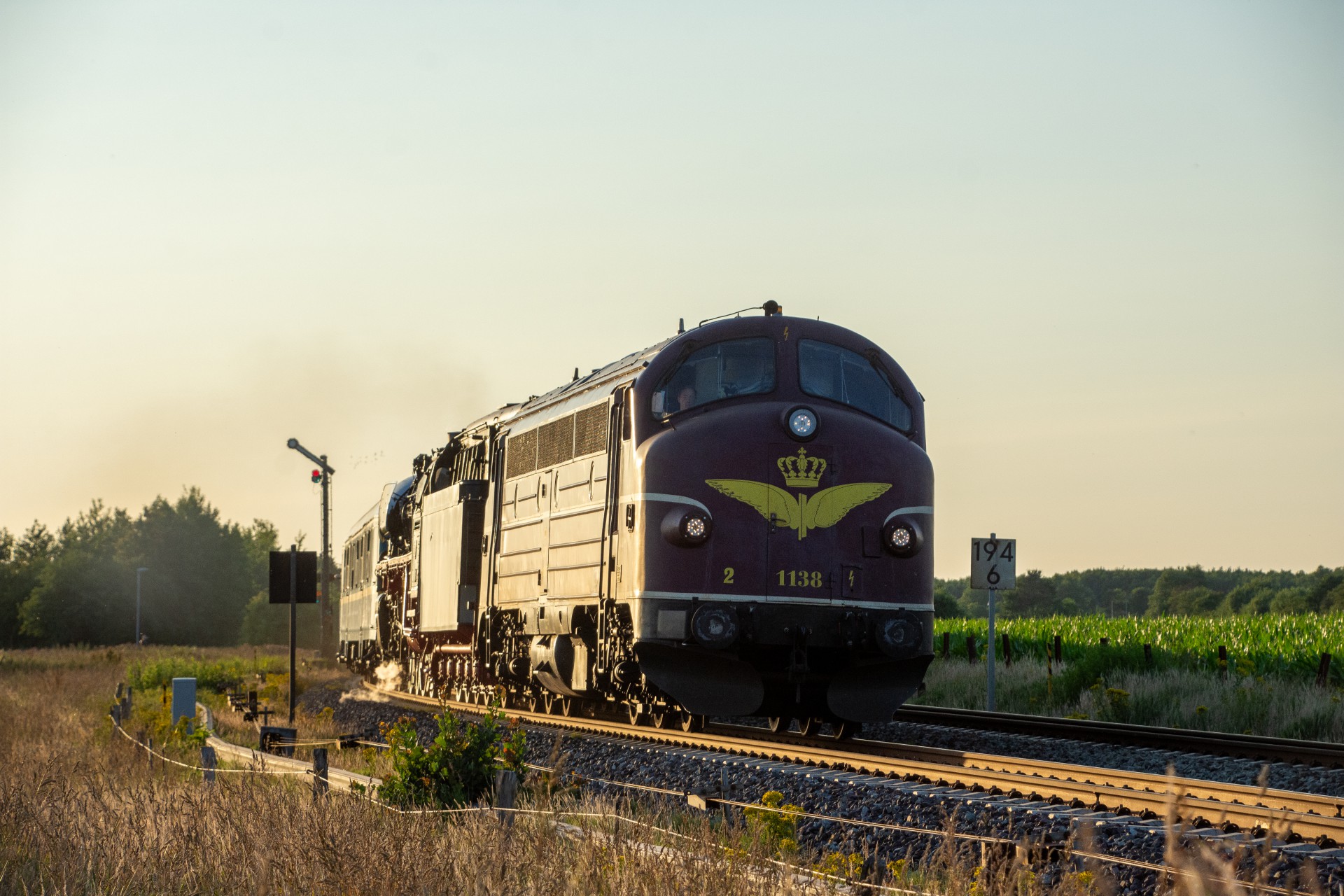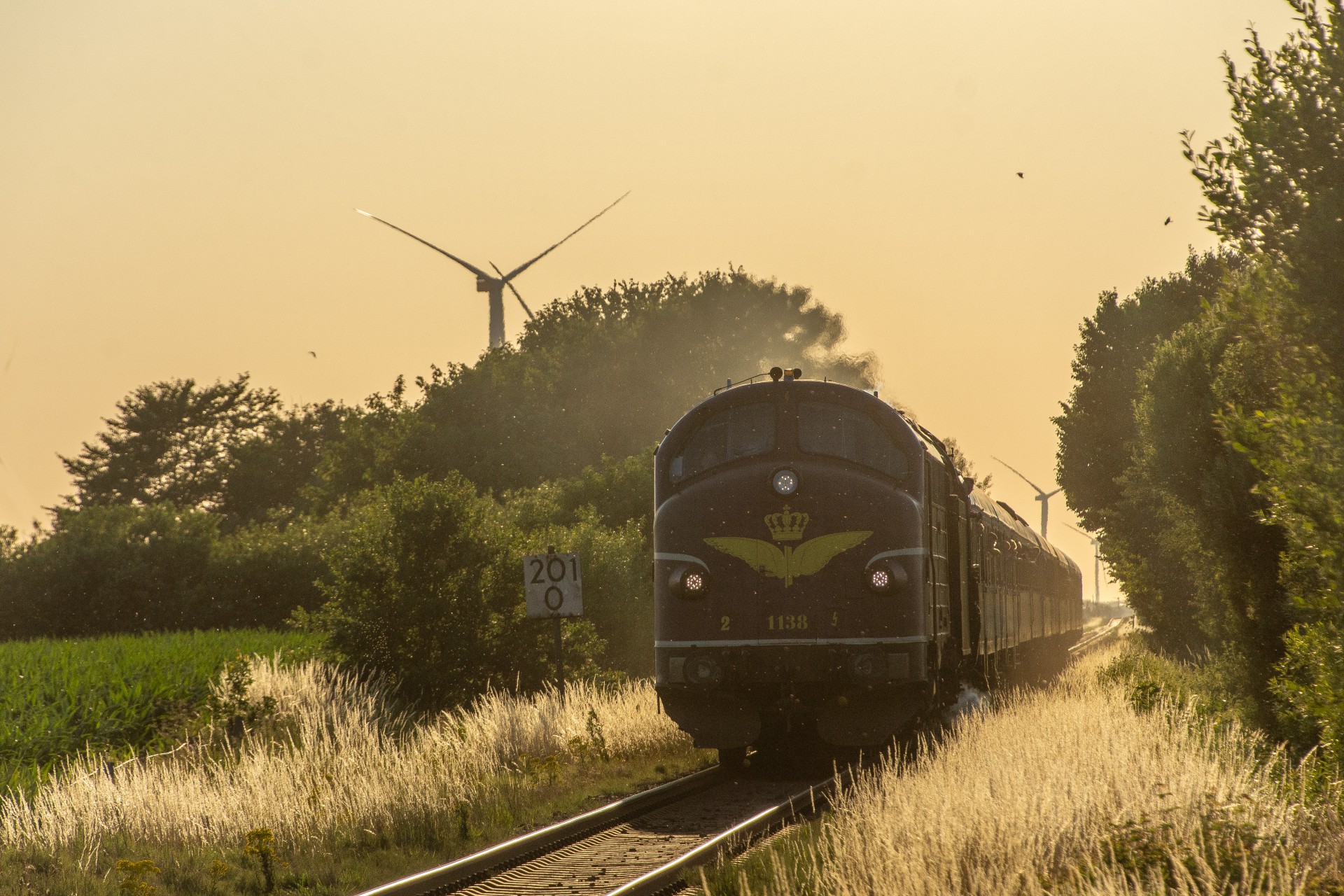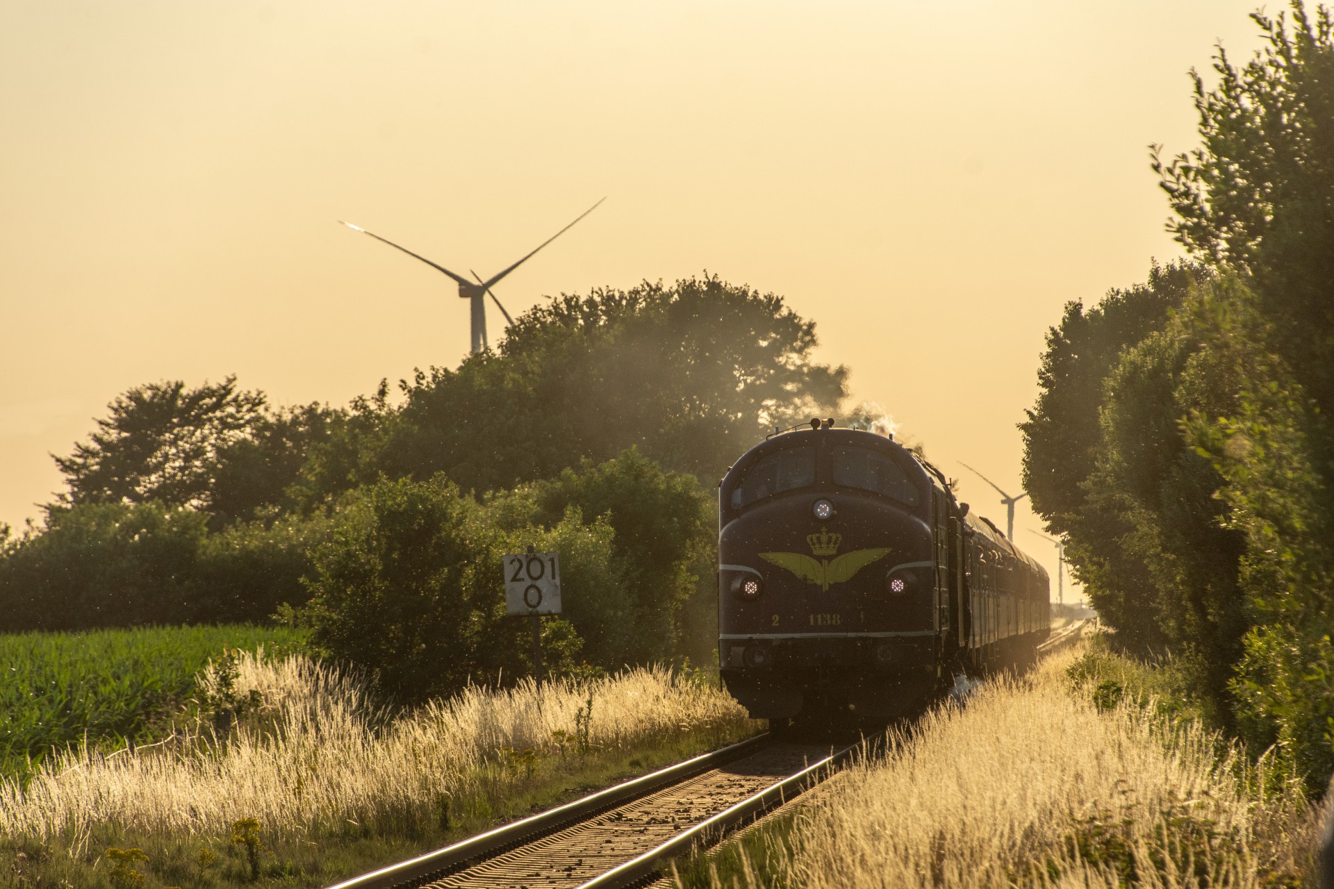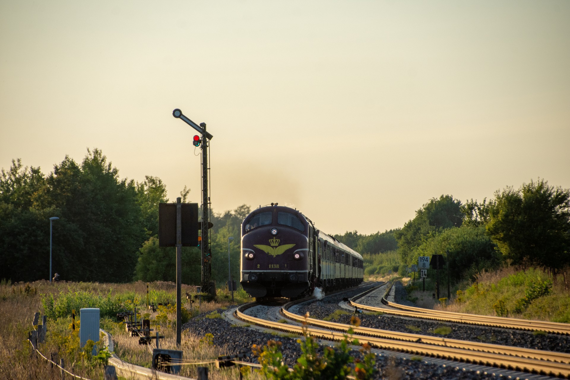 Derefter var det tid til at få noget aftensmad, og så afvente at MY 1138 skulle køre toget retur til Hamborg. Da solen efterhånden var kommet så langt rundt, stod den faktisk ret skidt i forhold til tog fra Westerland mod Niebüll (mod øst). Så jeg valgte det første sted skulle være lidt efter Klanxbüll mod Niebüll, hvor jeg fik noget mere af siden med, så det ikke blev så meget modlys. Det meste af dagen havde den normale trafik været noget forsinket, og det var den så også for returen her. Oprindelig skulle toget have været ved Klanxbüll 20.15 i følge planen, men var der først ved en 20:45 tiden. Da toget endelig kom, blev det til en række billeder hvor man rigtig kan se hvad forskel det gør hvordan solen står i forhold til toget.