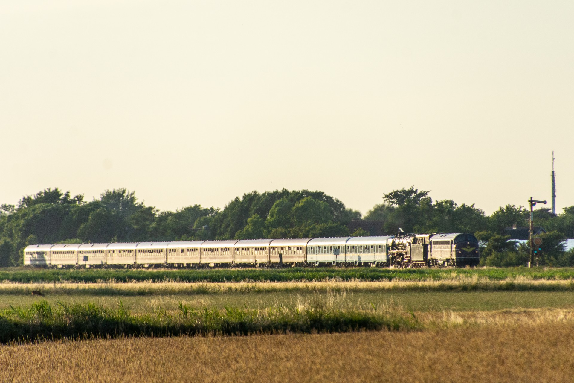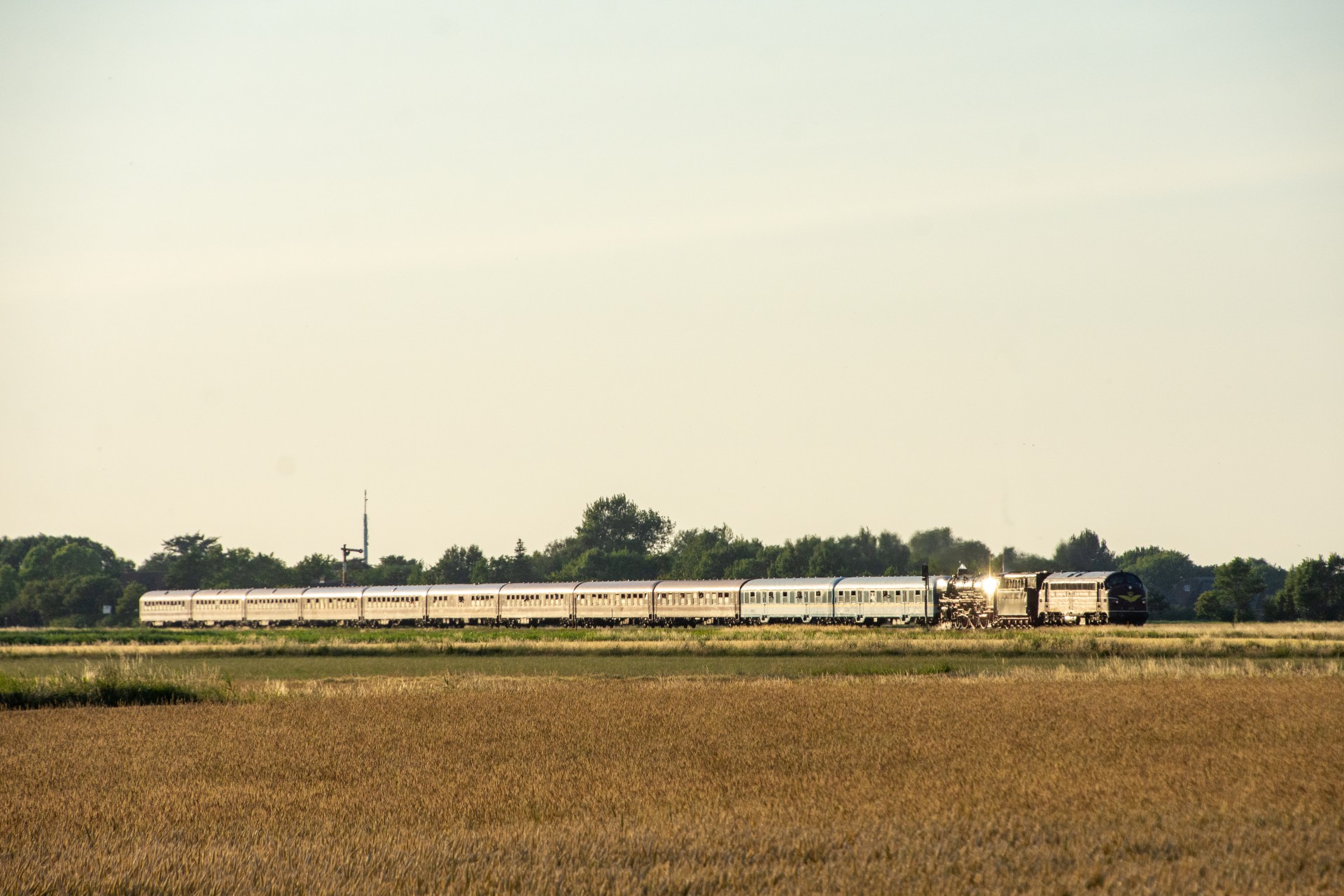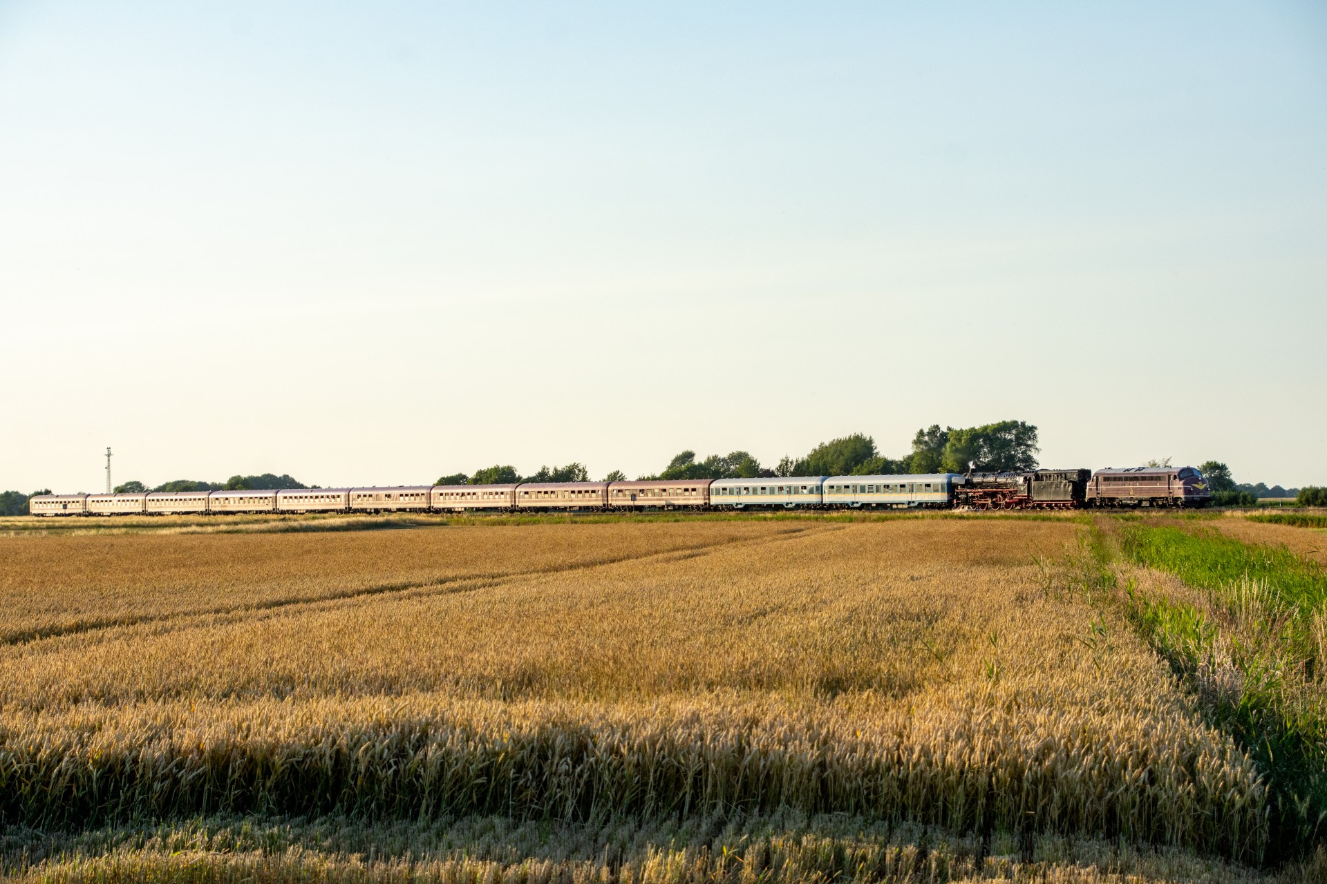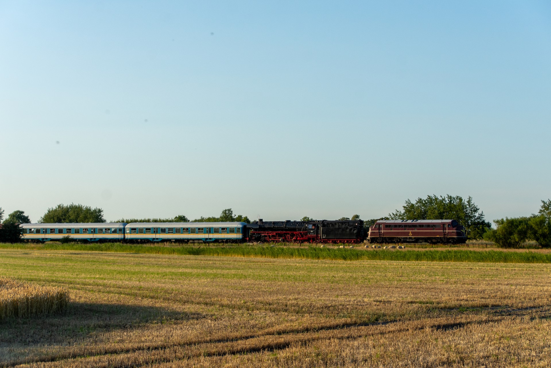 Derefter var det tid til at få noget aftensmad, og så afvente at MY 1138 skulle køre toget retur til Hamborg. Da solen efterhånden var kommet så langt rundt, stod den faktisk ret skidt i forhold til tog fra Westerland mod Niebüll (mod øst). Så jeg valgte det første sted skulle være lidt efter Klanxbüll mod Niebüll, hvor jeg fik noget mere af siden med, så det ikke blev så meget modlys. Det meste af dagen havde den normale trafik været noget forsinket, og det var den så også for returen her. Oprindelig skulle toget have været ved Klanxbüll 20.15 i følge planen, men var der først ved en 20:45 tiden. Da toget endelig kom, blev det til en række billeder hvor man rigtig kan se hvad forskel det gør hvordan solen står i forhold til toget.