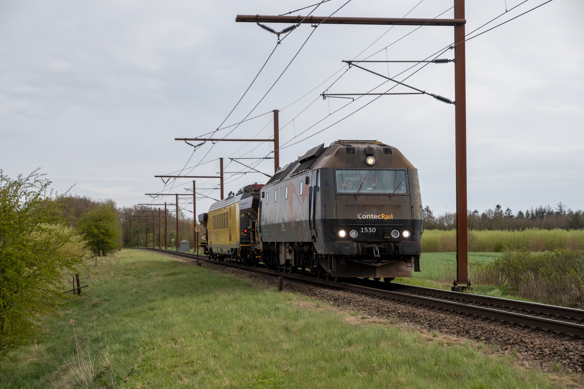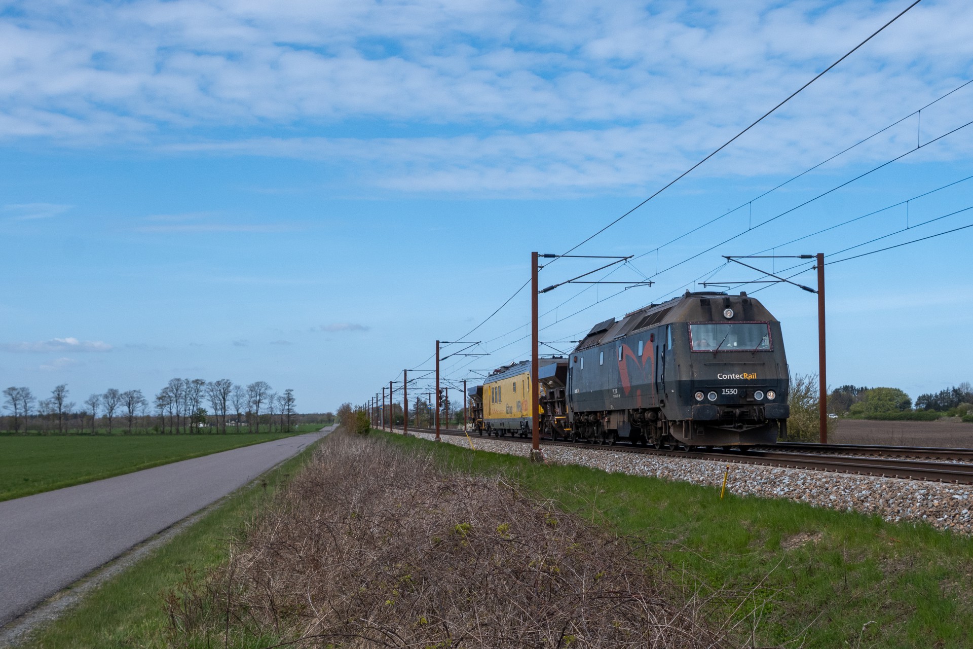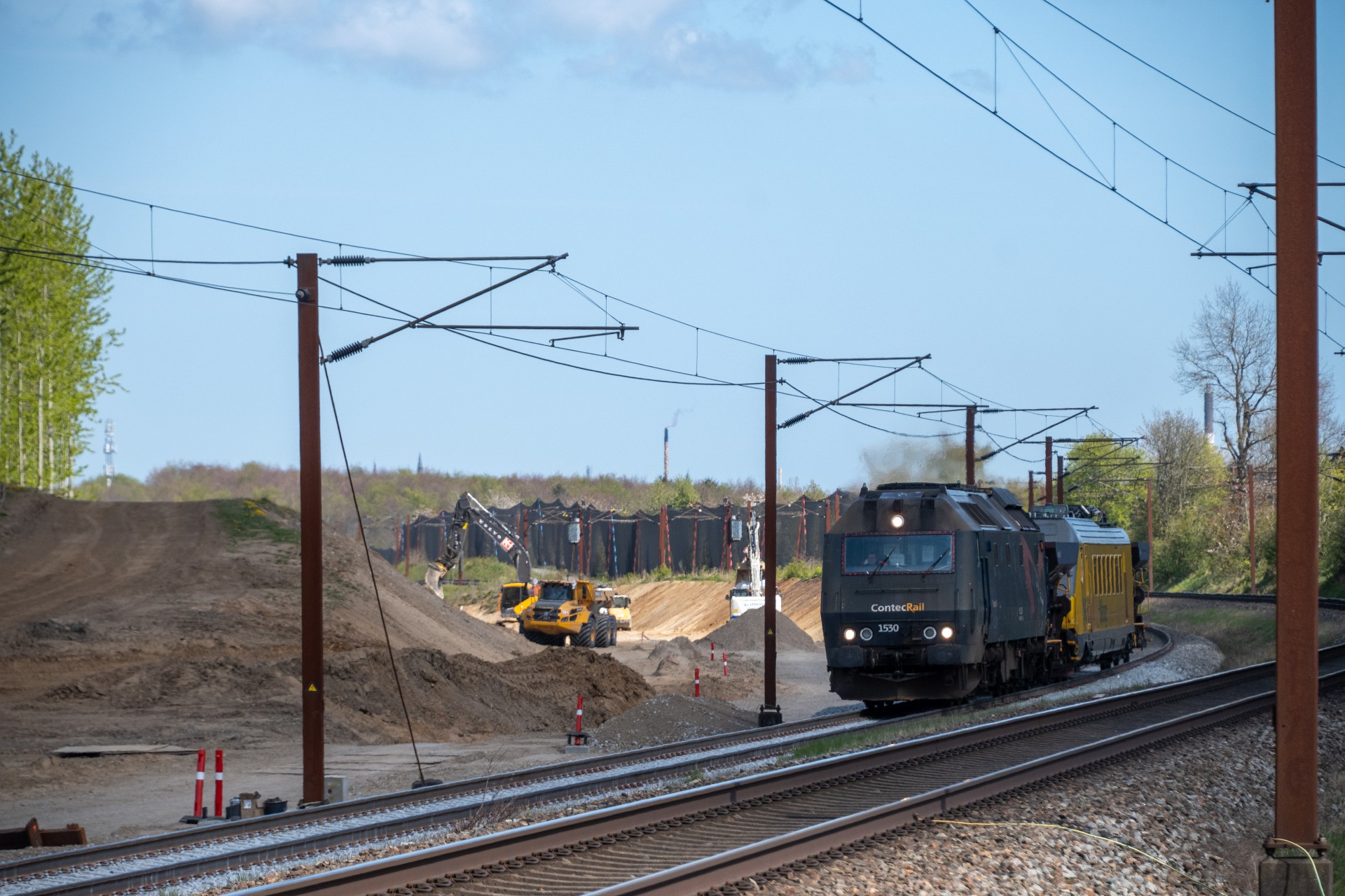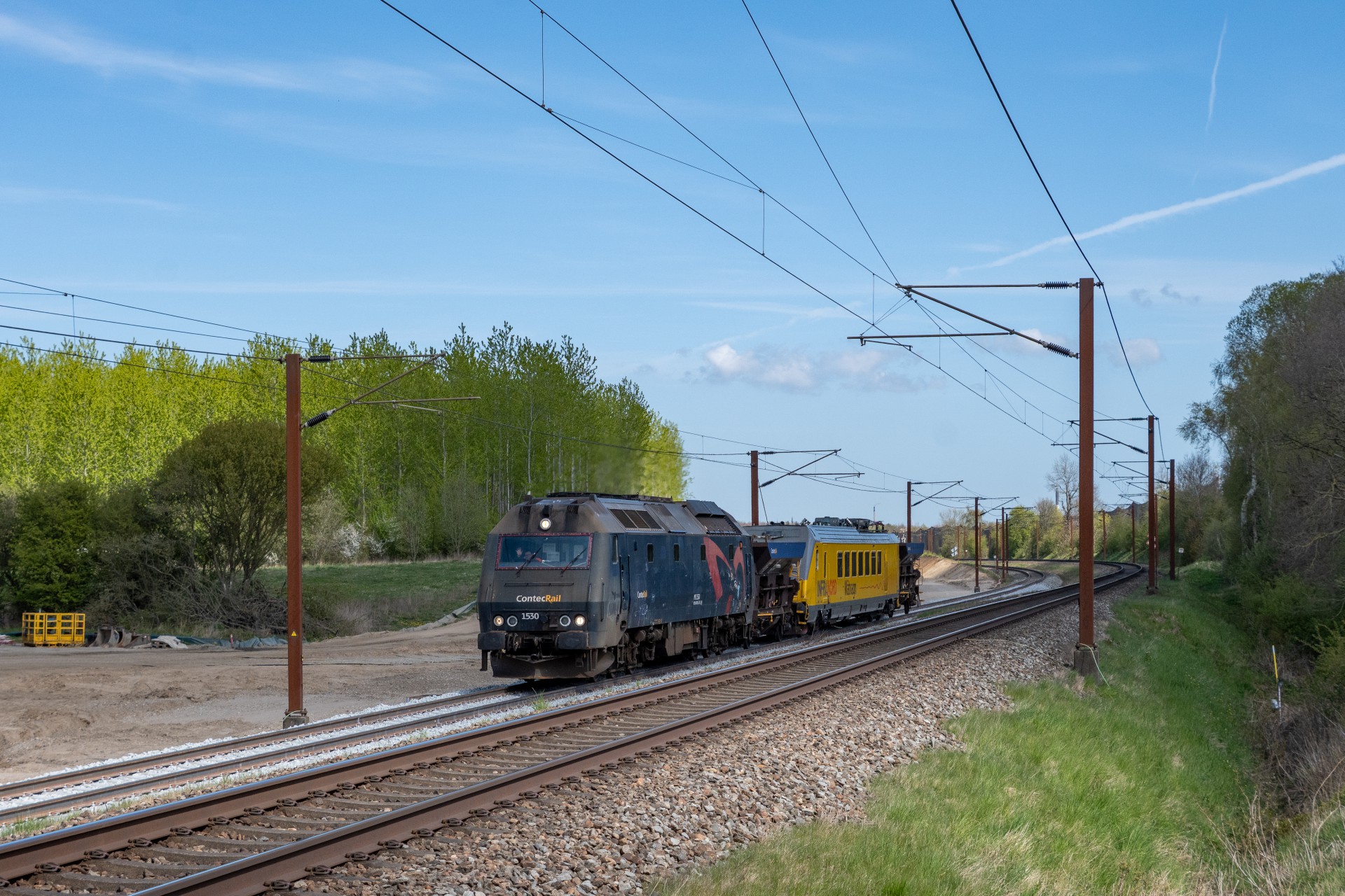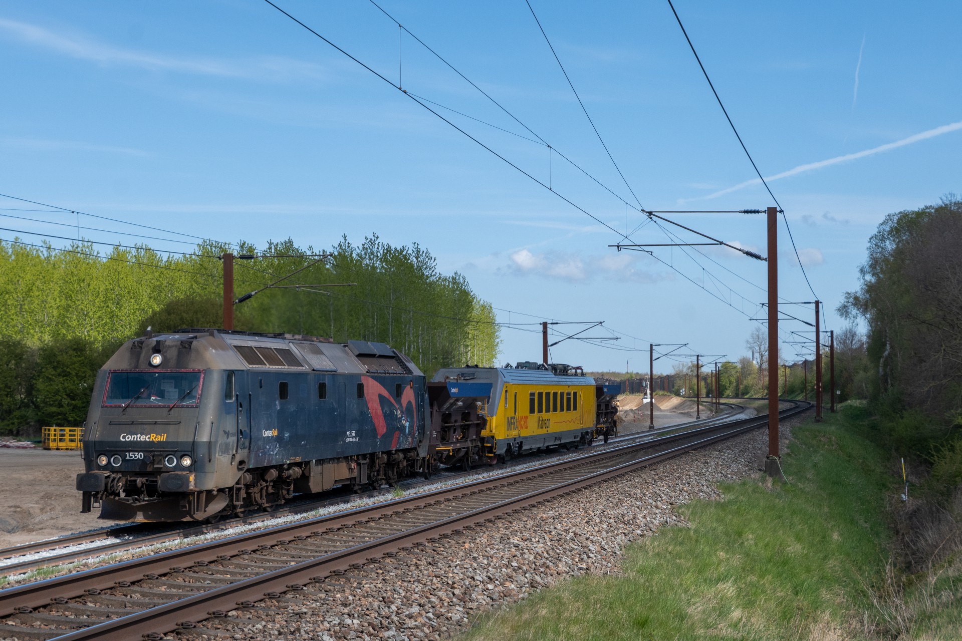 Mandag den 27. april kørte Contec Rail måletog fra Odense om eftermiddagen med ME 1530 + skærvervogn + InfraNord målevogn + skærvervogn. Jeg fulgte det meste af kørslen og startede ud lidt uden for Odense ved Elmelundsbakken. Her arbejdes der med den nye vestbane over fyn, da det er her sammenfletningen kommer til at være. Desværre ville en fotosky være med da toget passerede her, men der kom dog lidt sol på selve ME 1530.