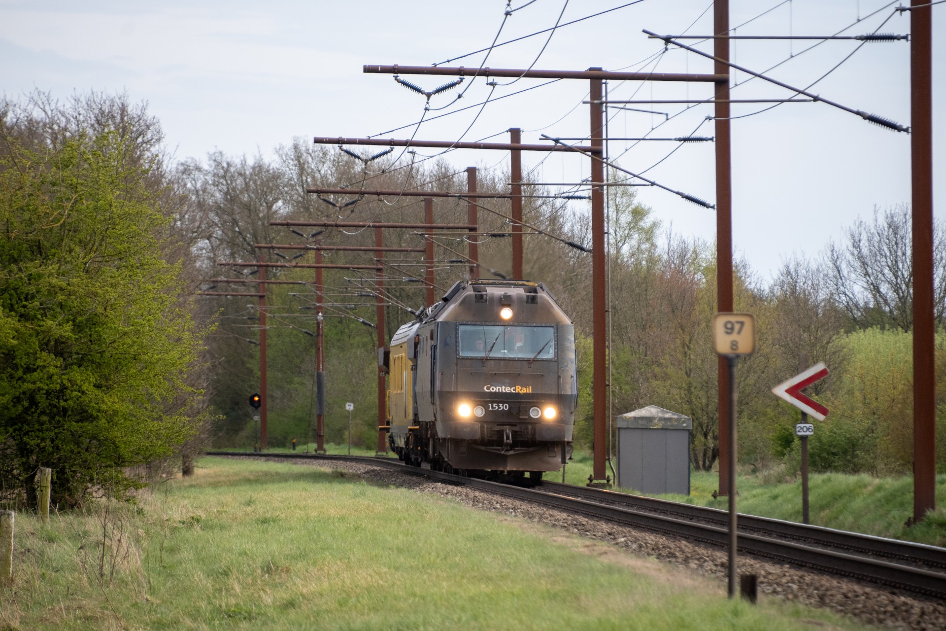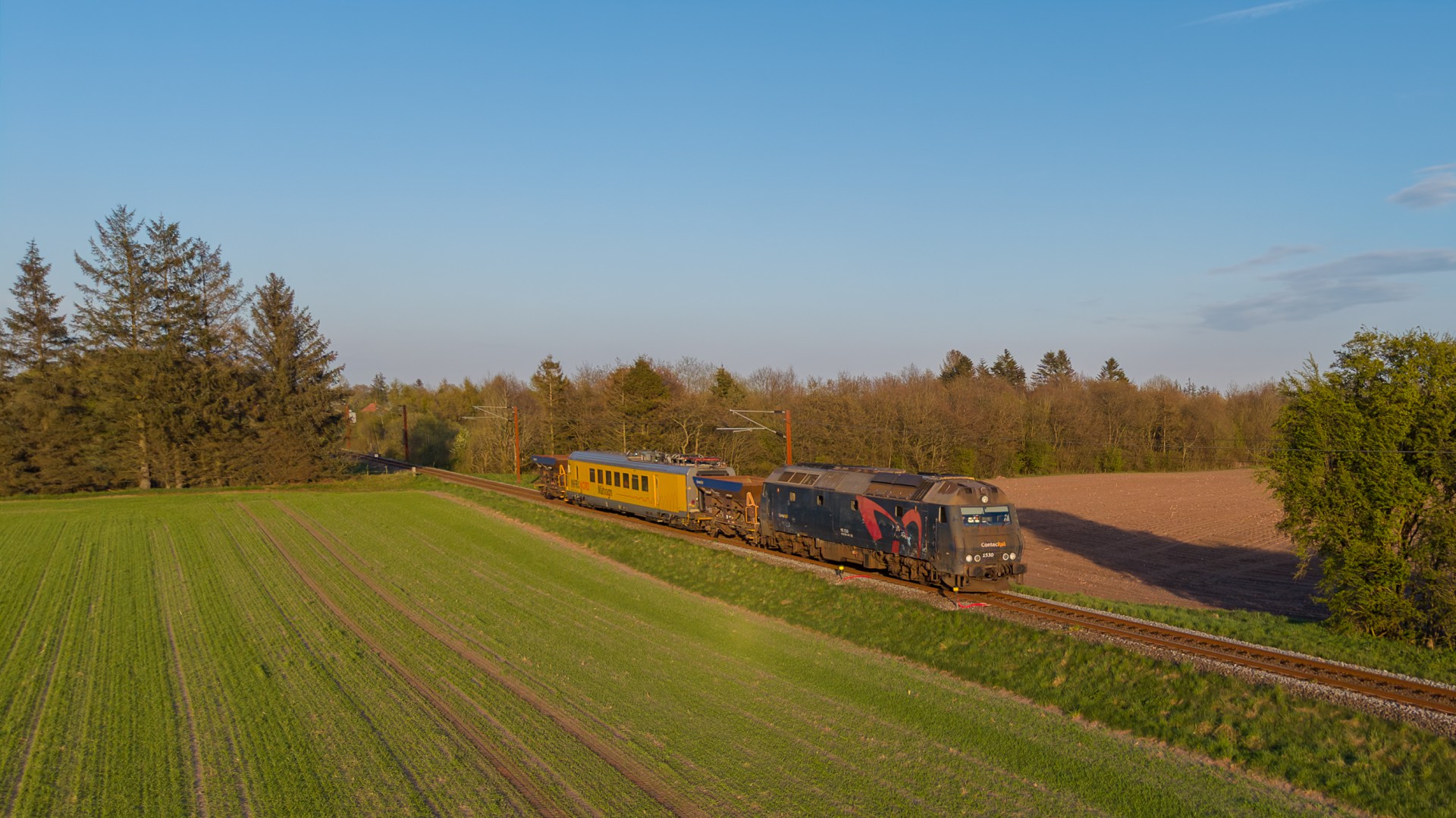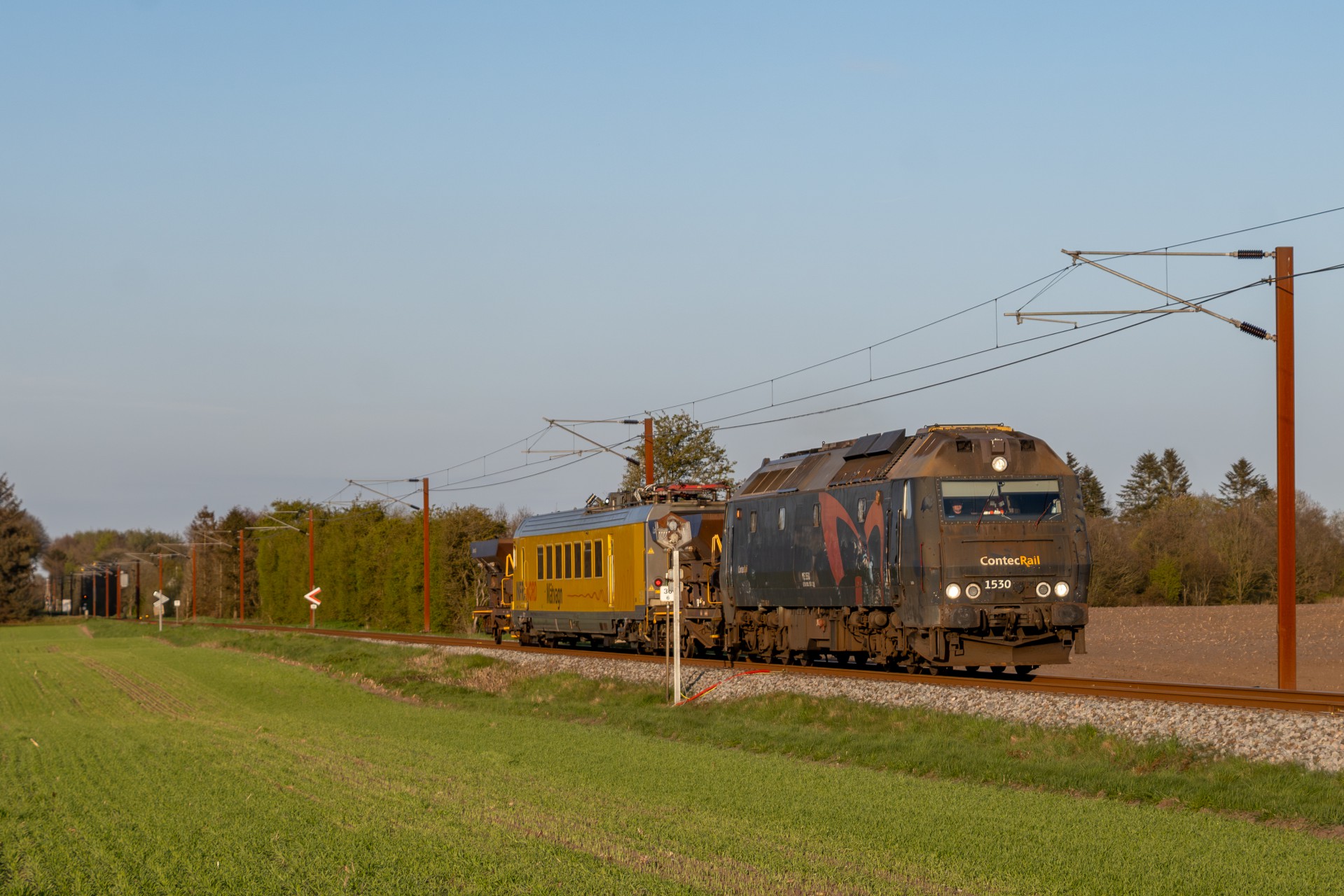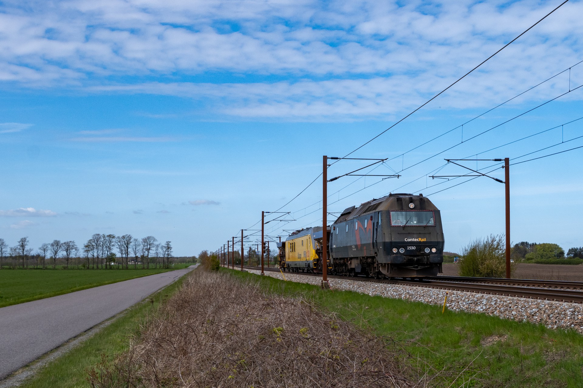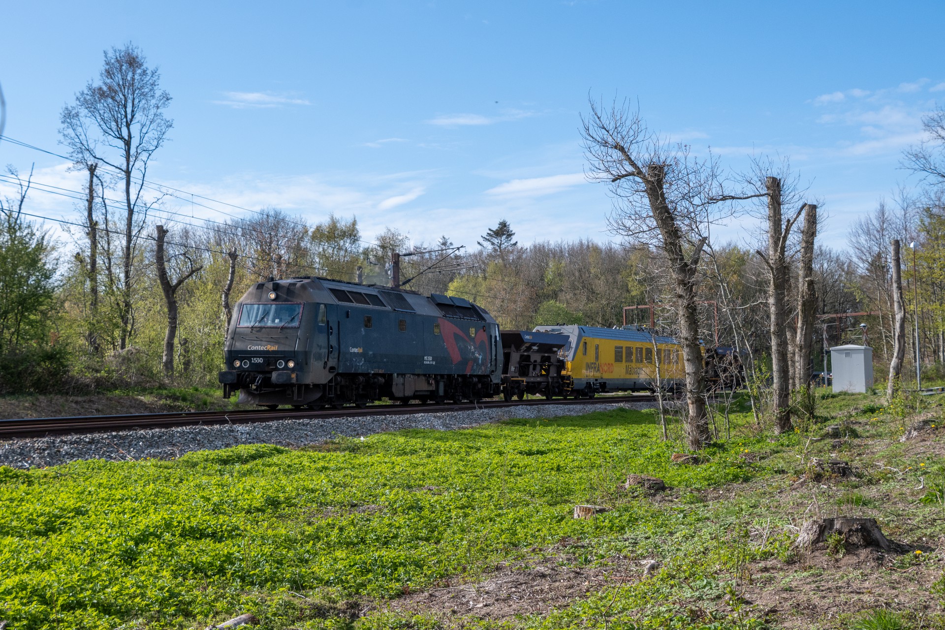 Mandag den 27. april kørte Contec Rail måletog fra Odense om eftermiddagen med ME 1530 + skærvervogn + InfraNord målevogn + skærvervogn. Jeg fulgte det meste af kørslen og startede ud lidt uden for Odense ved Elmelundsbakken. Her arbejdes der med den nye vestbane over fyn, da det er her sammenfletningen kommer til at være. Desværre ville en fotosky være med da toget passerede her, men der kom dog lidt sol på selve ME 1530.