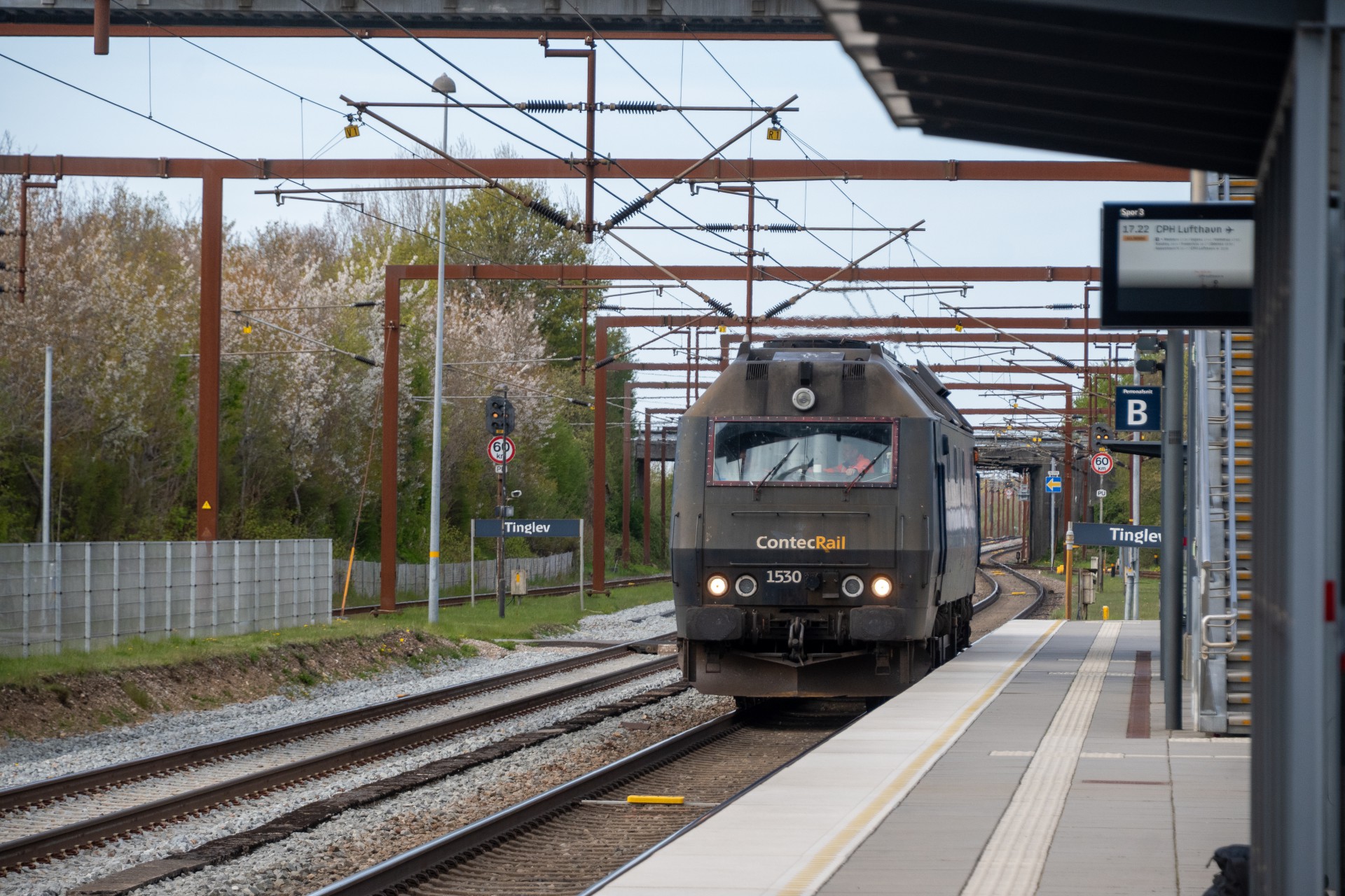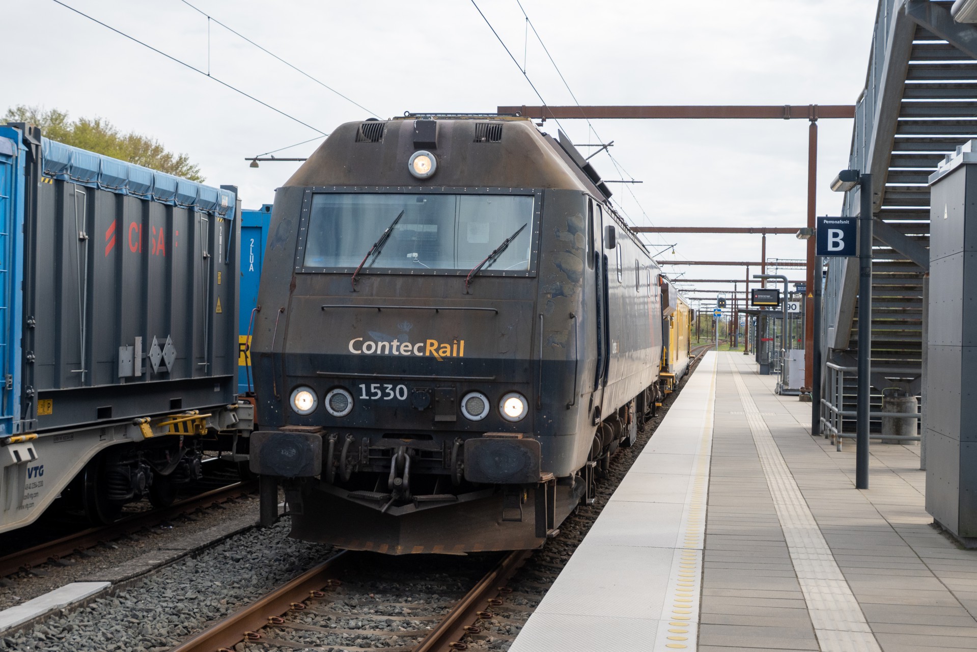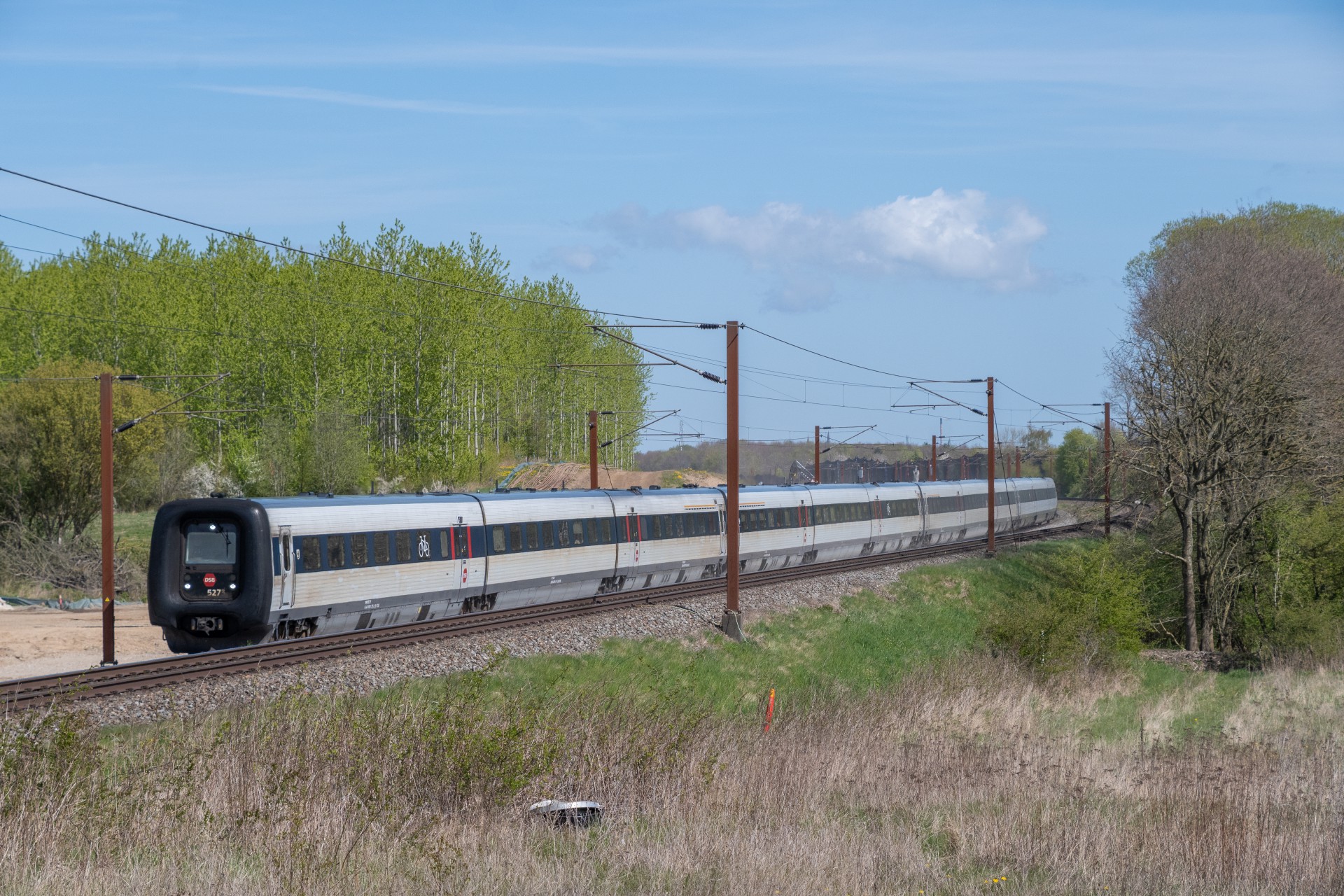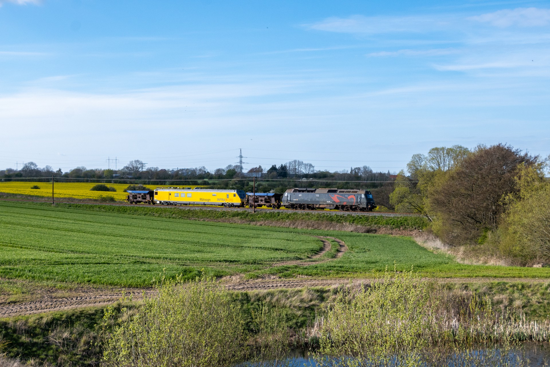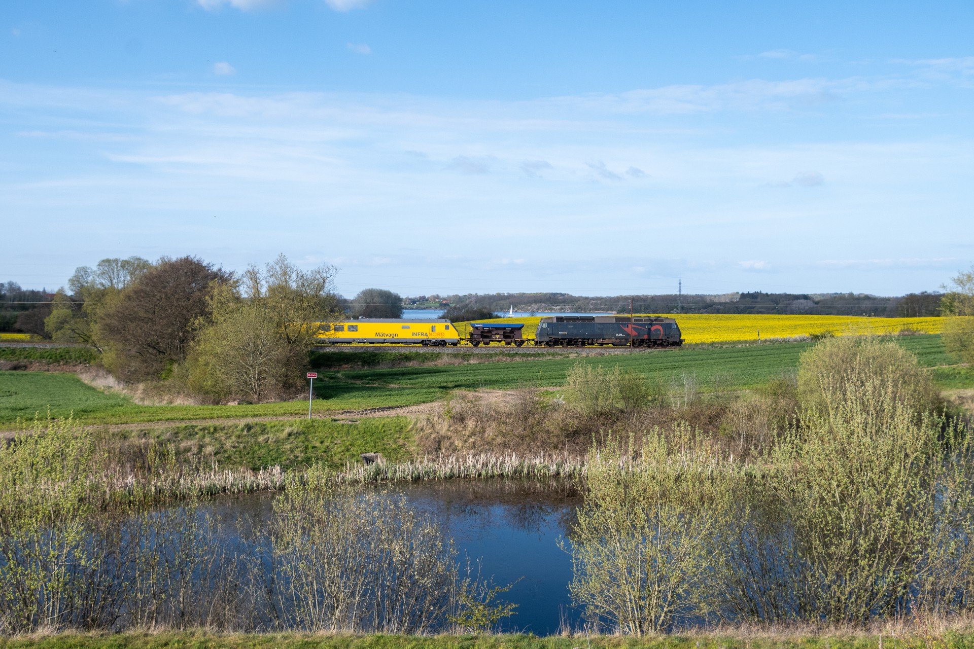 Mandag den 27. april kørte Contec Rail måletog fra Odense om eftermiddagen med ME 1530 + skærvervogn + InfraNord målevogn + skærvervogn. Jeg fulgte det meste af kørslen og startede ud lidt uden for Odense ved Elmelundsbakken. Her arbejdes der med den nye vestbane over fyn, da det er her sammenfletningen kommer til at være. Desværre ville en fotosky være med da toget passerede her, men der kom dog lidt sol på selve ME 1530.