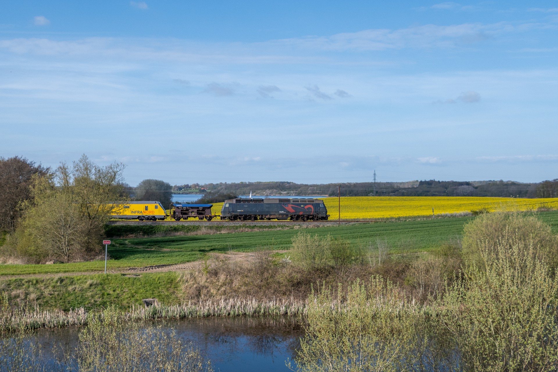 Så kørte jeg mod Sønderborg, og nåede heldigvis frem i tid til at kunne få et par billeder af toget inden det var nået til Sønderborg, og endda med en flot rapsmark i baggrunden. Jeg kunne ikke rigtig beslutte mig hvor jeg ville fotografere toget da det kørte retur fra Sønderborg mod Tinglev, så jeg endte ud mellem Kliplev og Tinglev, hvor der var et fint åbent stykke, hvor solen stod flot.