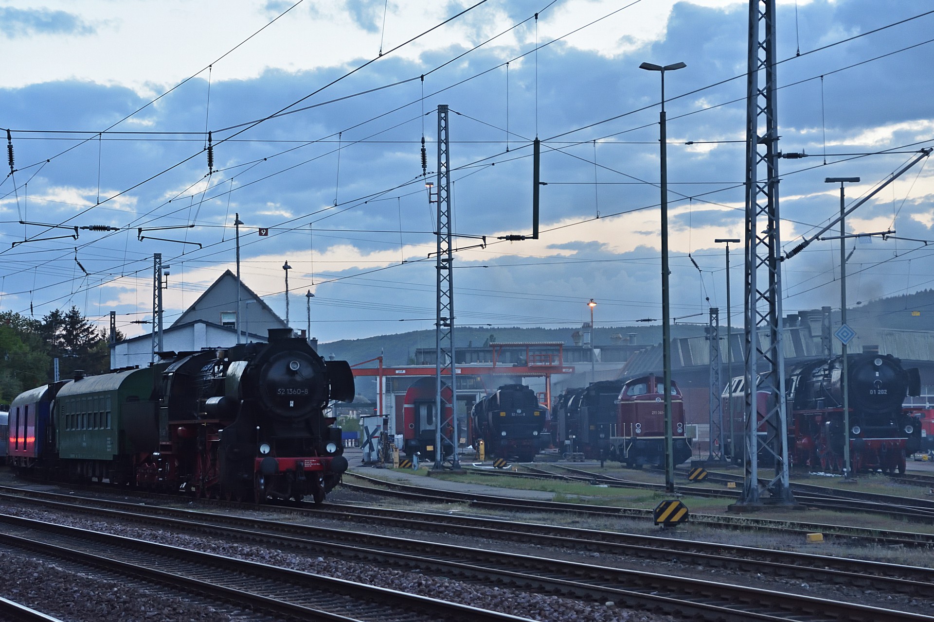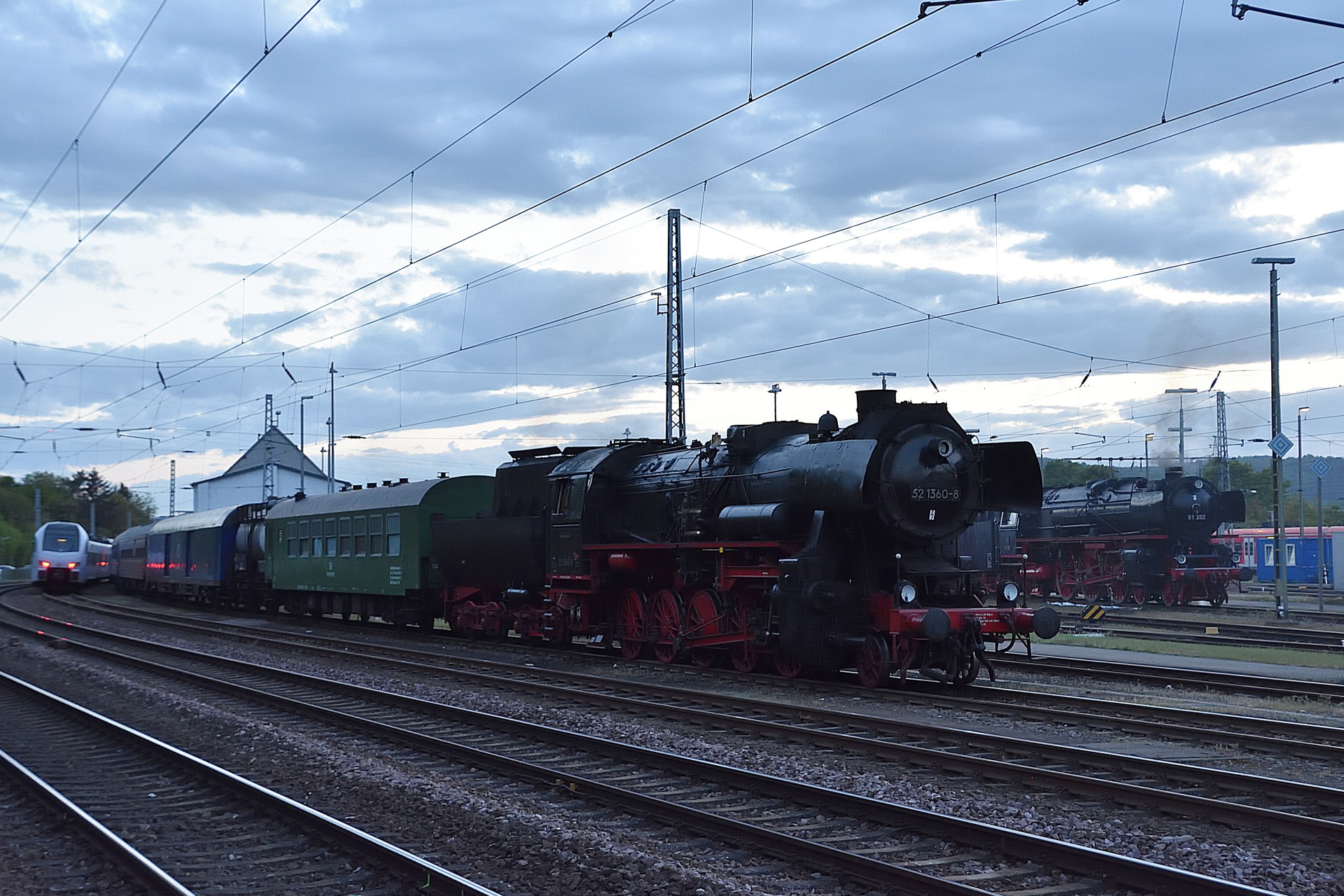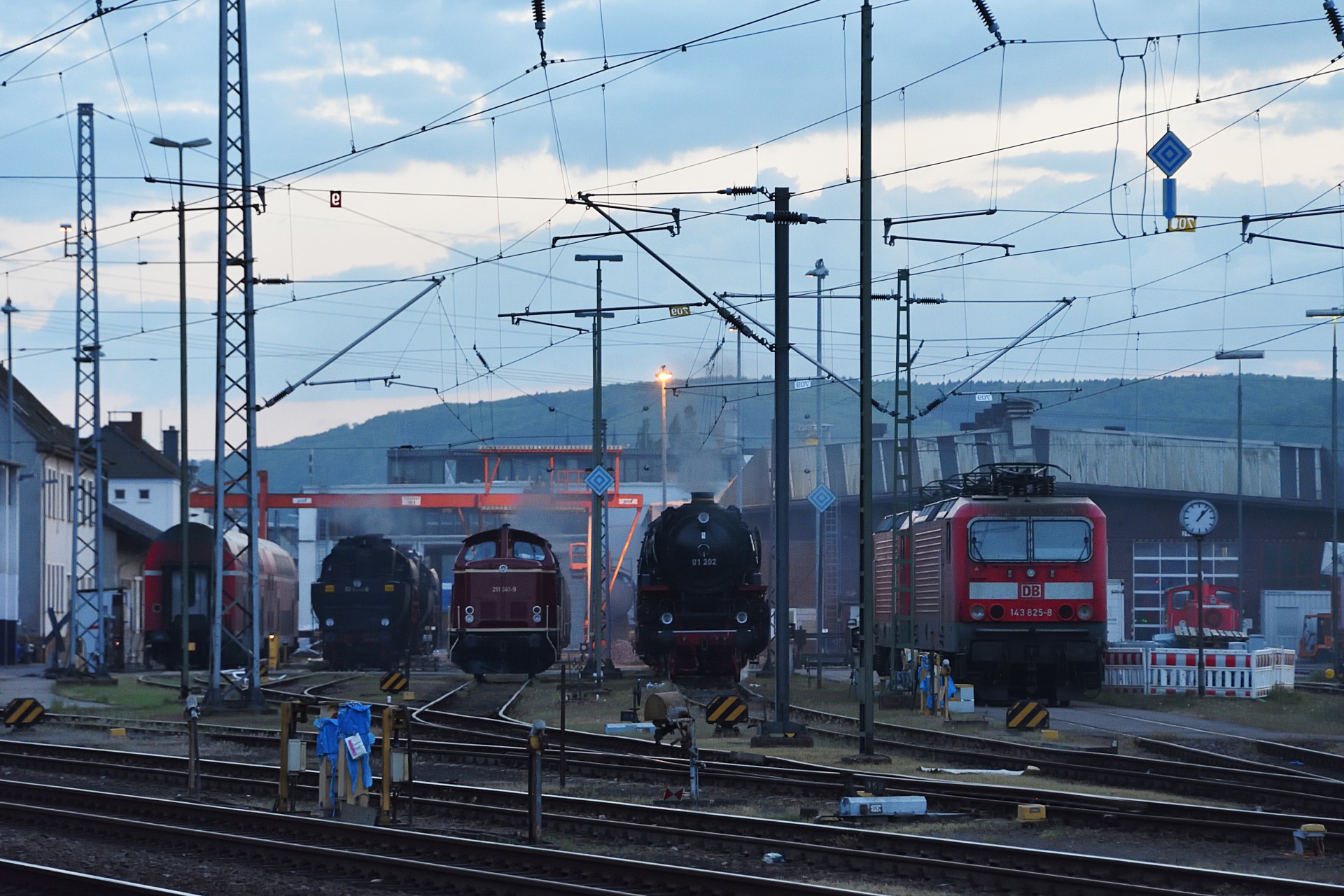 Fredag den 27. april drog vi tidligt om morgen/natten mod Trier området hvor denne gangs “Dampfspektakel” skulle løbe af stablen. Efter at være ankommet til Trier ved en 11 tiden tog vi et smut ned på banegården, for at se om der allerede var noget at se og minsandten om ikke 01 202 kom rullende ind. Sikke et sammentræf og en god start på turen, senere så jeg da også i planen at toget faktisk var nævnt i programmet som et privat arrangement. Resten af dagen gik med at få tjekket ind på hotellet, køre lidt rundt omkring Trier for at finde et par fotosteder, samt sidst på aftenen var vi en tur forbi DB Regio AG´s værksted i Trier hvor der blev rangeret, og et par dampere stod klar.