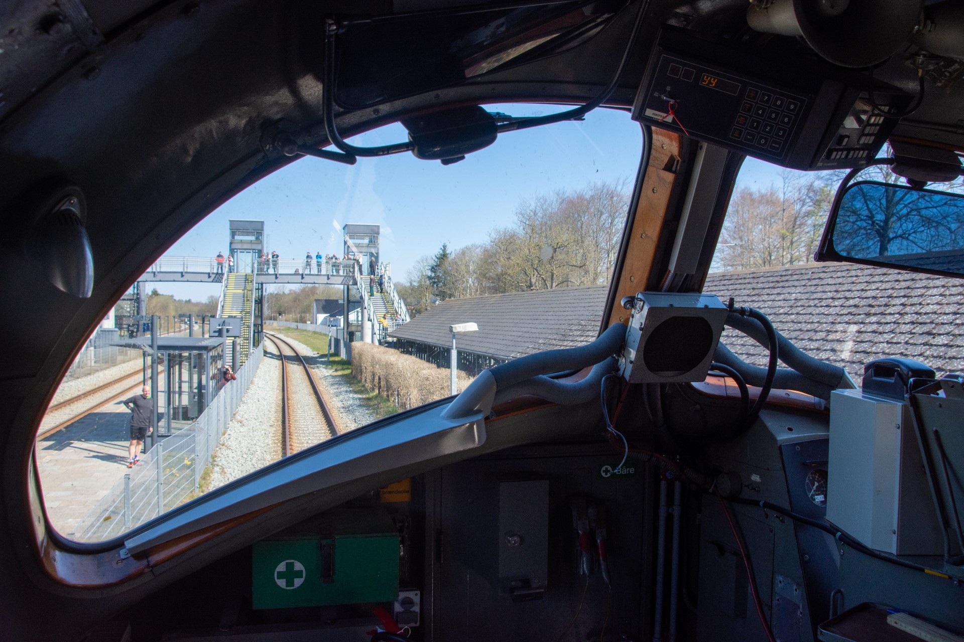 Derefter kørte jeg et meget hurtig smut ind forbi Aarhus hovedbanegård, men der var allerede foretaget omløb, så det var modlys billeder, så jeg kørte hurtigt videre mod Randers. Her havde jeg udvalgt den blå bro til næste fotosted, og det blev til et par herlige billeder. Det eneste der lige manglede, var at vandet var lidt mere roligt, så der formentlig havde været en pæn spejling. Så efter toget var passeret kørte jeg til Skørping hvor der var godt 1 times ophold. Herfra blev det til lidt forskellige billeder, og blandt andet fra førerrummet på MY 1135.