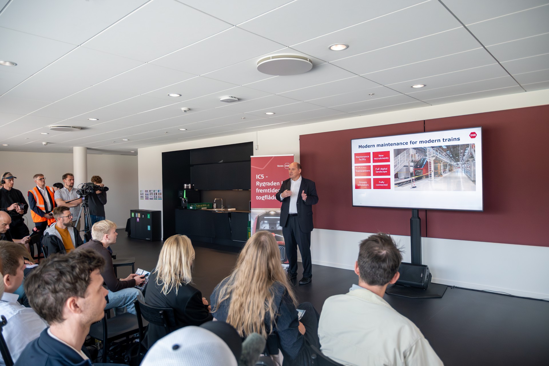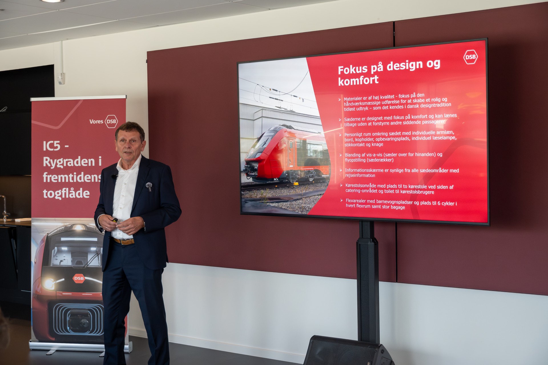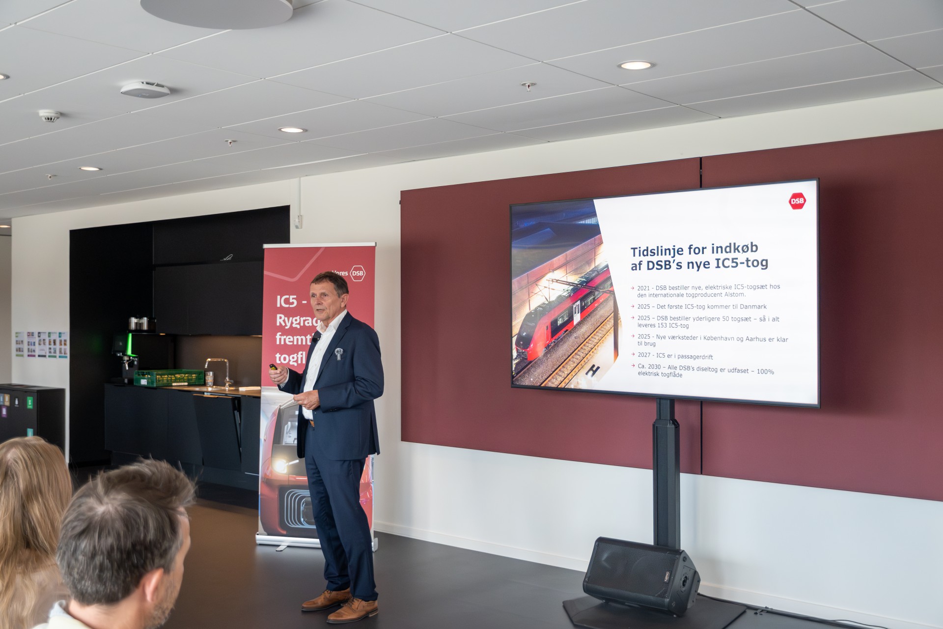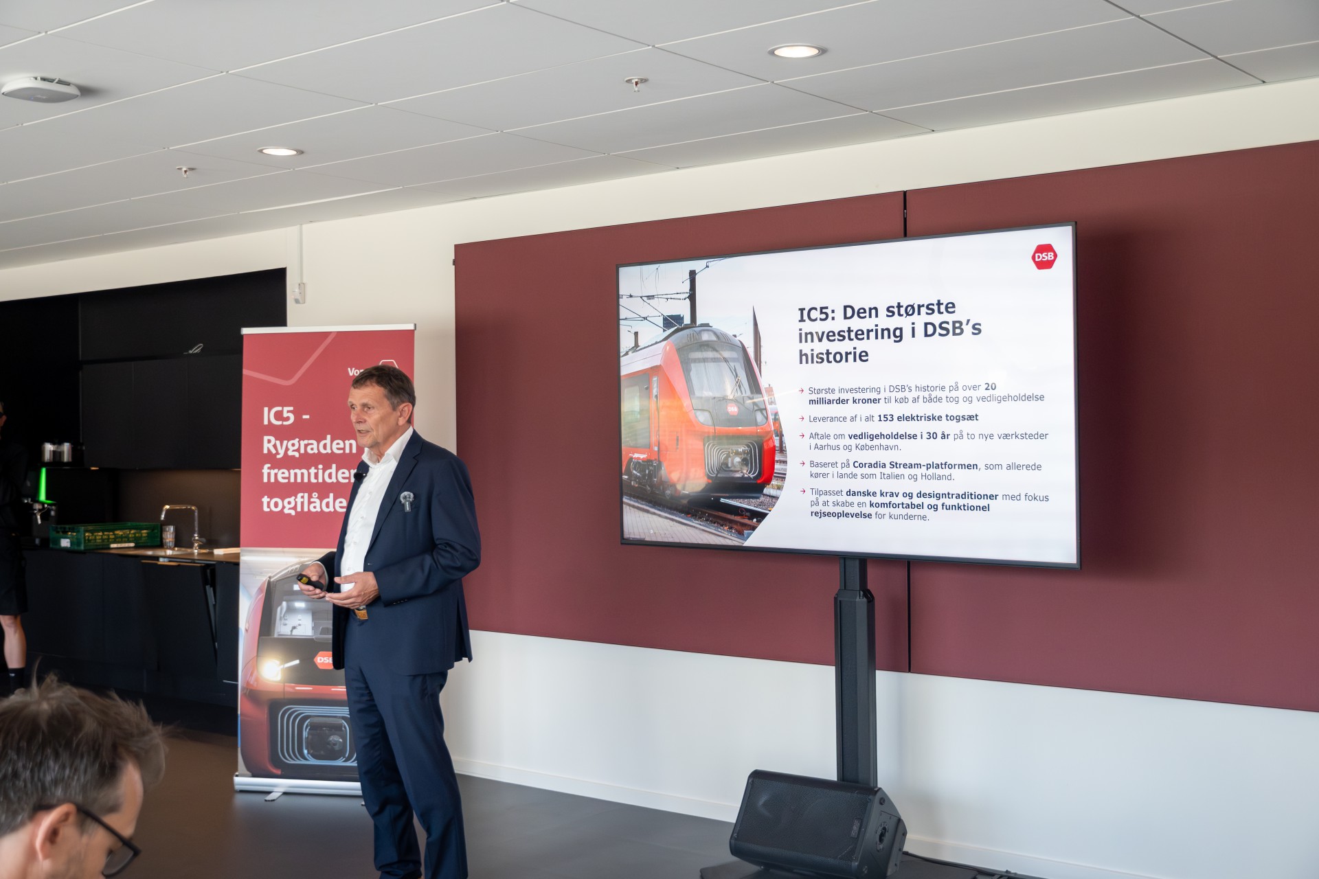 Inden vi fik lov at komme ind og se toget, holdt DSB’s direktør Flemming Jensen en præsentation, hvor han fortalte om baggrunden for IC5-projektet, og hvorfor det spiller en så central rolle i fremtidens danske togtrafik.