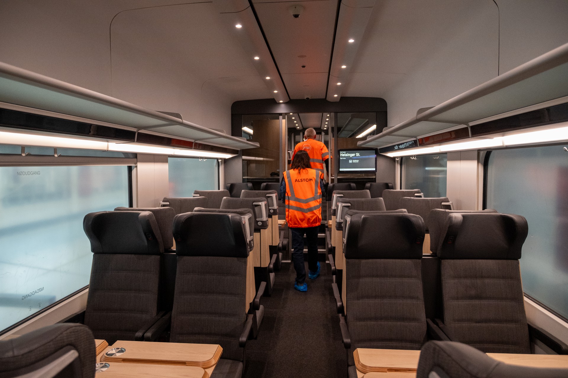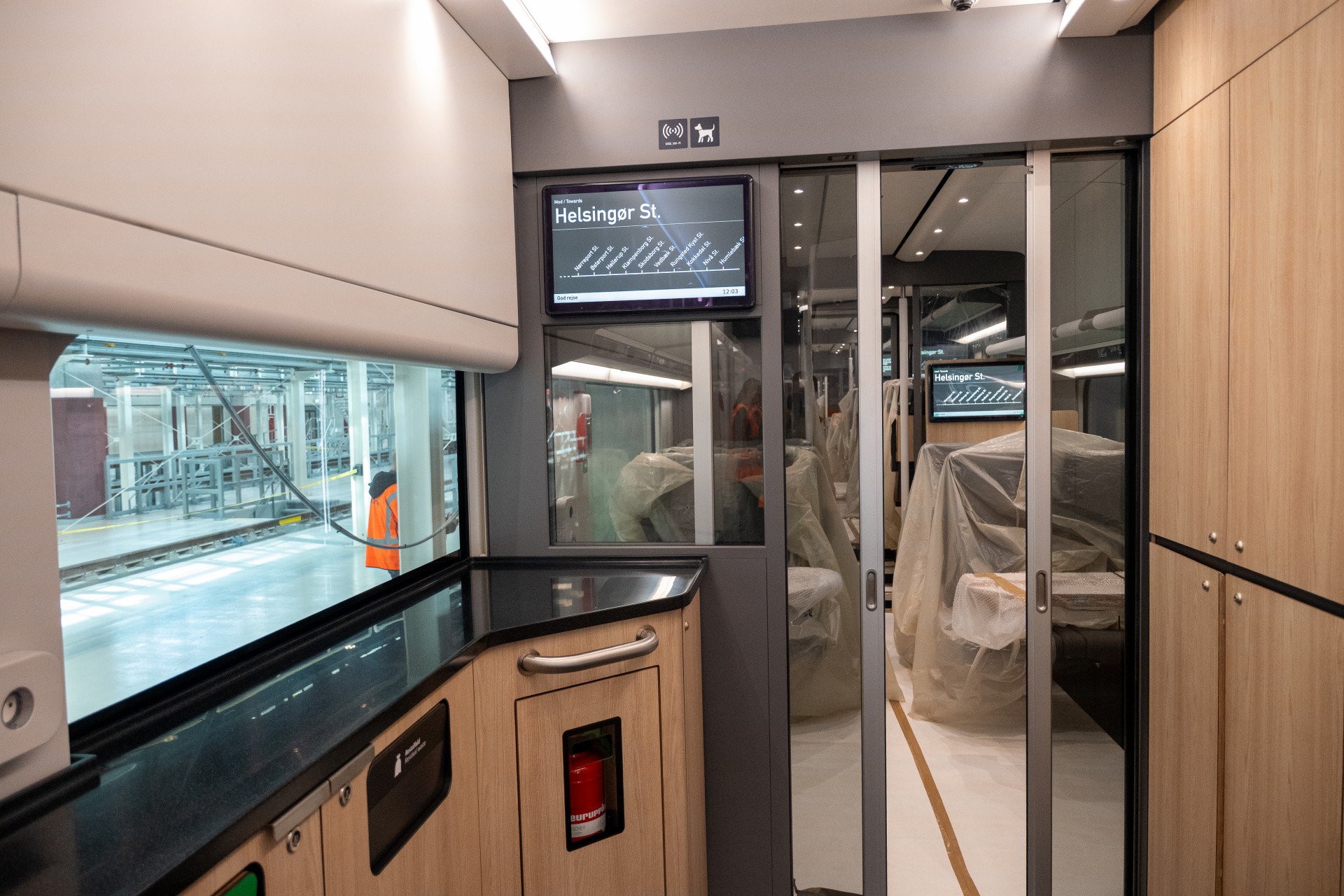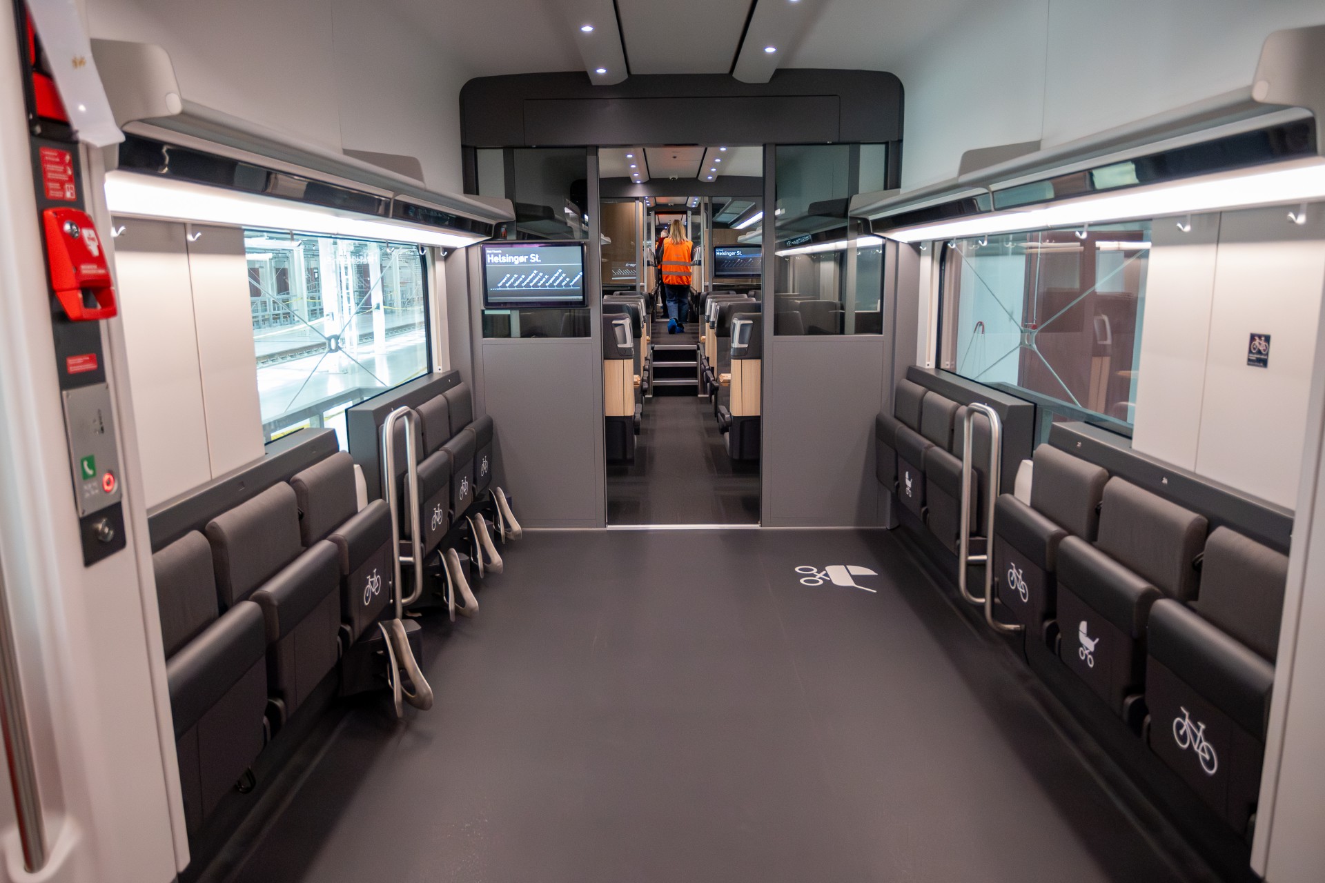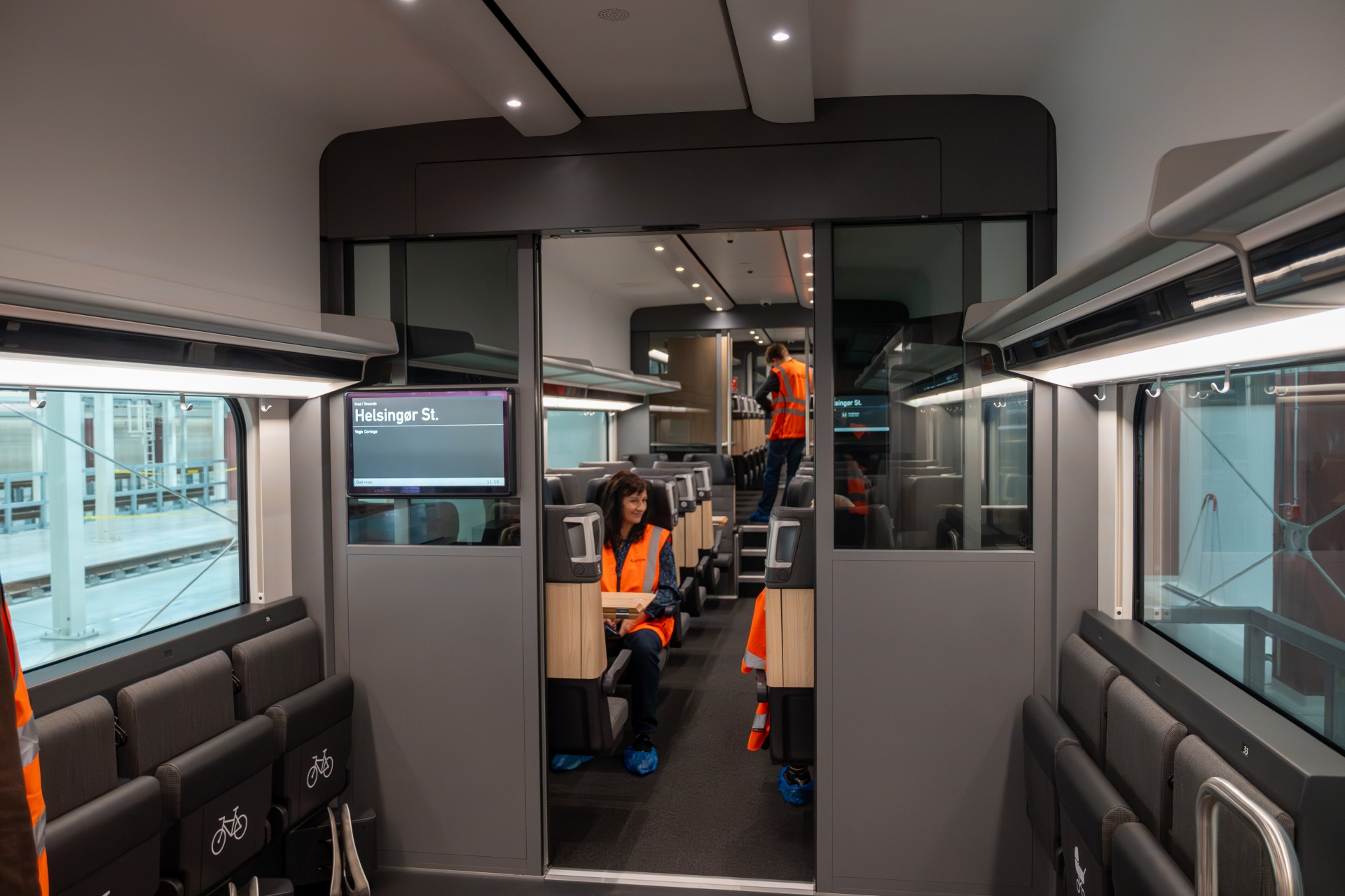 Derefter blev toget vist frem i grupper, og vi kunne gå ind i toget. For første gang fik vi mulighed for at opleve interiøret på nært hold: de lyse og moderne vogne, sæderne med strømstik ved hver plads, cykelområdet og de brede døre, som gør det lettere at komme hurtigt ind og ud.