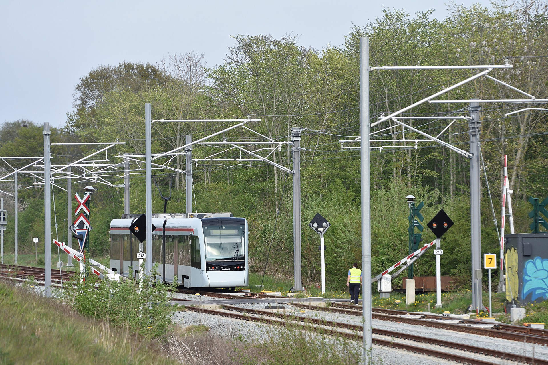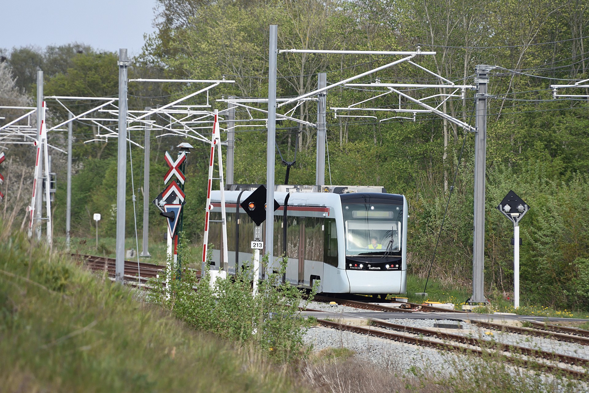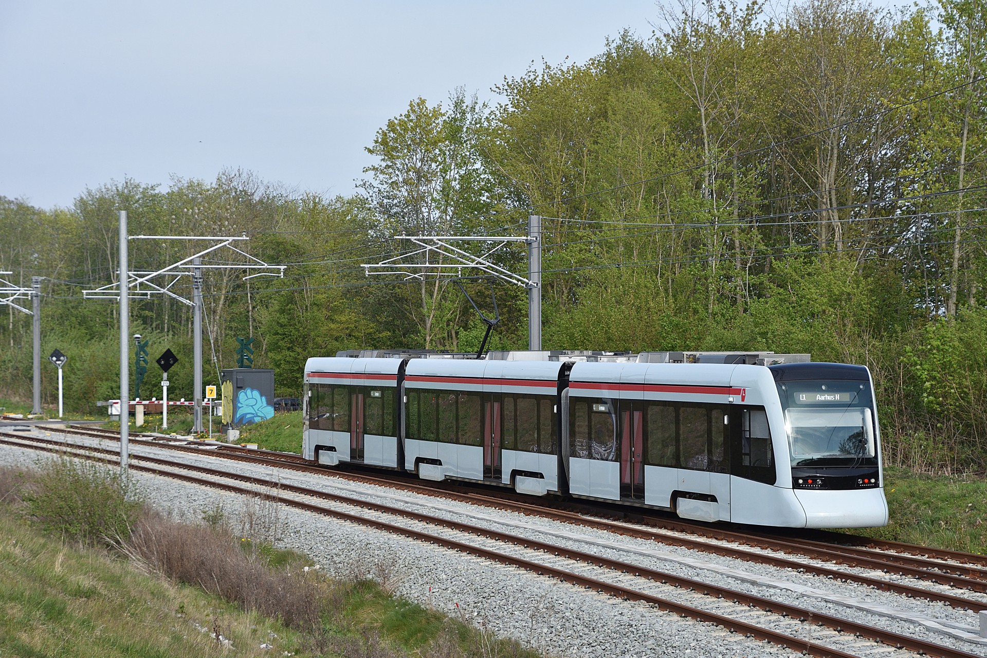 Tirsdag den 30. april åbenende strækningen mellem Aarhus og Grenå så endelig igen, efter man var blevet færdig med opbygningen og test kørslerne. Desværre forløb det ikke helt uden problemer, da flere bomme ikke gik ned automatisk, så letbanefører måtte ud og aktivere dem manuelt. Dette var også tilfældet lidt uden for Lystrup hvor jeg tog et par billeder fra om eftermiddagen. De sidste par billeder er fra Risskov.