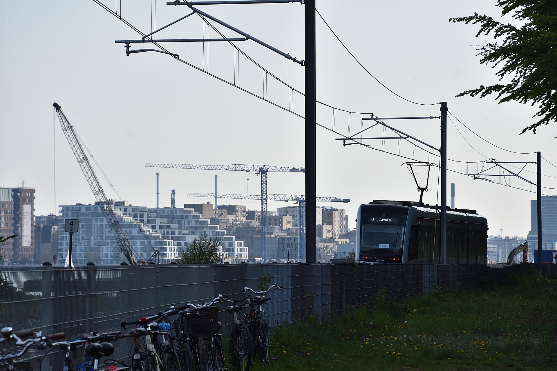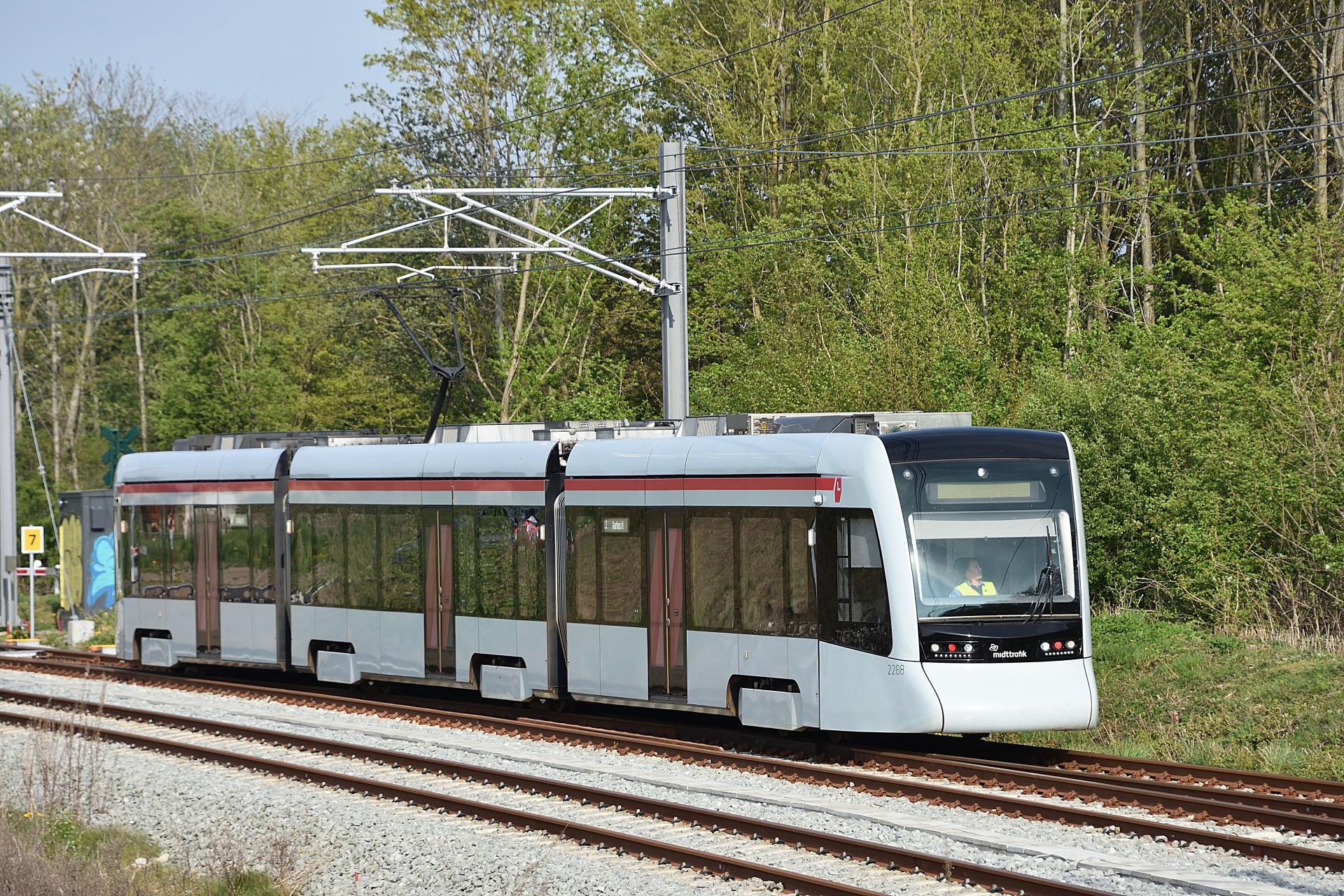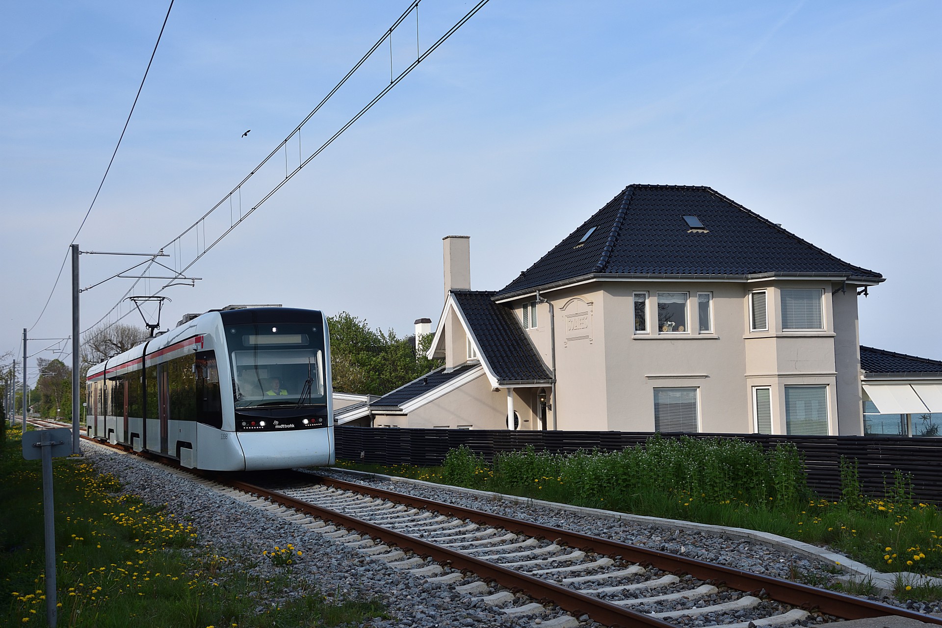 Tirsdag den 30. april åbenende strækningen mellem Aarhus og Grenå så endelig igen, efter man var blevet færdig med opbygningen og test kørslerne. Desværre forløb det ikke helt uden problemer, da flere bomme ikke gik ned automatisk, så letbanefører måtte ud og aktivere dem manuelt. Dette var også tilfældet lidt uden for Lystrup hvor jeg tog et par billeder fra om eftermiddagen. De sidste par billeder er fra Risskov.