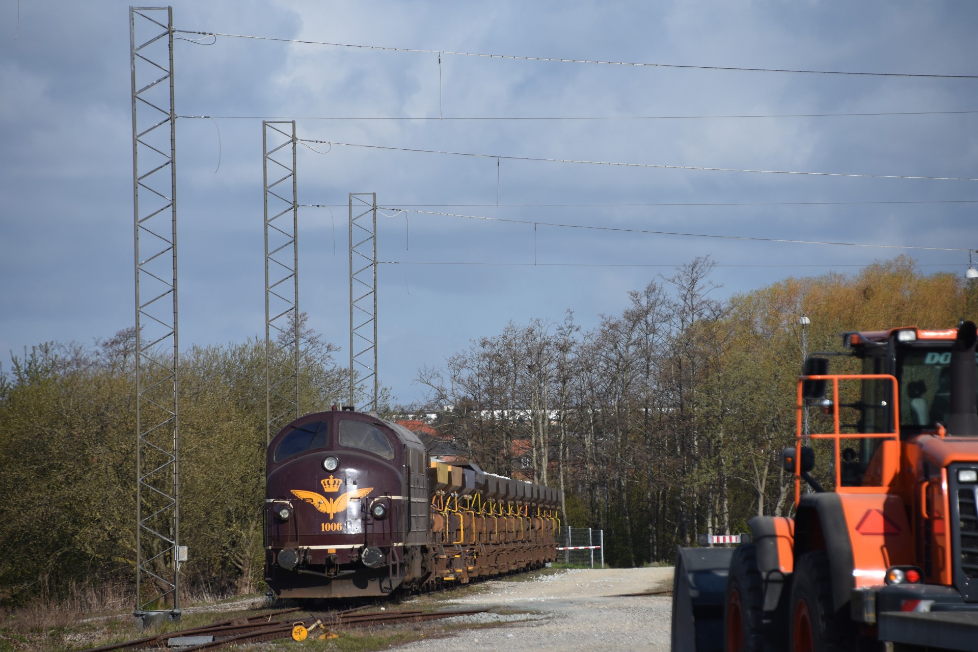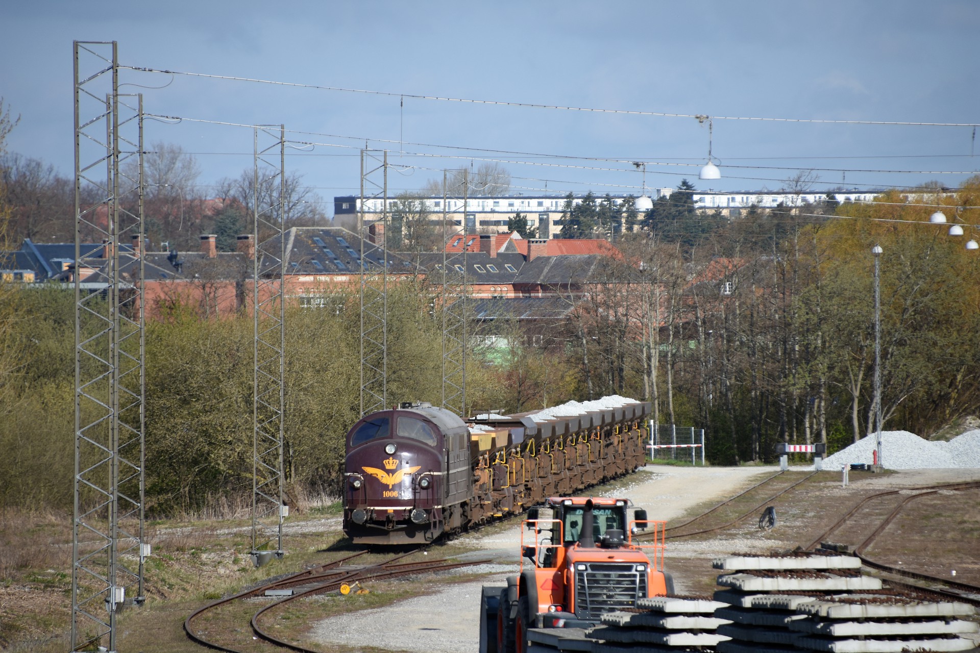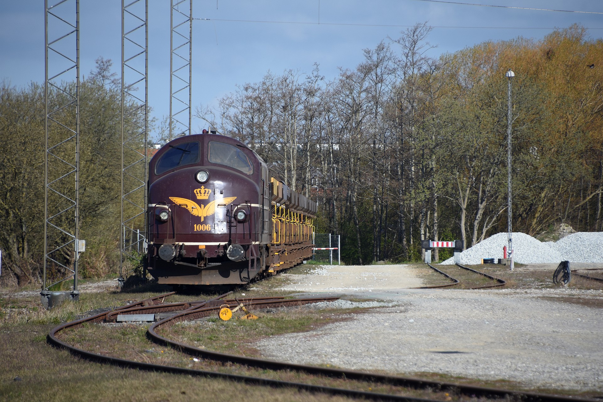 Lørdag den 24. april var jeg et smut forbi Nyborg. Her holdt Contec Rail´s MX 1006 lige så fint og skinnede i solen, med skærver vogne. Der køres for tiden skærver ud på Fyn.