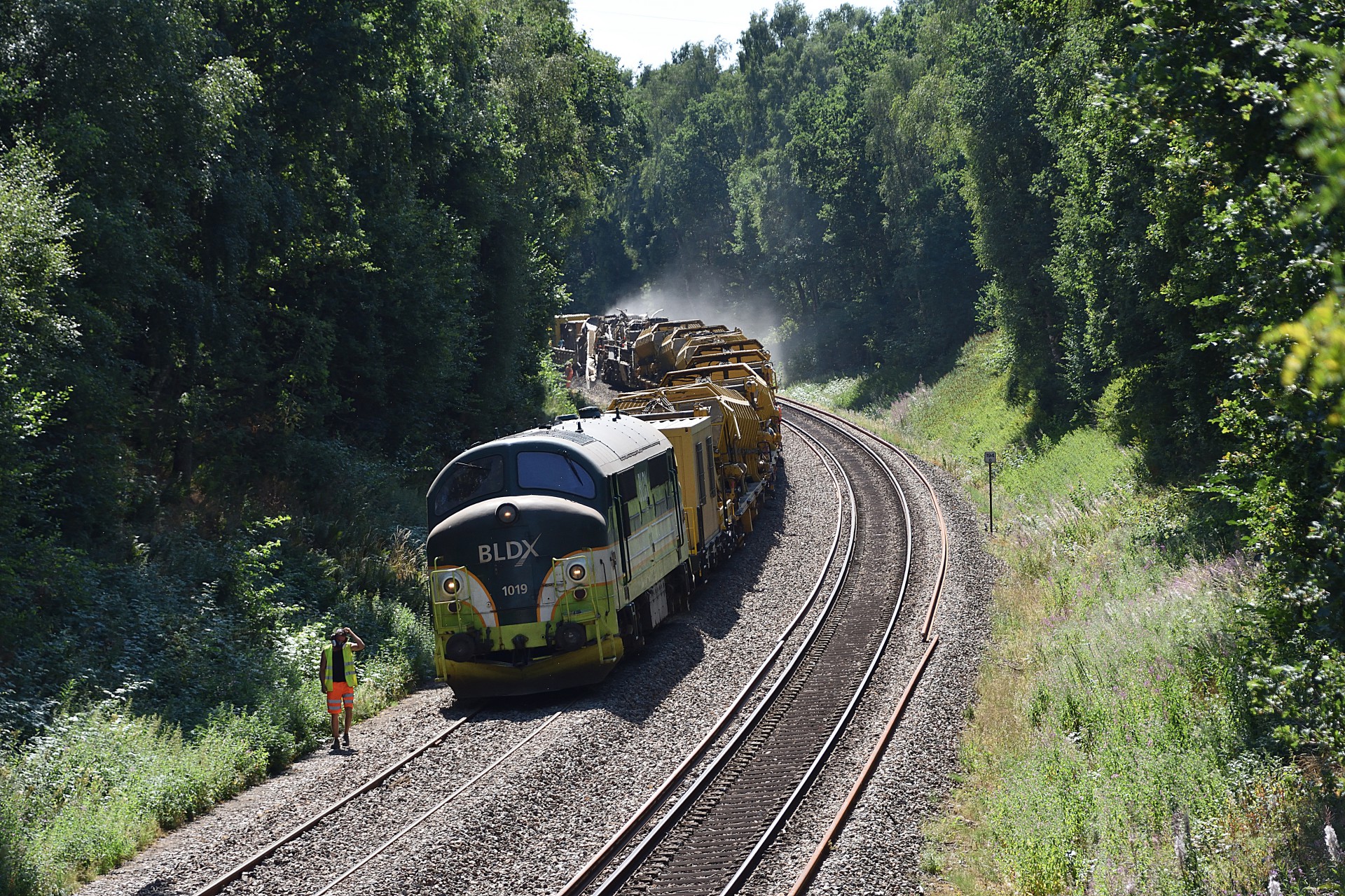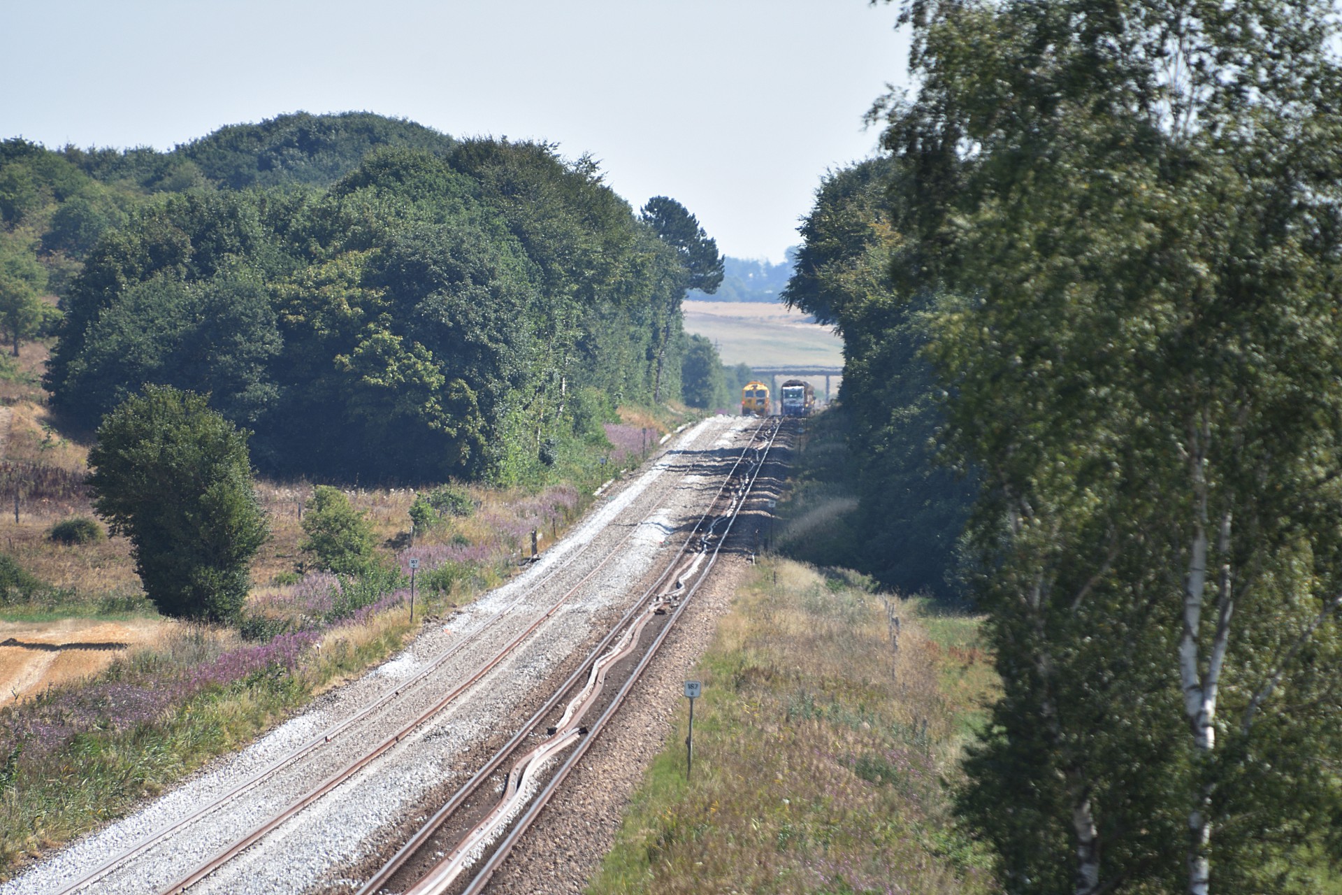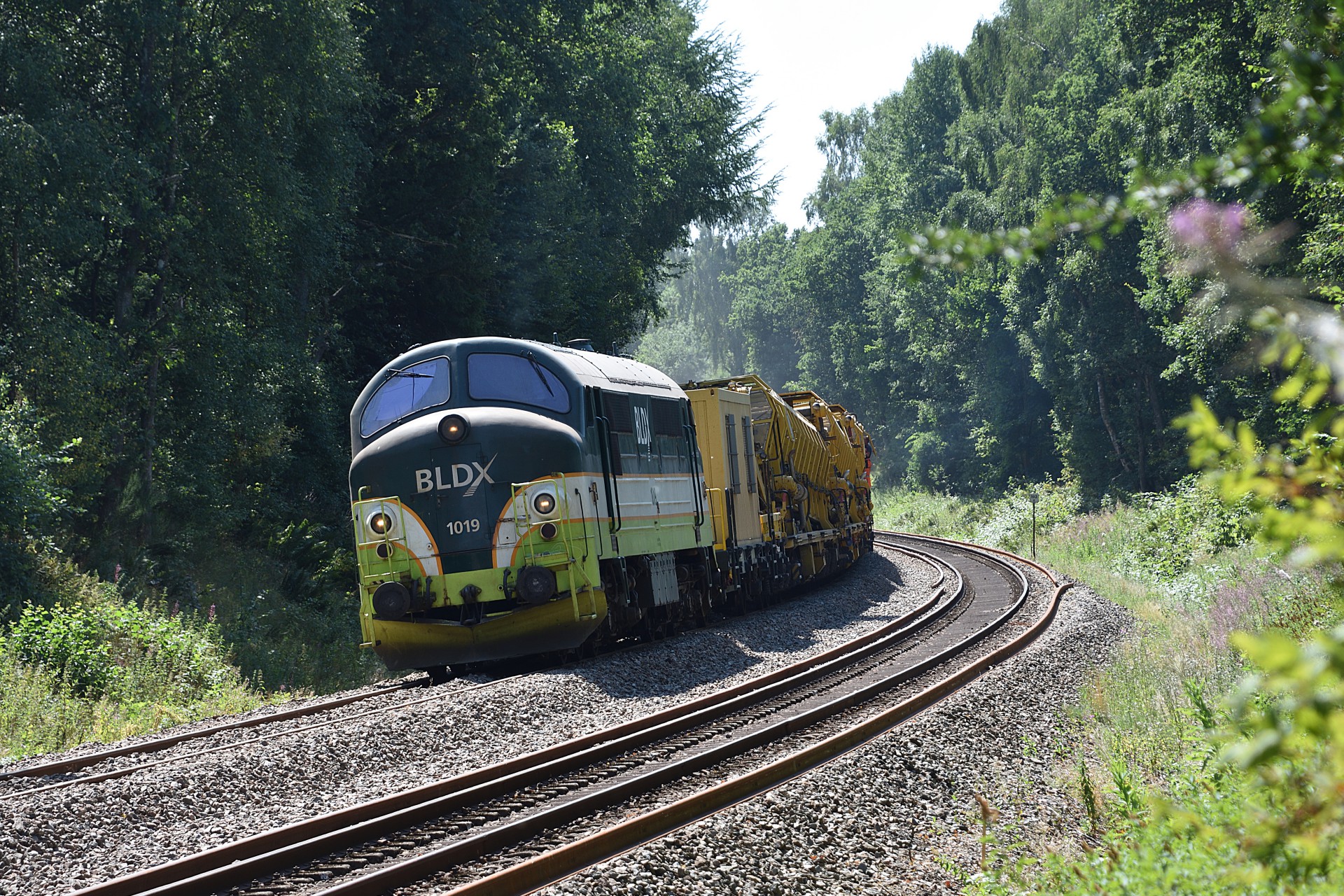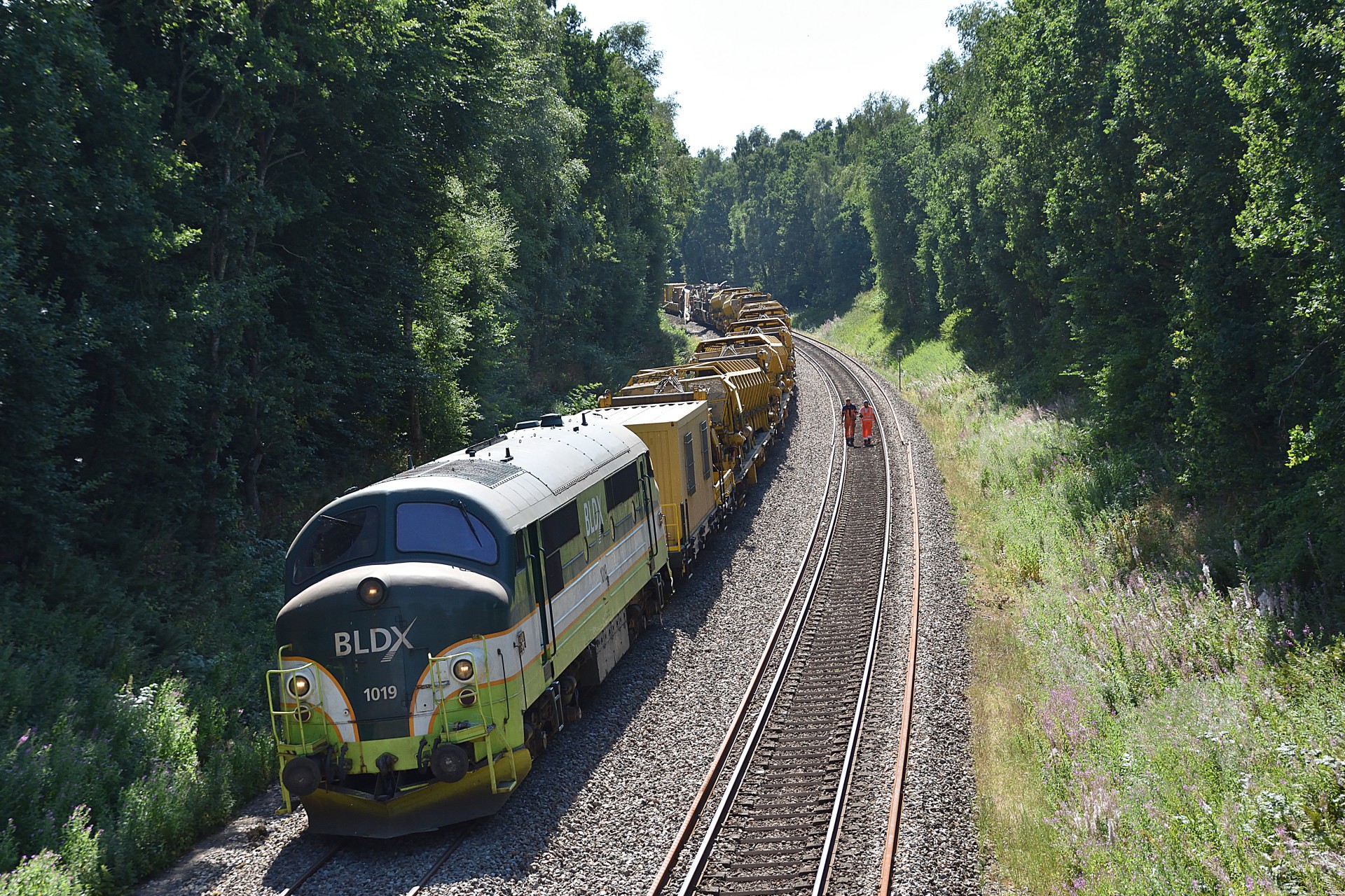 Den 27. juli var jeg endnu en gang et smut nord for Randers, for at se hvor langt man var kommet med sporarbejdet. Sidst jeg var forbi var MX 1019 i gang med ballastrenseren ved Handest, og nu var man så kommet frem til et stykke nord for Sdr. Onsild.