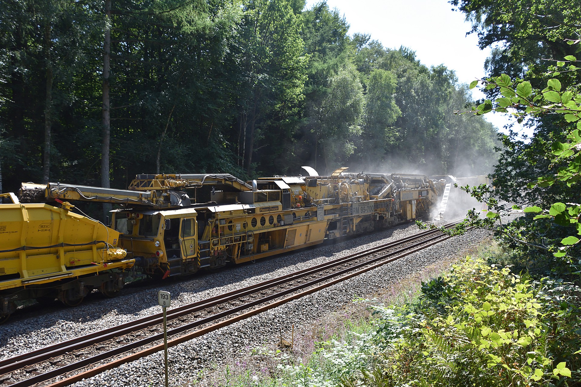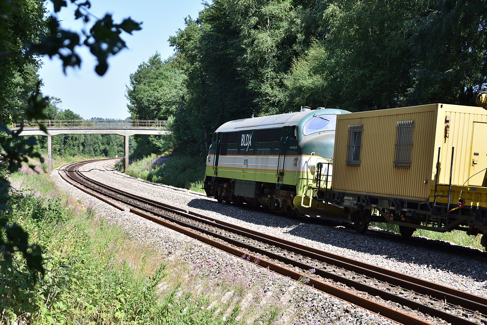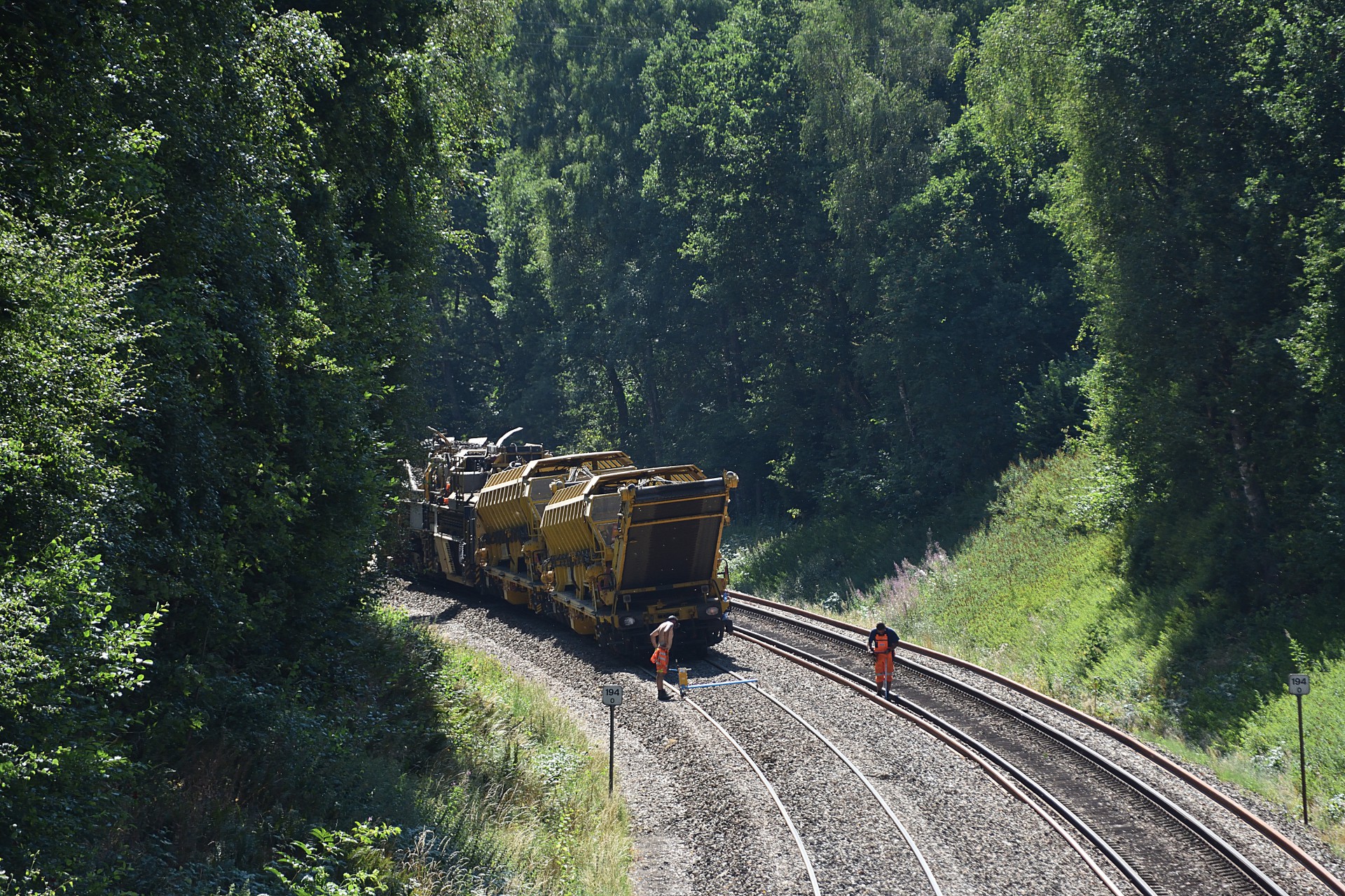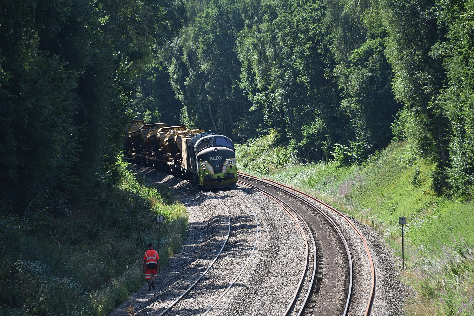 Den 27. juli var jeg endnu en gang et smut nord for Randers, for at se hvor langt man var kommet med sporarbejdet. Sidst jeg var forbi var MX 1019 i gang med ballastrenseren ved Handest, og nu var man så kommet frem til et stykke nord for Sdr. Onsild.