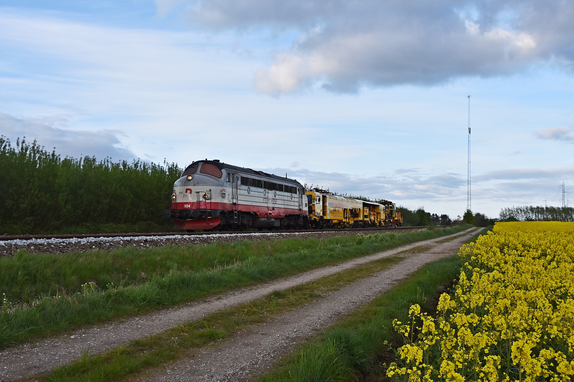 Søndag den 3. maj kørte MY 1134 fra Roskilde med en stoppemaskine samt plov på krogen til Herning. Jeg fik et par billeder af det undervejs, først ved Elmelund, og senere lidt nord for Fredericia.