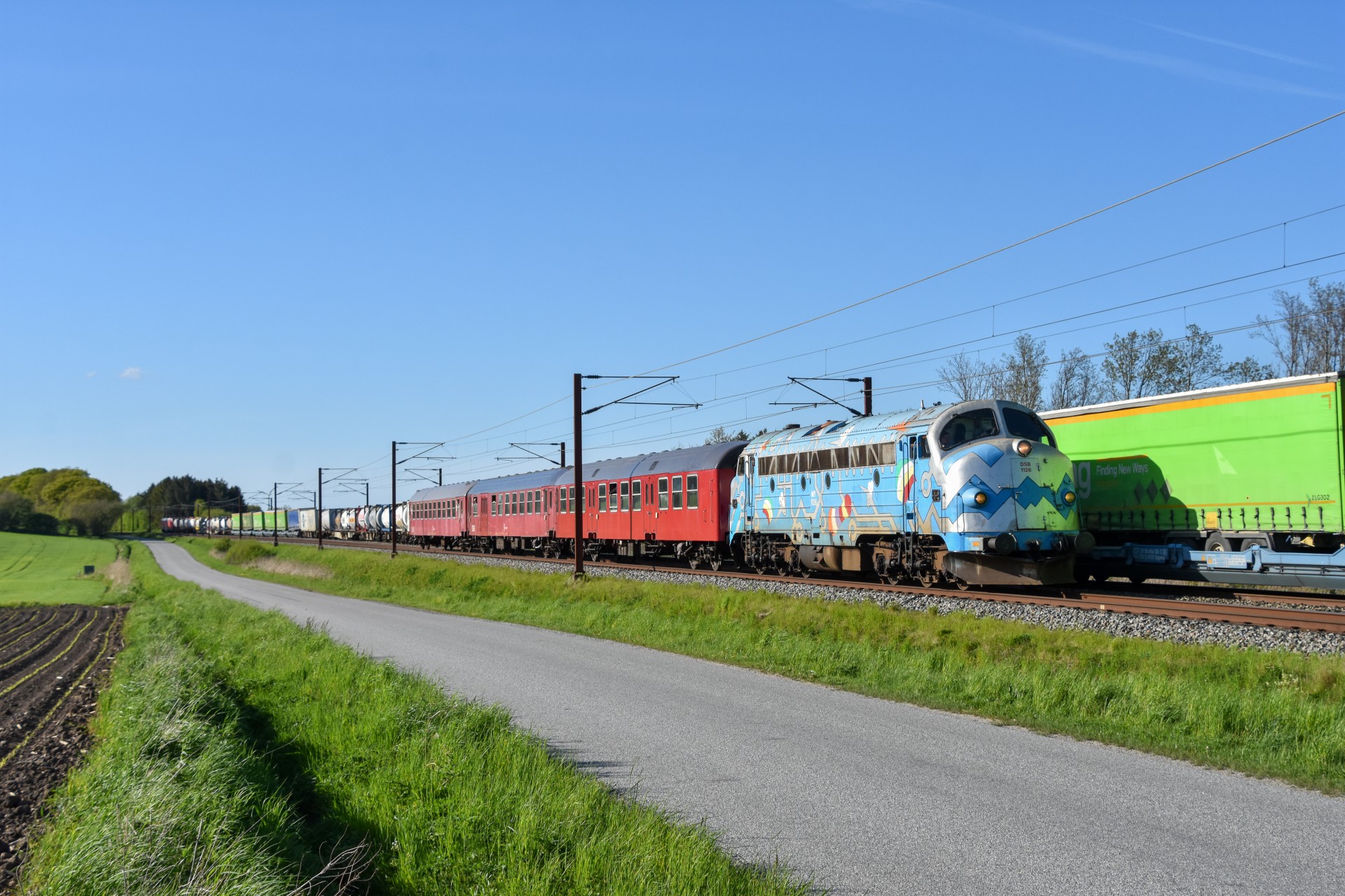 Dagen sluttede af ved Ejby, hvor det sidste billede af MY Veterantog denne dag blev taget. Desværre passerede et vestgående DB Cargo godstog samme tid, så det blev ikke helt optimalt.