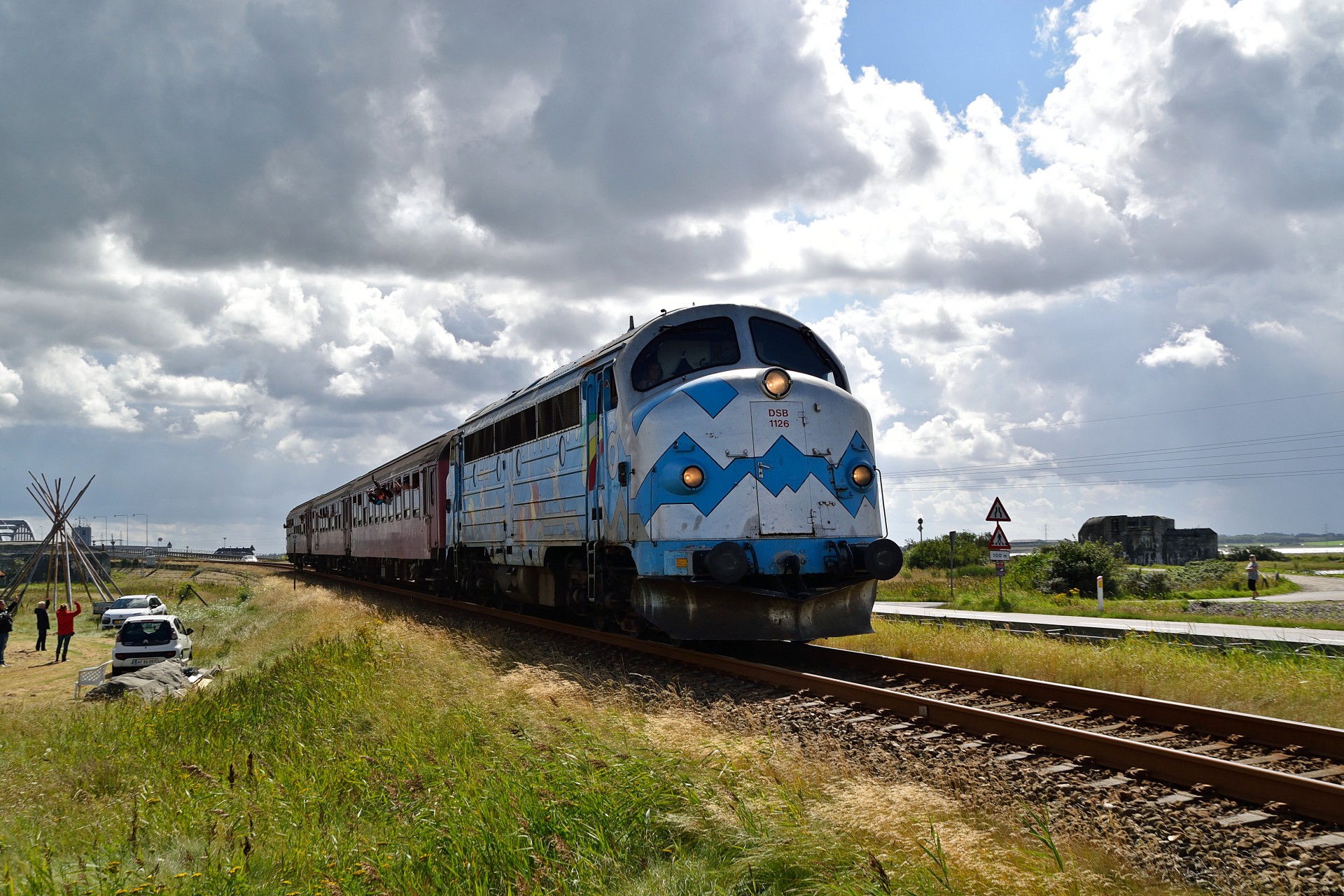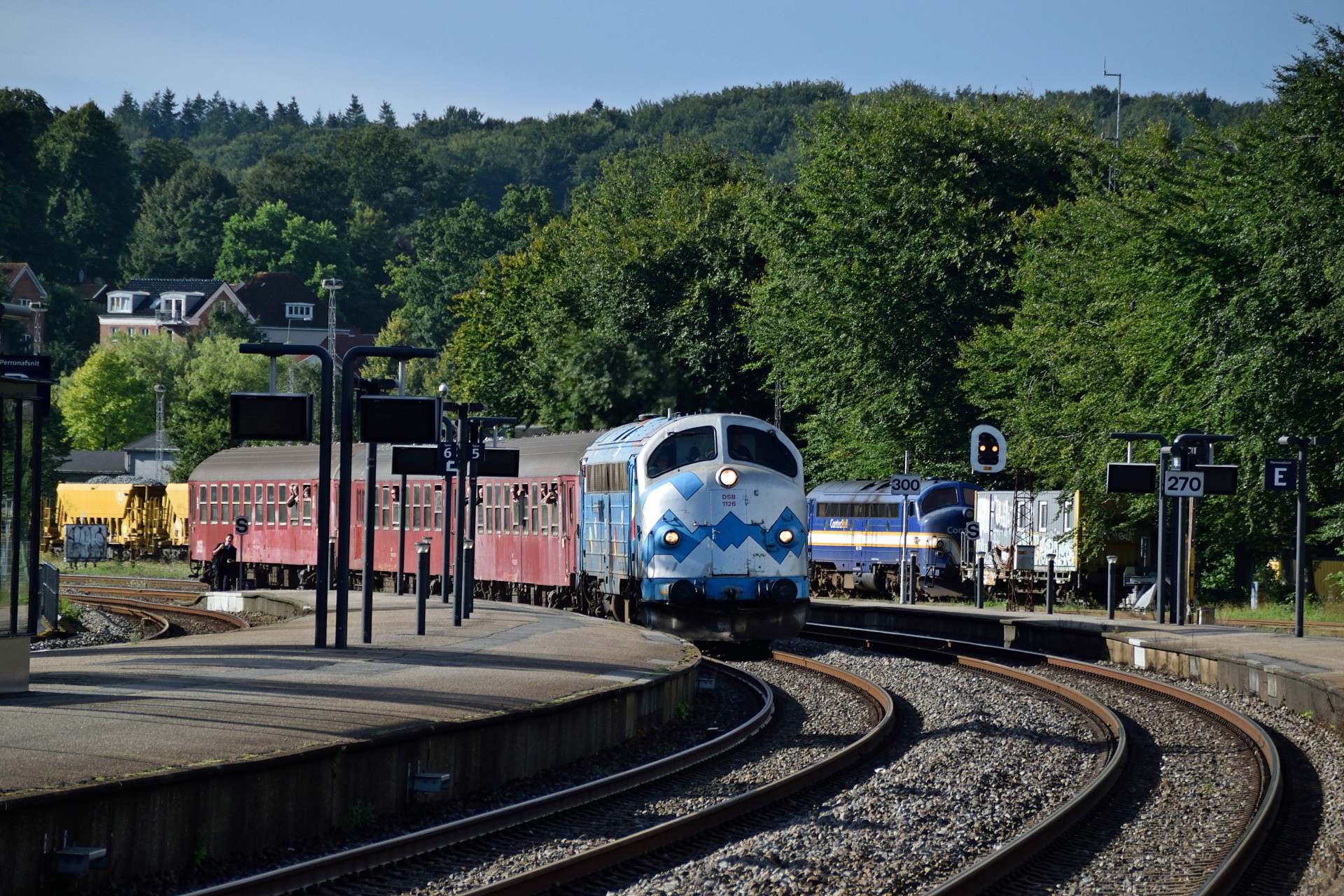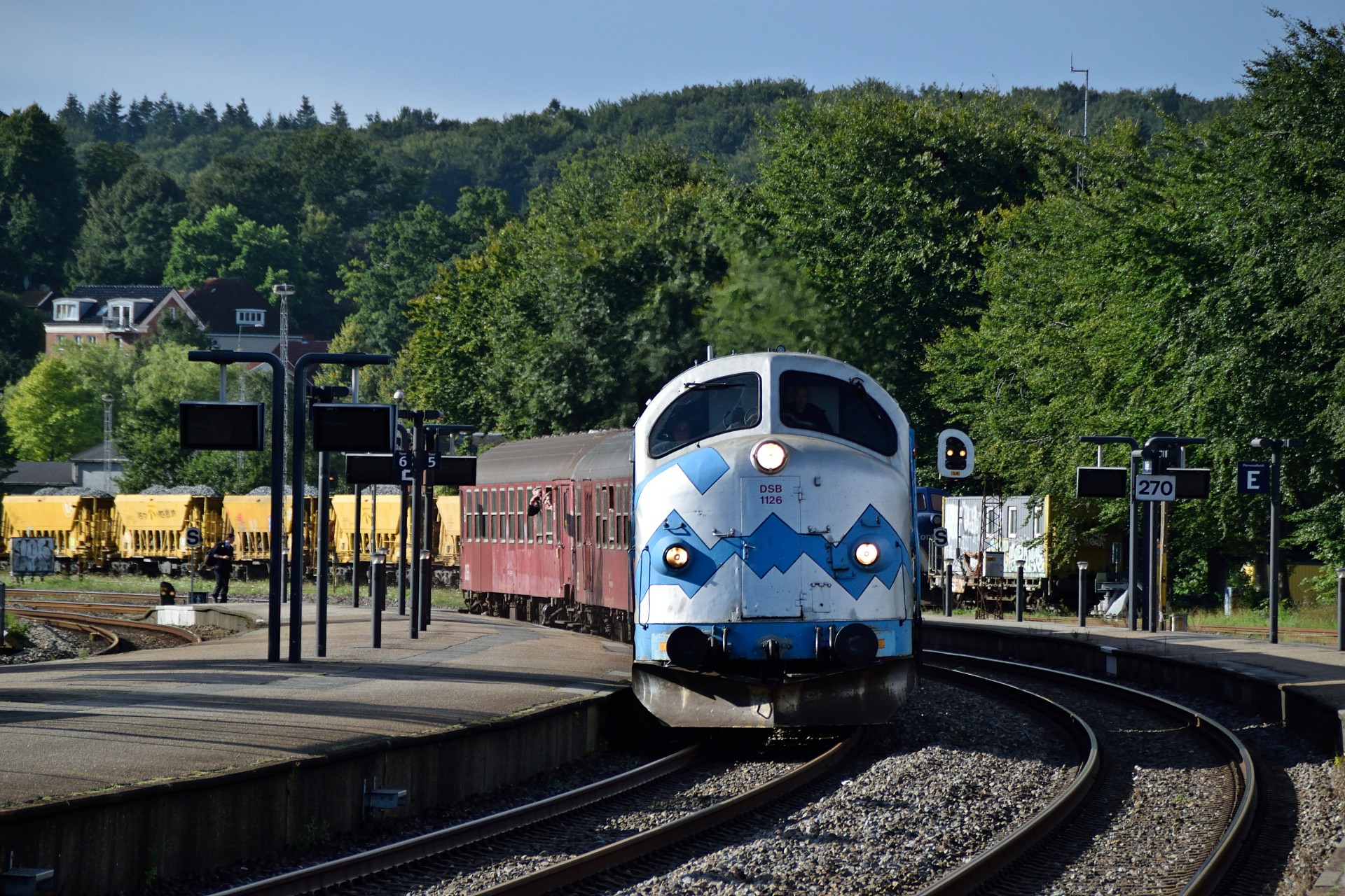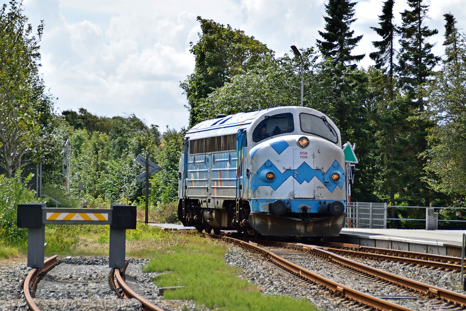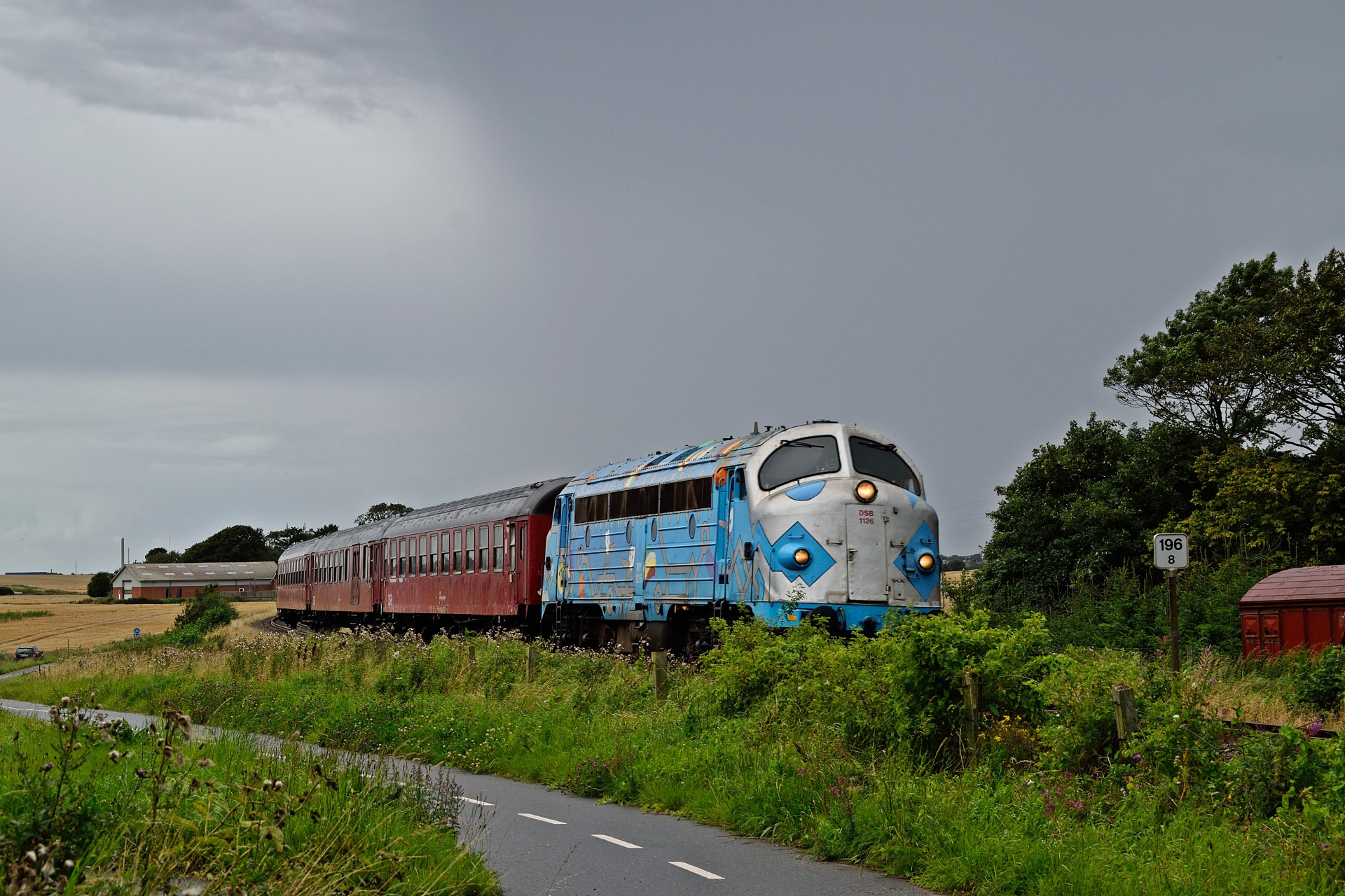 Lørdag den 19. august stod den på Jyllandstur med MY Veterantog, og i år gik turen til Struer, og herefter med mulighed for at køre en tur til Hurup Thy. Da familien og jeg var i sommerhus godt en times kørsel fra Struer i denne weekend, besluttede jeg mig for at køre i bil til Struer, og herefter tage IC Lyn til Vejle. Fra Vejle stod jeg så på MY Veterantog´s tog og som flere af de tidligere Jyllands ture startede rejsen fra Odense, men jeg valgte Vejle da jeg ellers skulle have været endnu tidligere oppe for at nå det. Efter påstigning af toget blev der uddelt den bestilte morgenmad, og det var muligt at købe diverse forplejninger fra salgsvognen. Fra Vejle gik turen så videre til først Herning og senere Holstebro, indtil vi ankom til Struer. Undervejes var det muligt et par gange at komme ud og få et par billeder i kassen, da der skulle laves krydsninger med andre tog på strækningen.