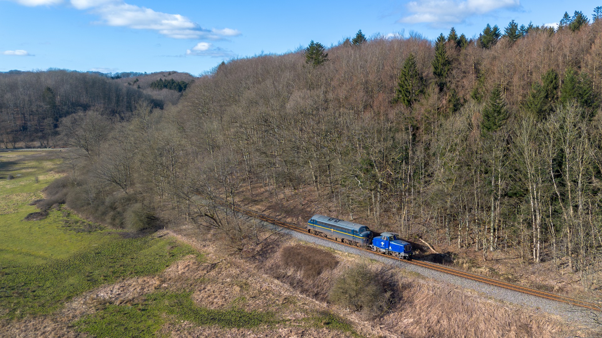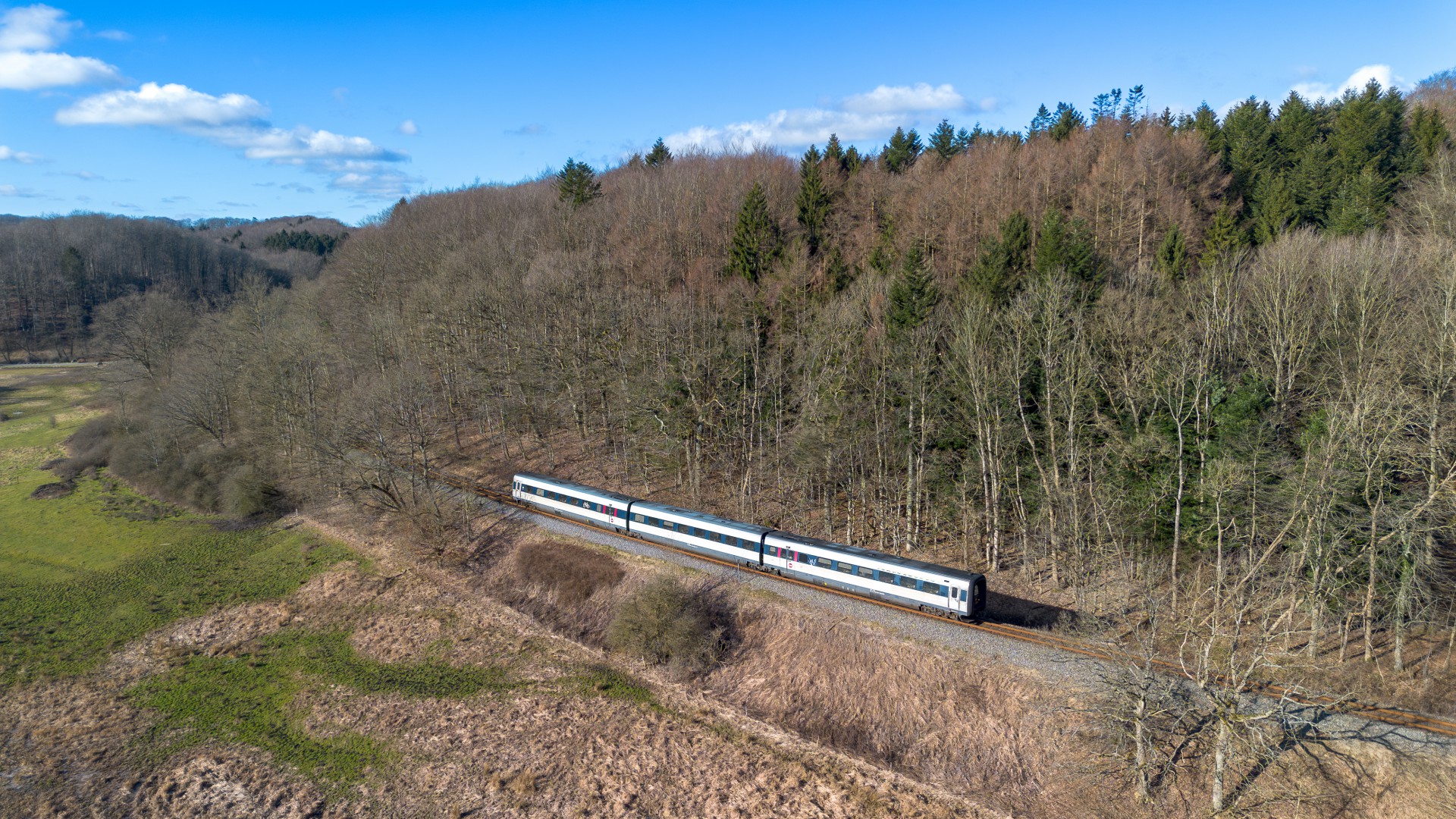 Først et billede fra dronen af Z70 740 + MY 1146 på vej mod Vejle Station. Derefter af et IC3 / MF tog som jeg faktisk syntes ser ganske godt ud i det fine vinter vejr. Og så til noget GM, nemlig DB Cargo med MX 26 (Tørfisken) + MZ 1457 med dagens godstog til Herning/Rønland. Herefter et par billeder af henholdsvis Desiro GoCollective i Grejsdalen samt Lint GoCollective mellem Studsgård og Kibæk.
