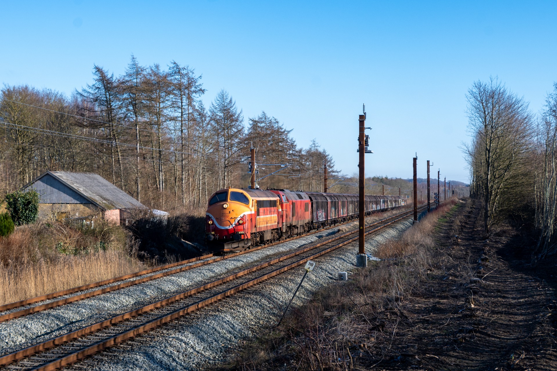 Onsdag den 19. februar var jeg igen en tur ude om eftermiddagen da DB Cargo kørte med Tørfisken + MZ 1457 med dagens godstog til Aalborg Østhavn. Jeg valgte at filme toget ankommer til Aarhus(Ingen billeder her fra, da det er stærkt modlys), og herefter kørte jeg lidt uden for Brabrand, hvor banen går langs DSB nye værksted som er under opbygning. Her er der blevet fældet nogle træer, så stedet er blevet ganske nogen lunde faktisk.
