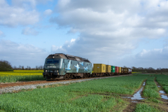 Derefter kørte jeg til Skjern station, og afventede toget skulle komme her til. Det blev til et enkelt billede her fra. Derefter kørte jeg jeg lidt nord for Skjern, hvor det blev til et par fine billeder af toget vej videre hvor solen kiggede frem. Så gik turen videre mod Ulfborg, hvor det også lige lykkes at nå frem til, da der her skulle krydses med en af Midtjyske Jernbaners Desiro tog. Efter dette kørte jeg til lidt uden for Bækmarksbro, hvor det blev til et fint billede med en rapsmark i blomst som baggrund.