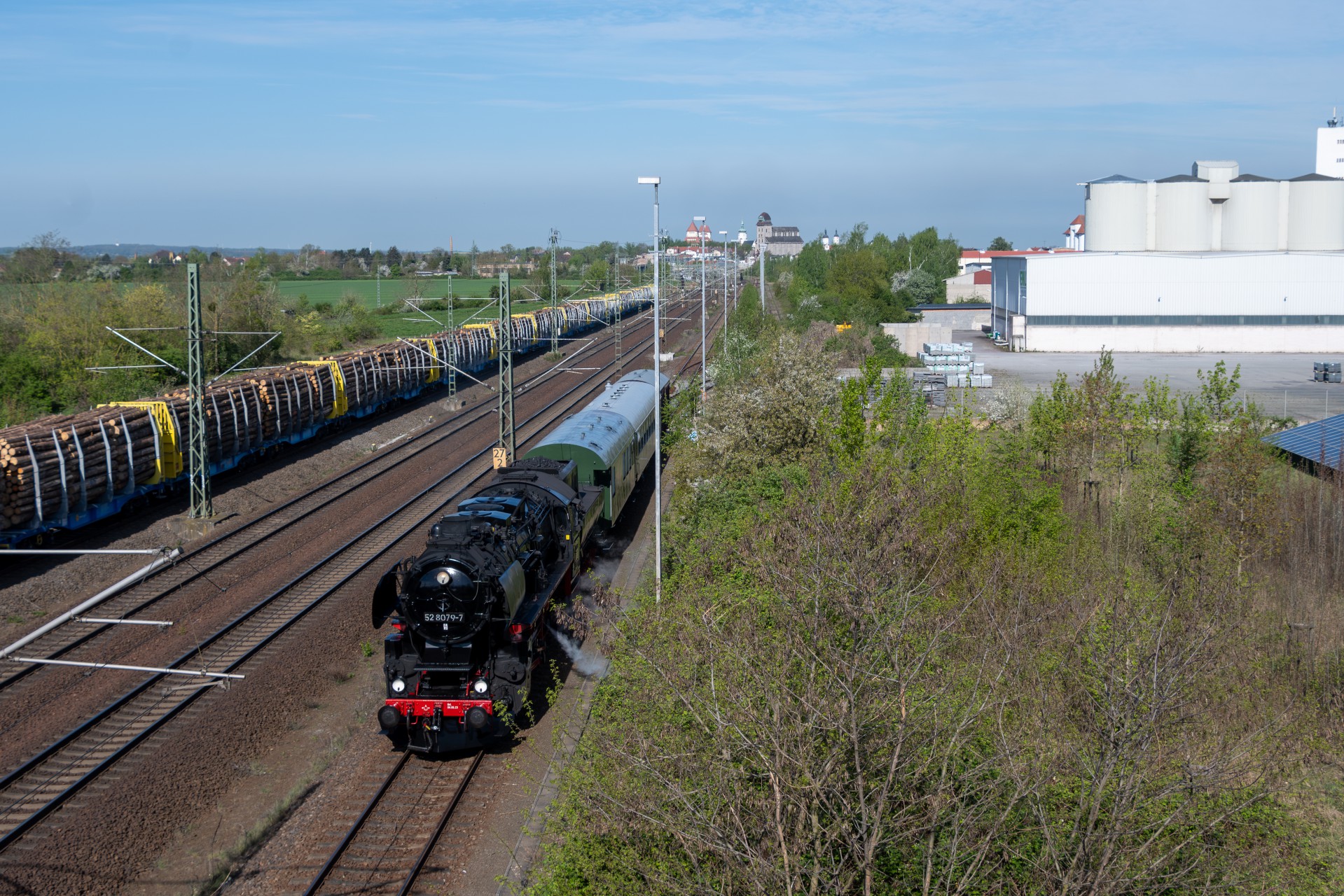 Her passerede 52 8079-7 en flod på en dog lidt nyere jernbanebro. Der skulle afsættes en fladvogn i udkanten af Wurzen mod øst, så der var et ophold på ca. 30 minutter, hvilket gjorde der også blev til billeder af da de satte i gang igen. Der efter kørte jeg til lidt efter Oschatz, og håbede på jeg var kommet foran toget igen – det var jeg heldigvis, og toget passerede forbi med en fin raps mark i forgrund/baggrund. Så gik turen ellers mere øst på, og jeg fik igen et par billeder af toget nord for Weinböhla.