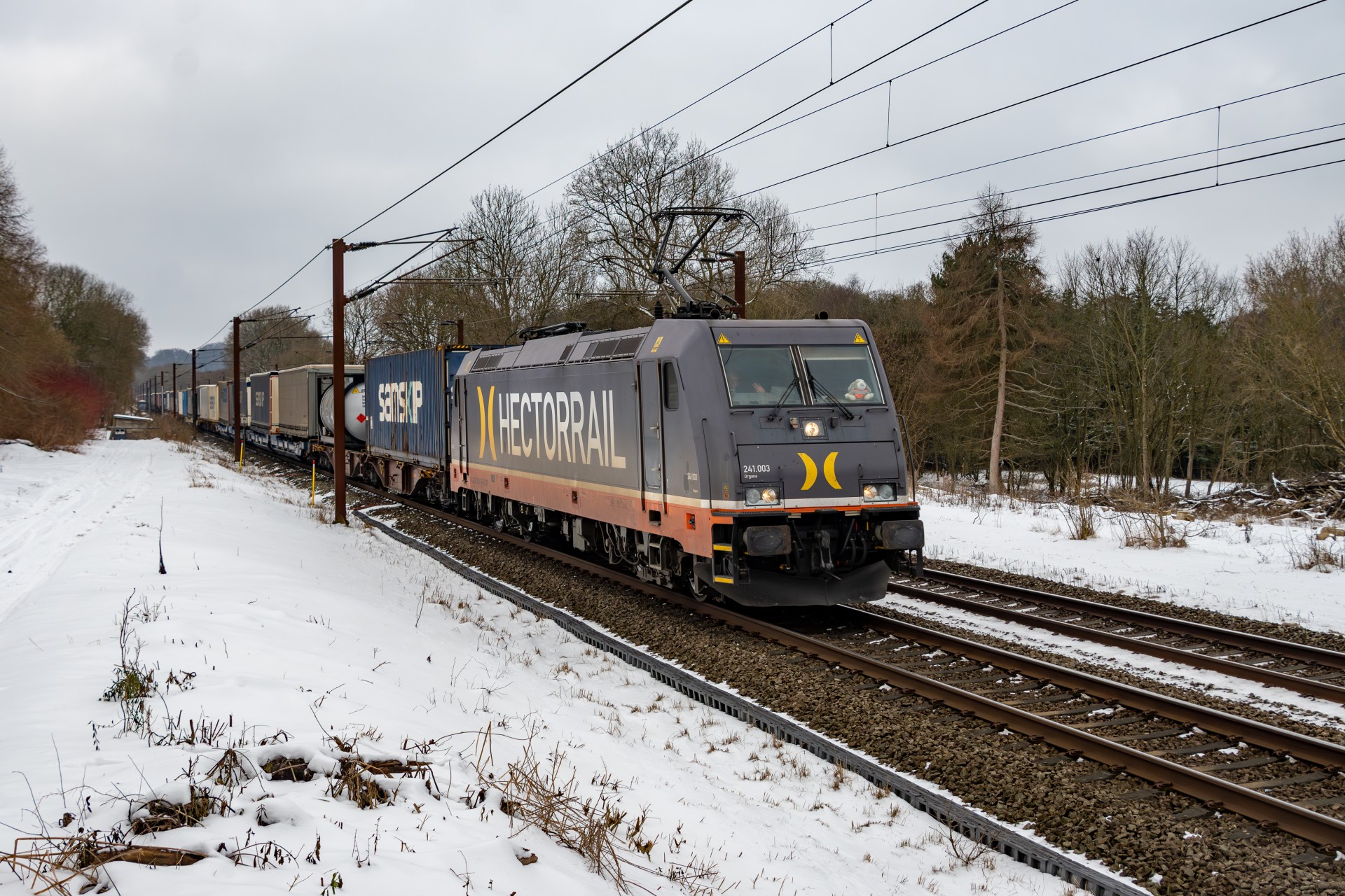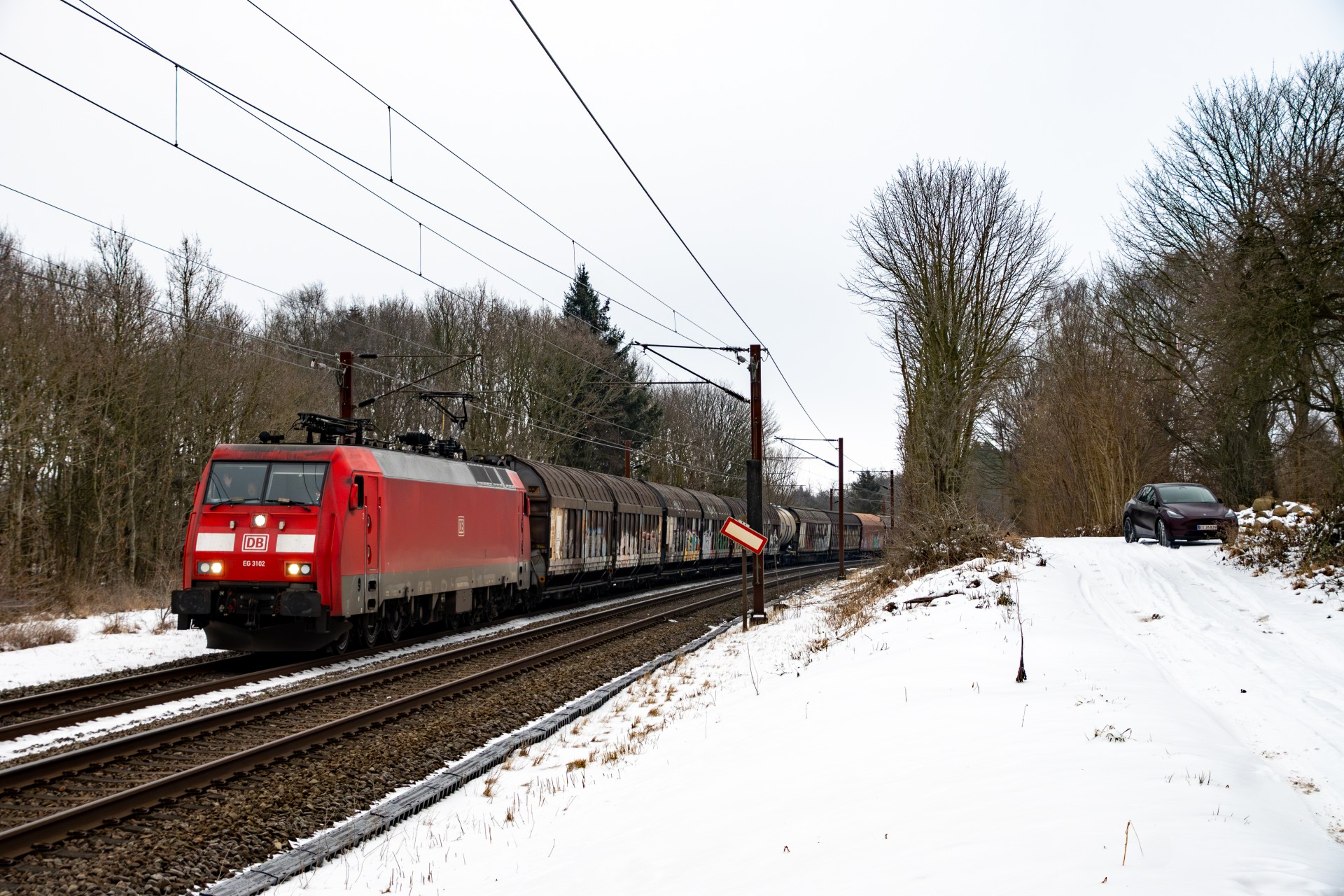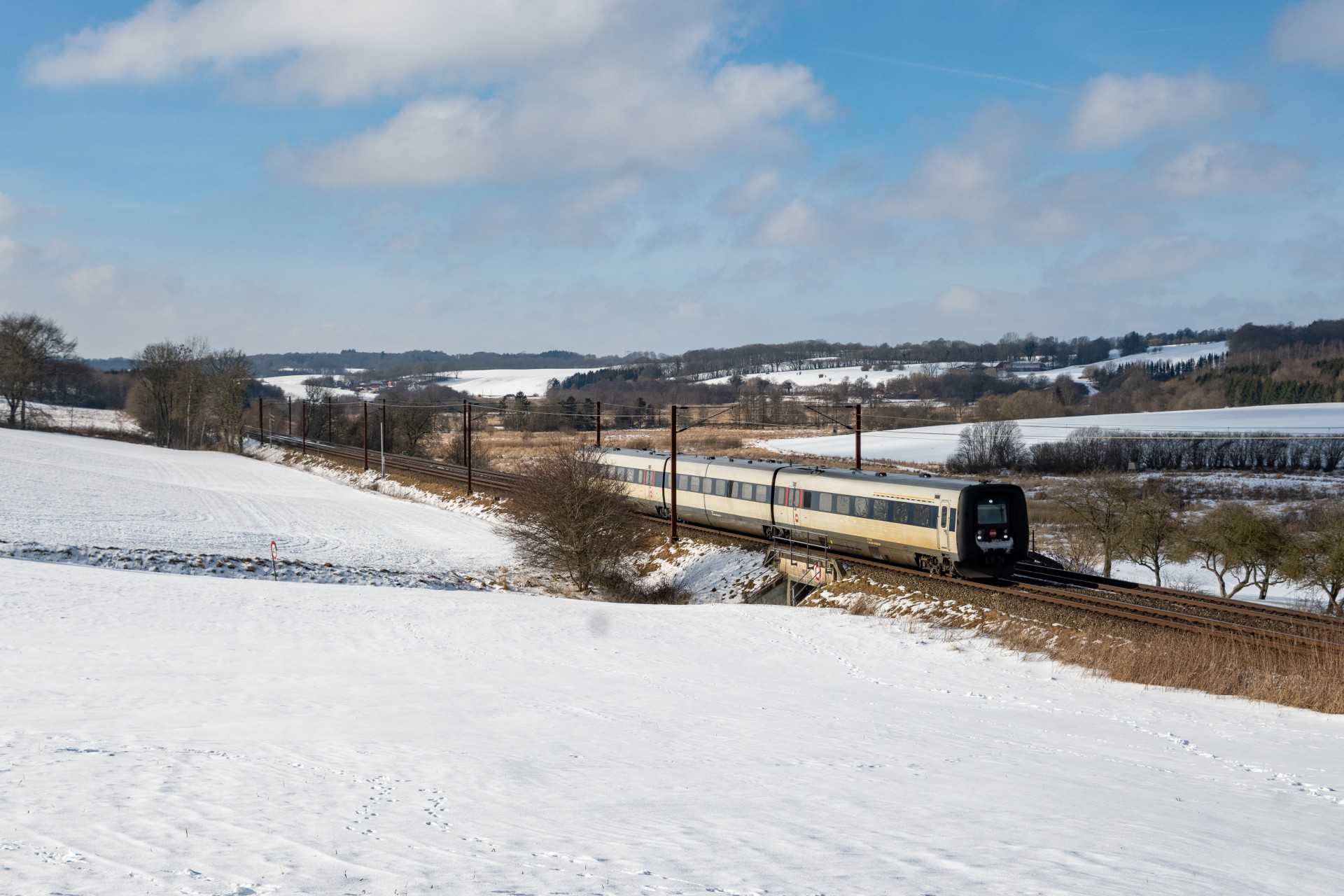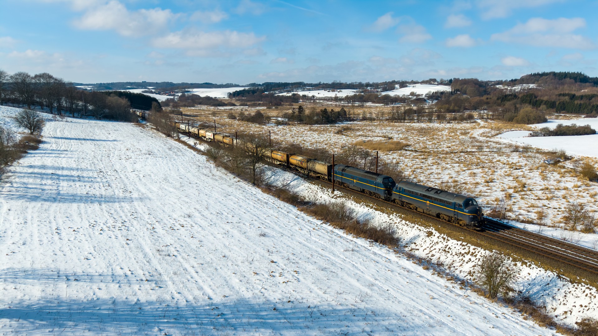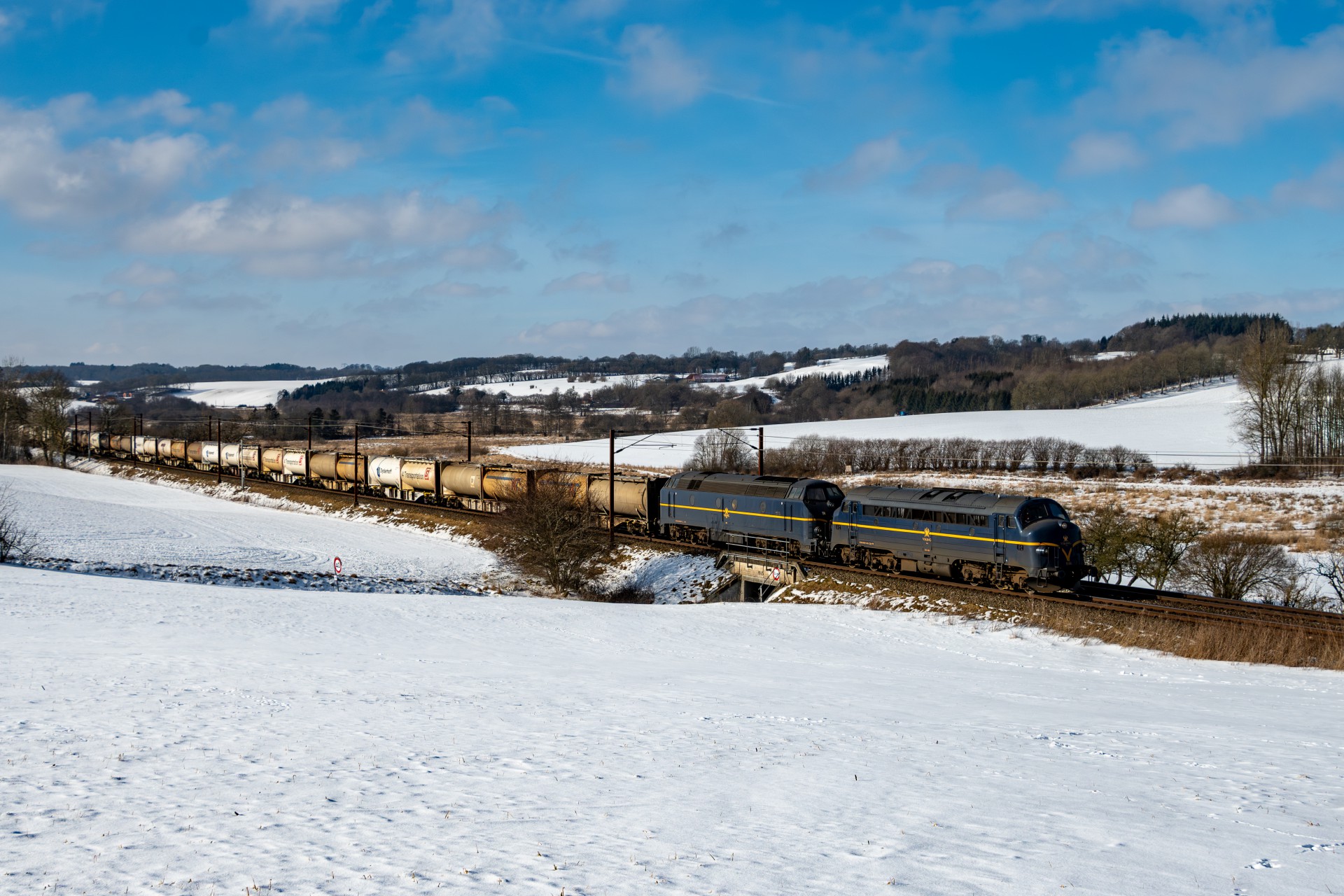 Torsdag den 19. februar var jeg taget ned til Kolding, nærmere bestemt ved Eltang, hvor det efter hånden er ved at være lang tid siden jeg har været forbi. Her brugte jeg det meste af formiddagen i at fotografere hvad der passerede af godstog (hovedsageligt), og efter sol klokken nærmere sig 12, så blev vejret også ganske flot og jeg rykkede til den klassiske foto lokation ved Gudsø, hvor MY 1146 + 1831 ses passere forbi med Cementtoget.